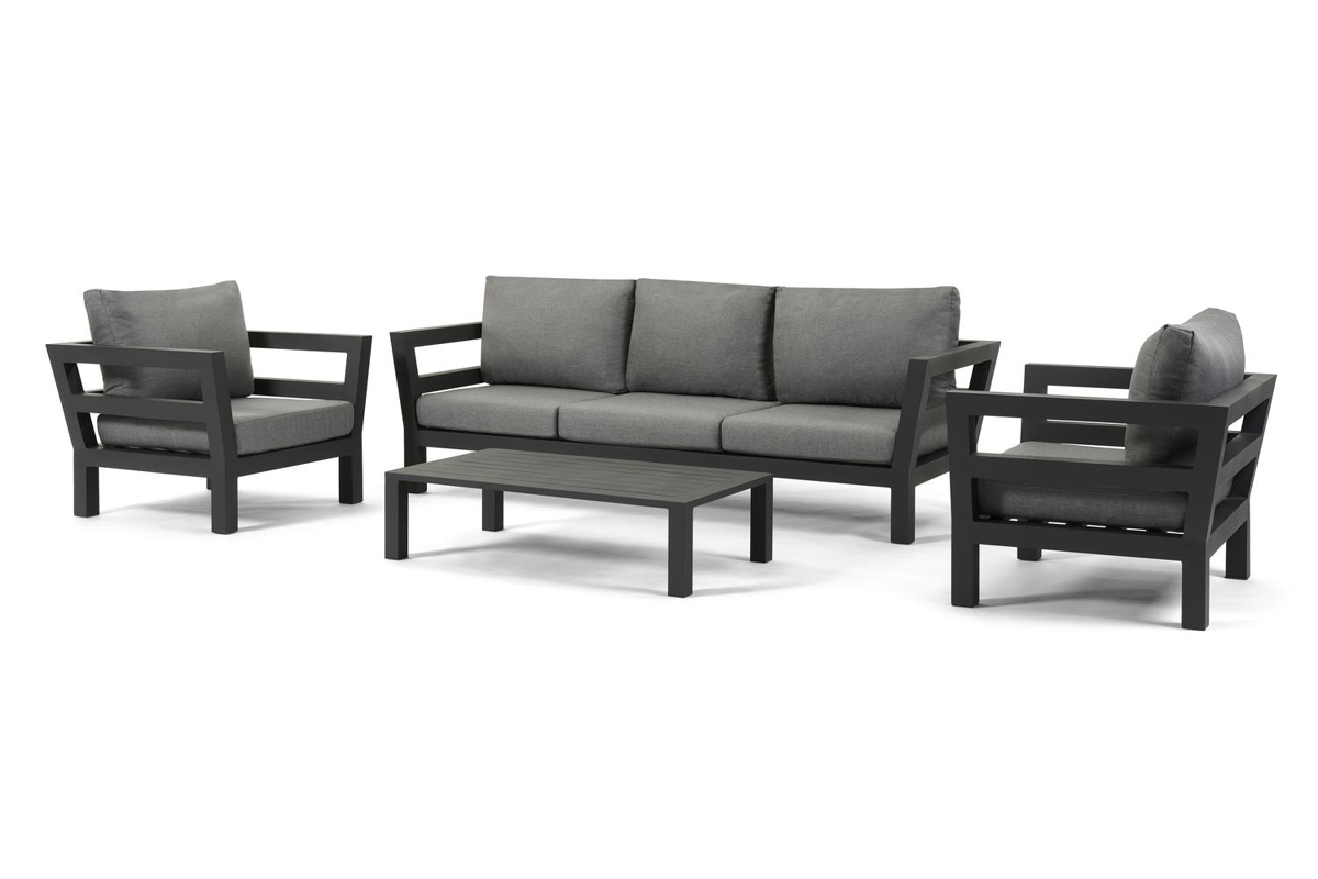 De loungetafel is inbegrepen en volledig gemaakt uit roestvrij aluminium.