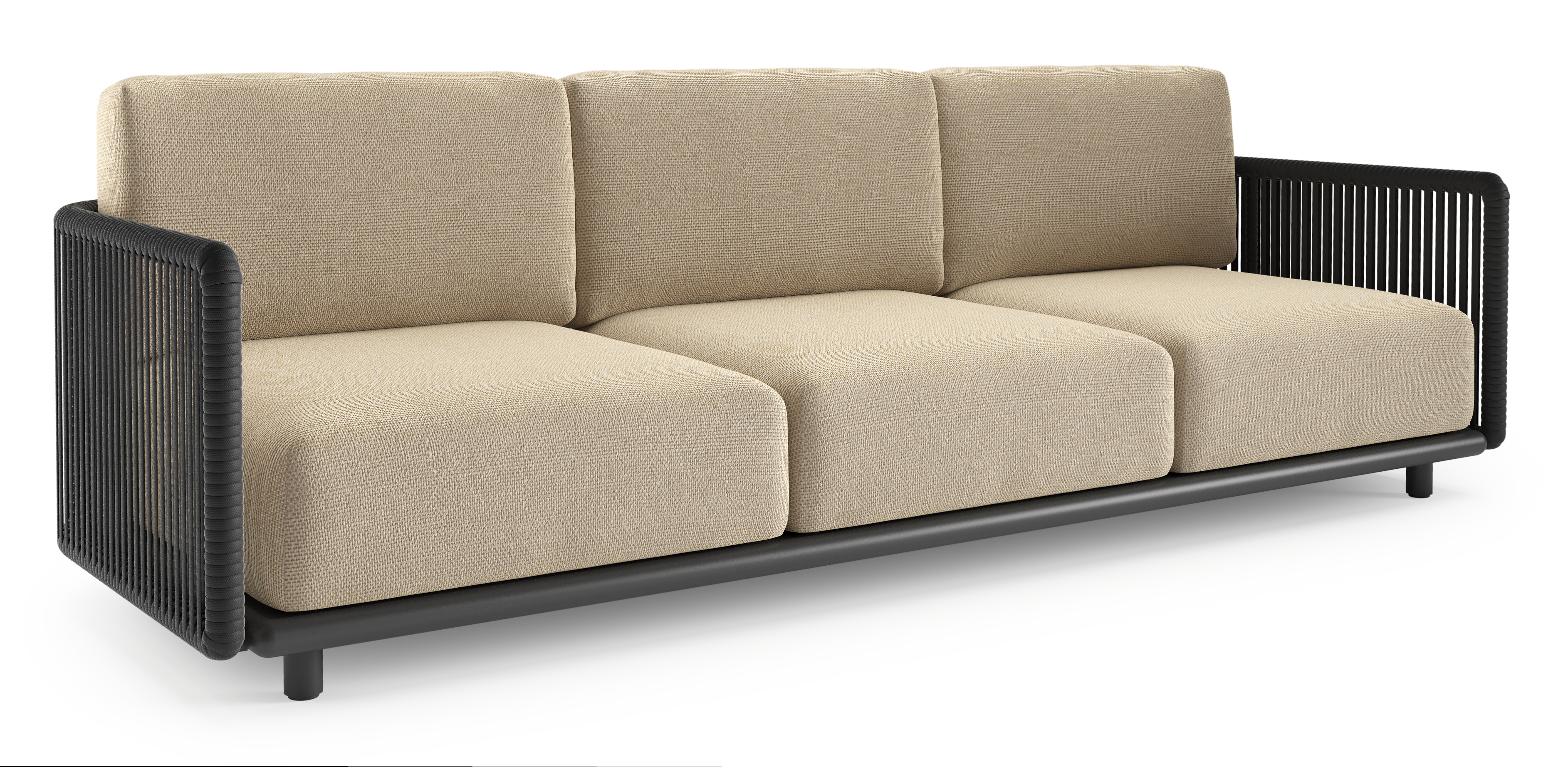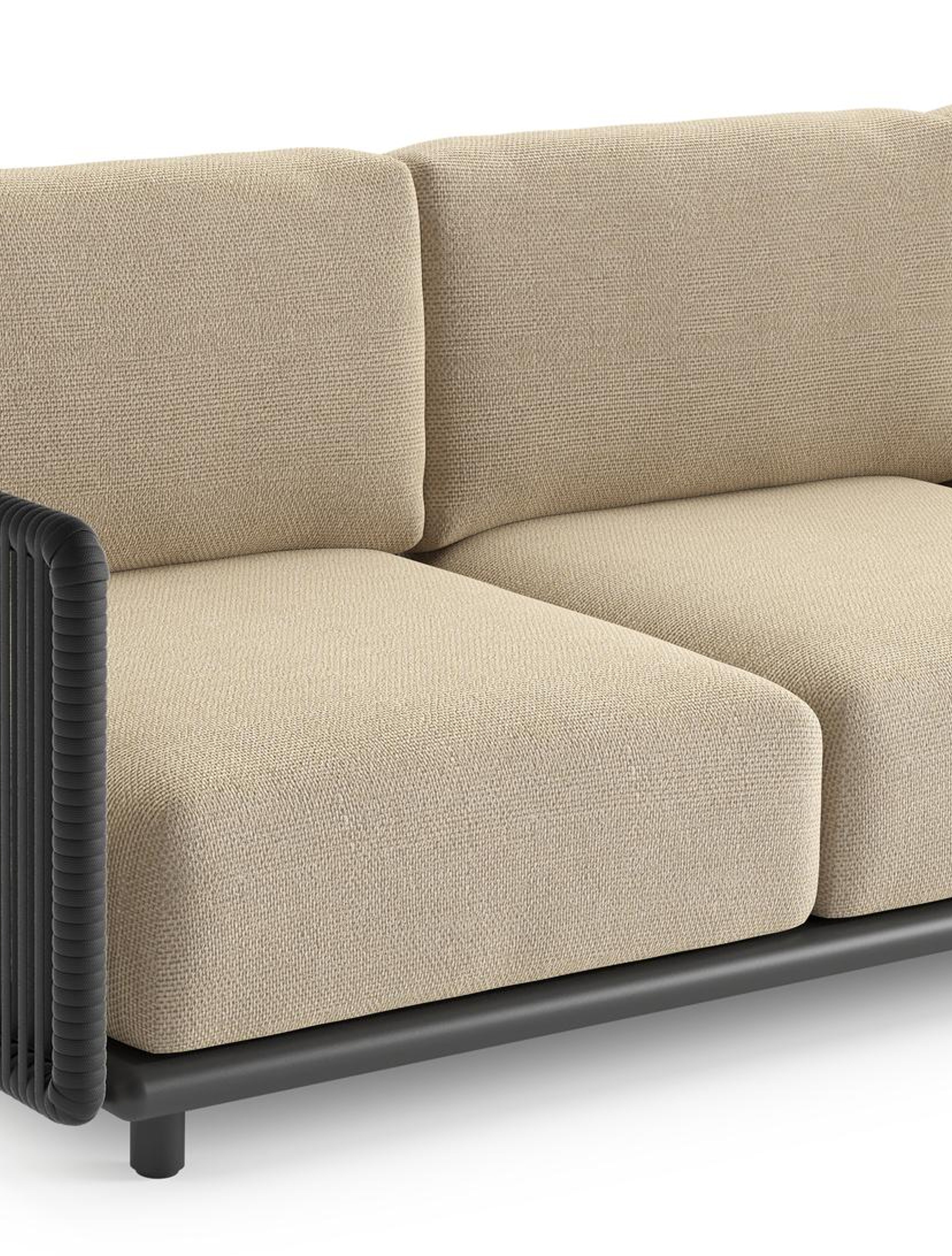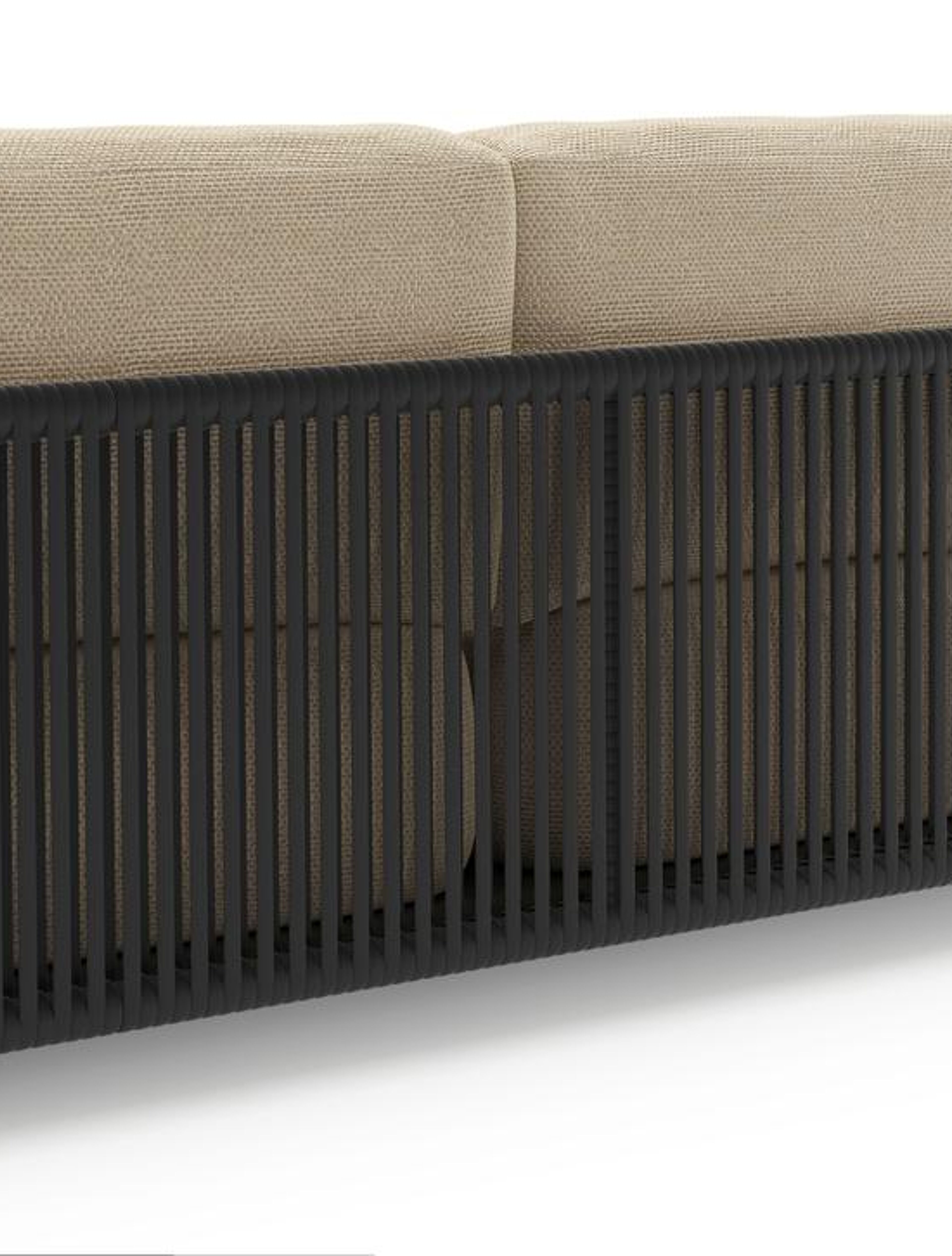 Organo loungebank in zwart aluminium en zwart verticaal geweven luxe vlakke rope met althea camel all weather Cosytica kussen | Exterioo tuinmeubelen