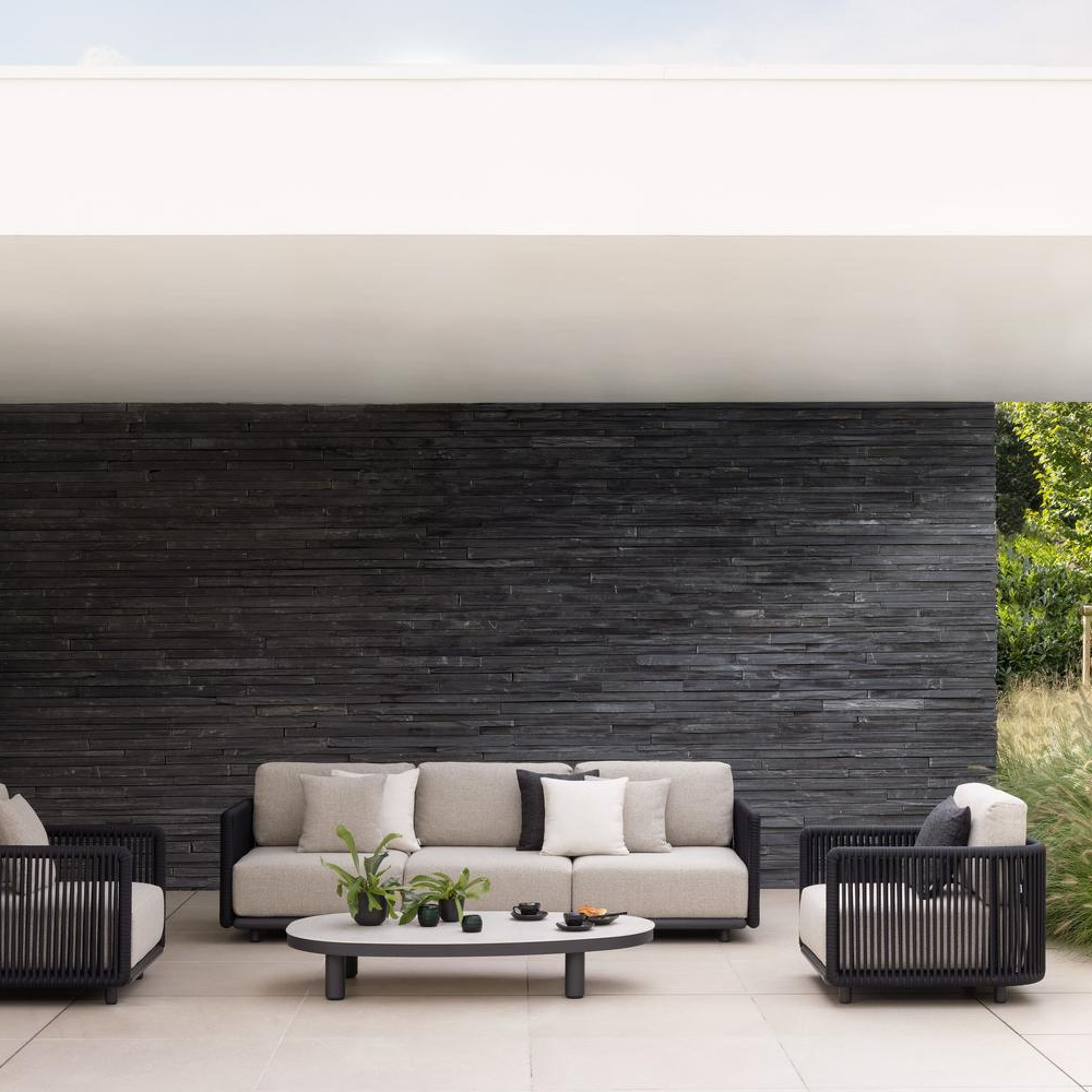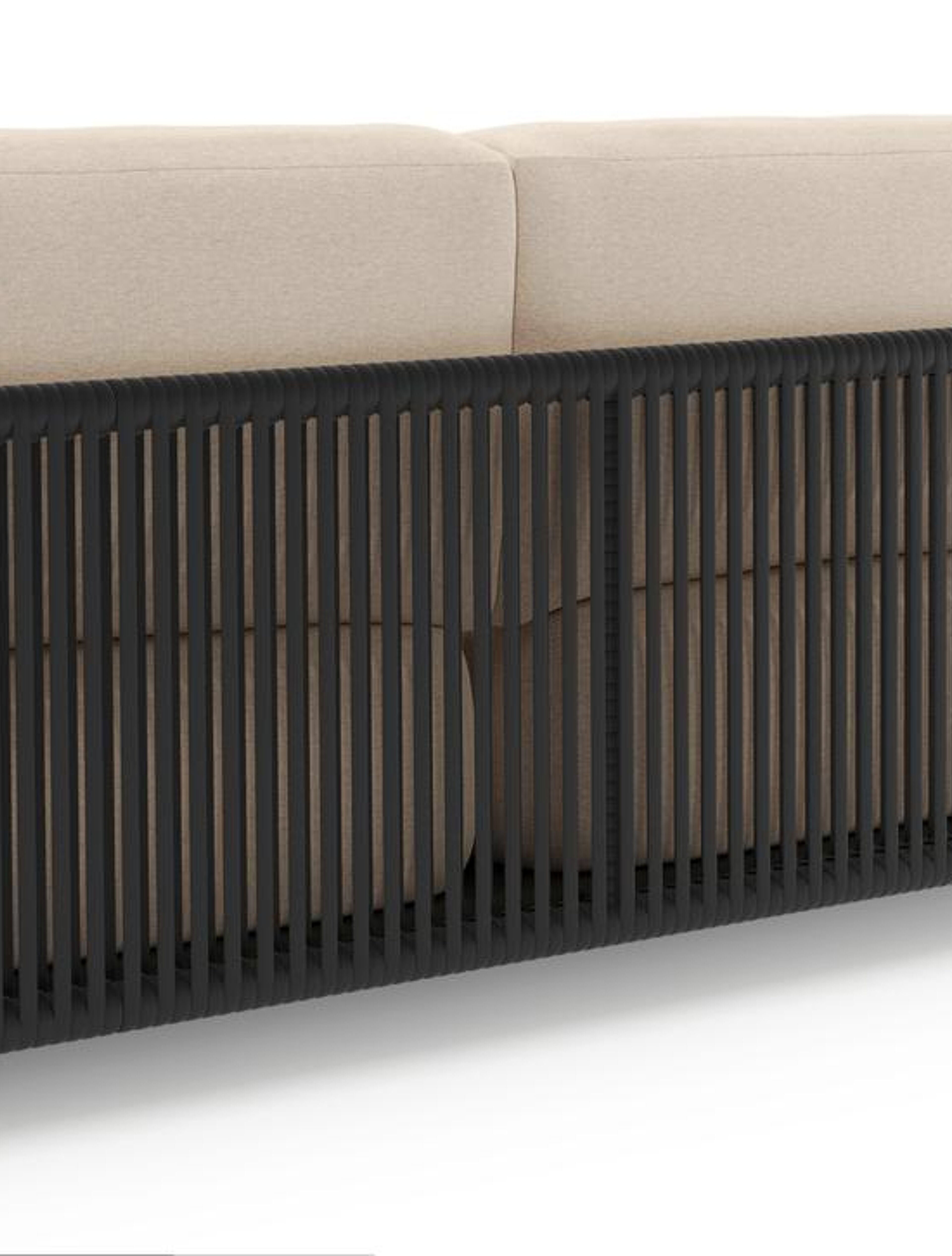 Organo loungebank in zwart aluminium en zwart verticaal geweven luxe vlakke rope met heritage papyrus all weather Sunbrella® luxe kussen | Exterioo tuinmeubelen