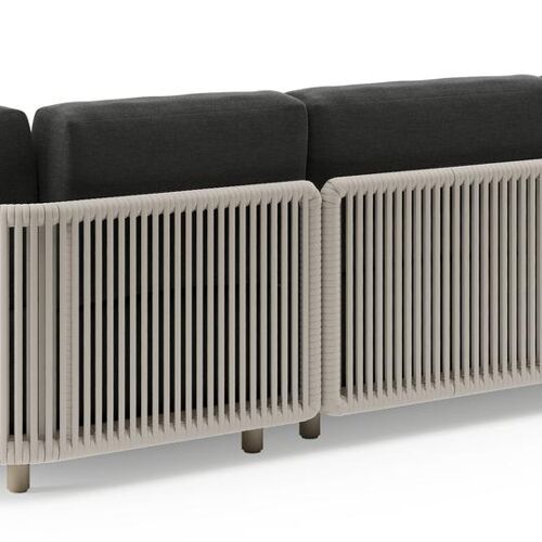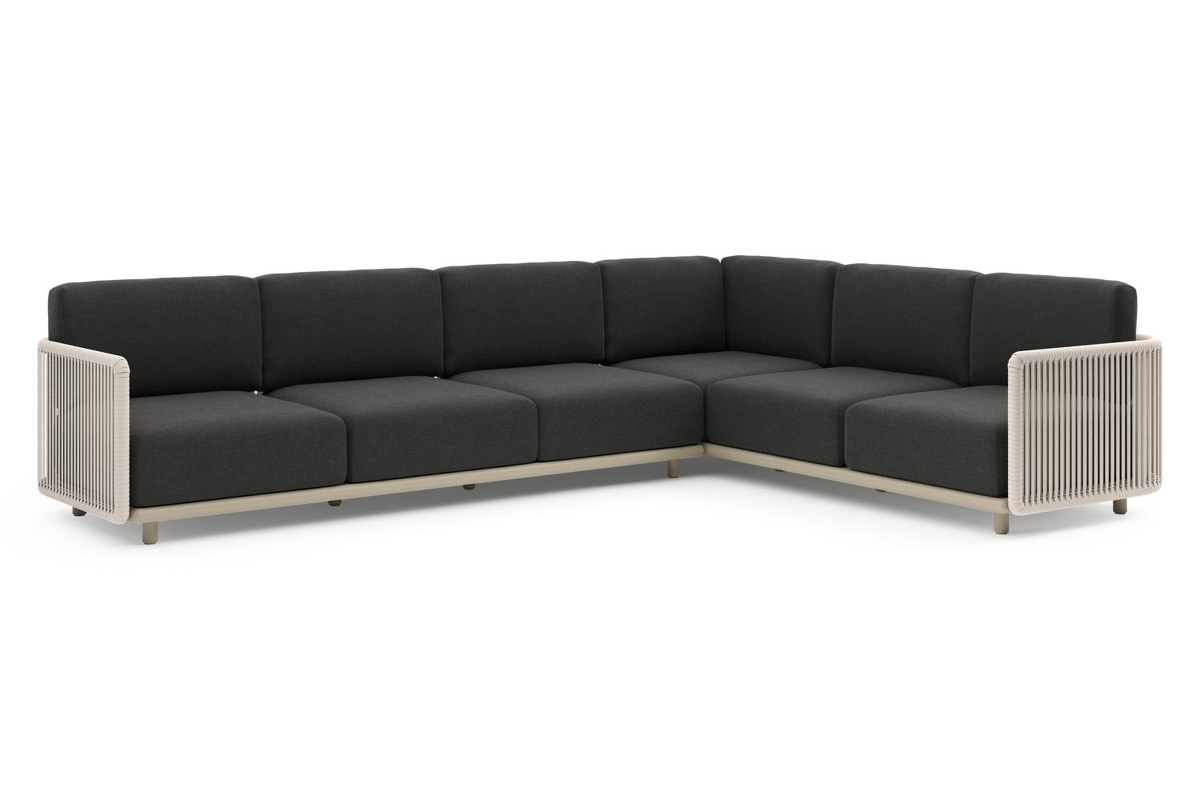 Organo loungehoek in beige aluminium en beige verticaal geweven luxe vlakke rope met chartres sooty all weather sunbrella® luxe kussens | Exterioo