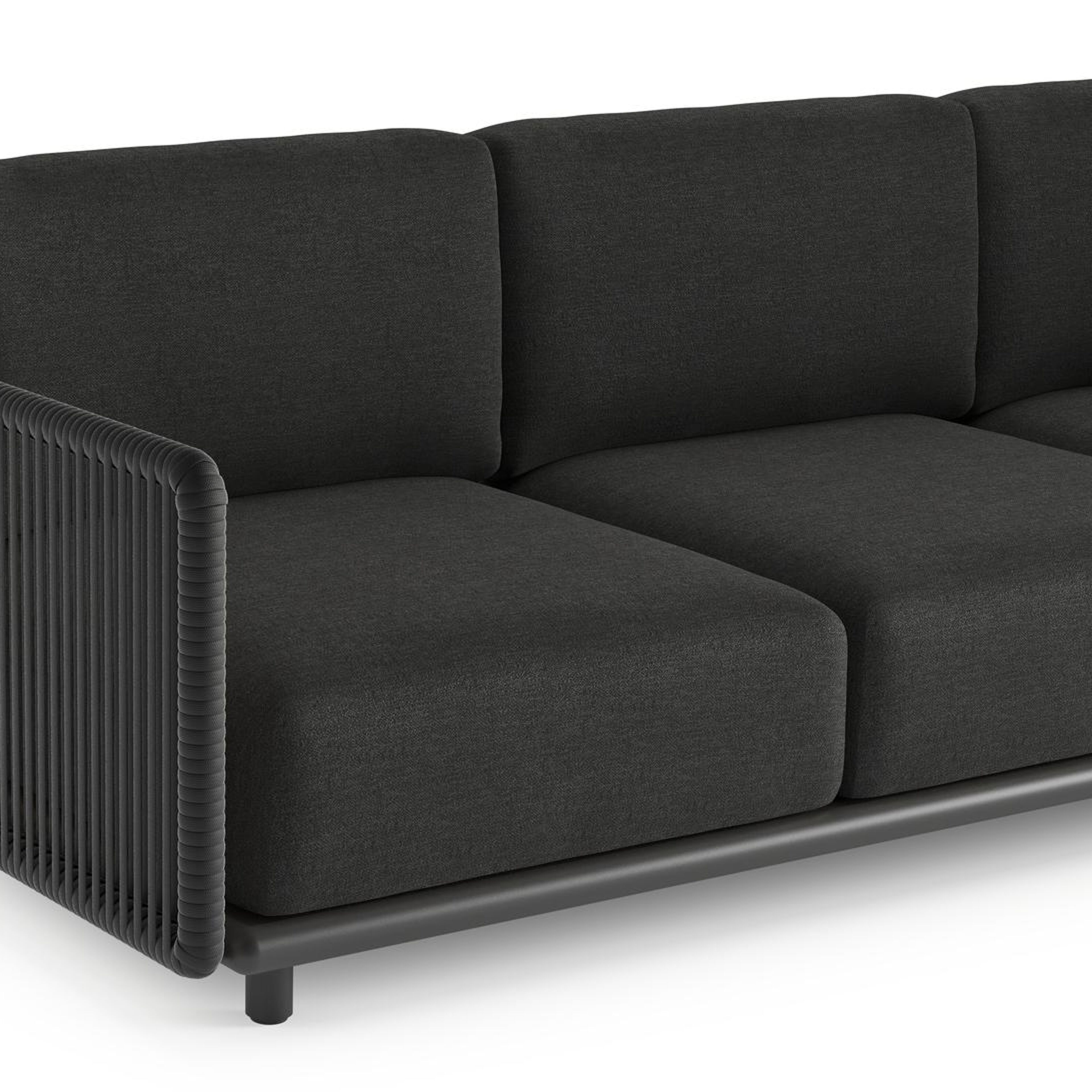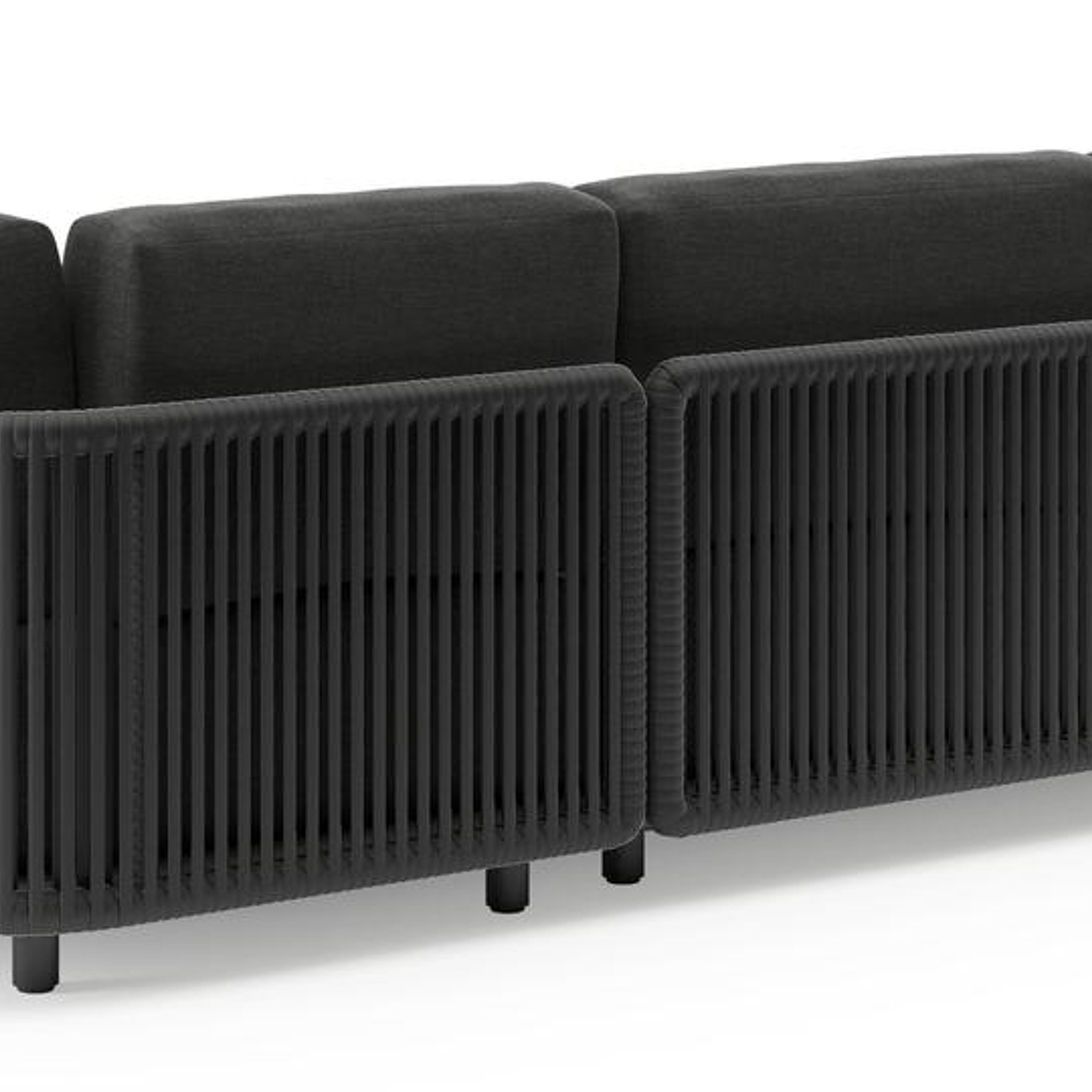 Organo loungehoek in zwart aluminium en zwart verticaal geweven luxe vlakke rope met chartres sooty all weather sunbrella® luxe kussens | Exterioo tuinmeubelen