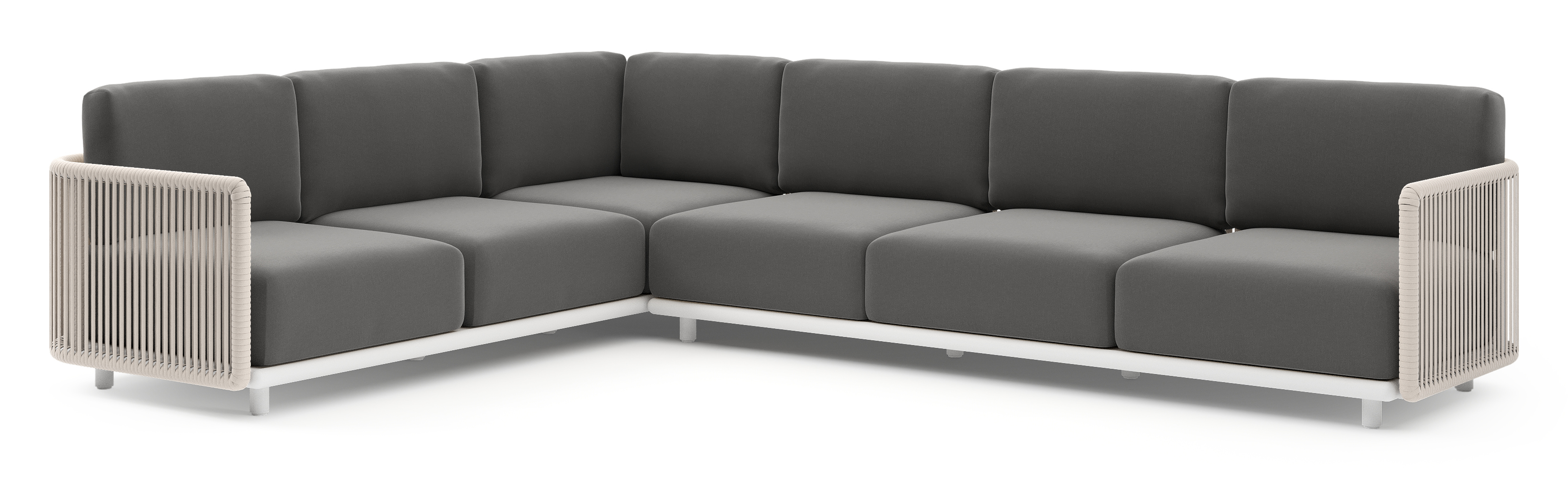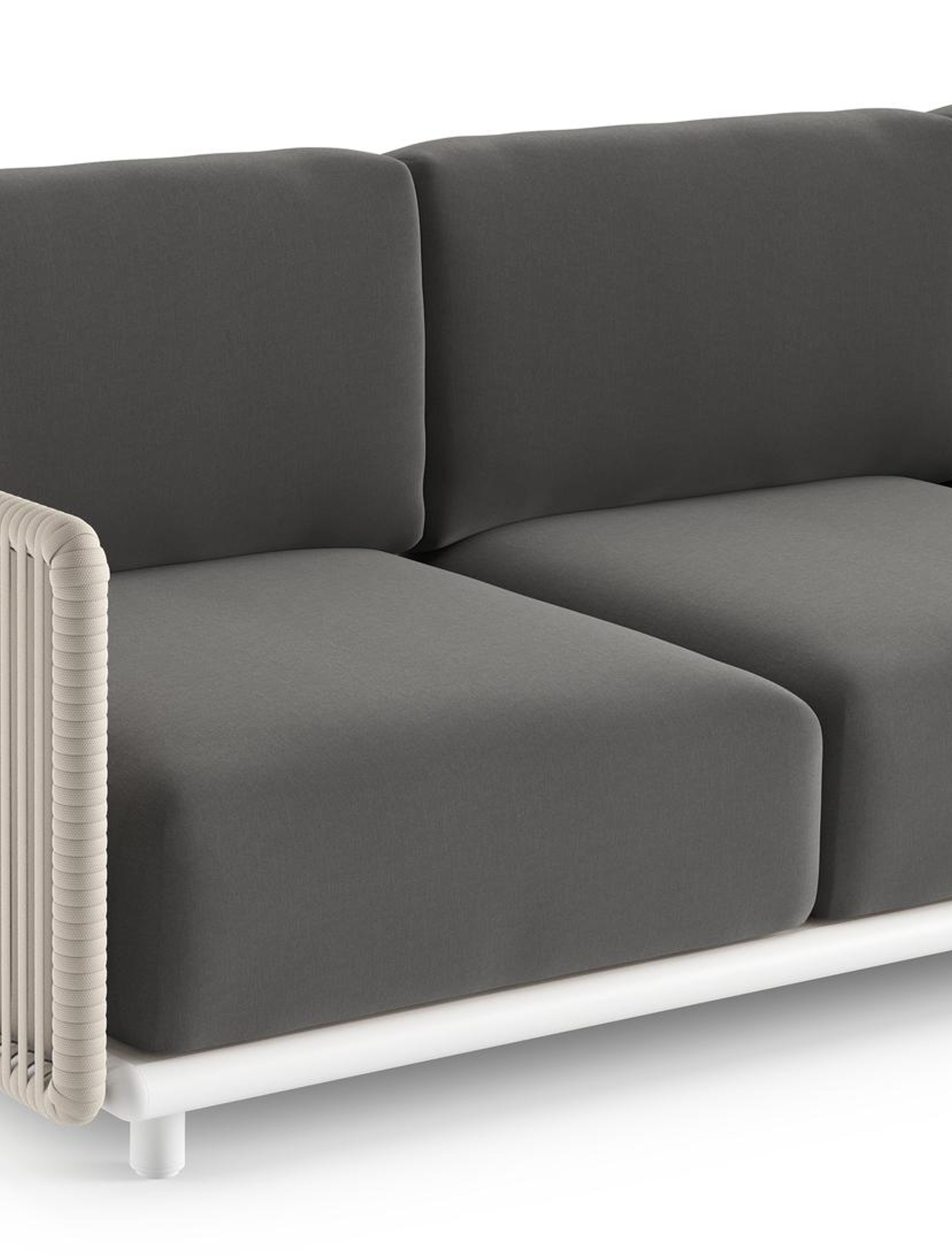 Organo loungehoek in wit aluminium en beige verticaal geweven luxe vlakke rope met natte charcoal chine all weather Sunbrella® luxe kussen | Exterioo tuinmeubelen