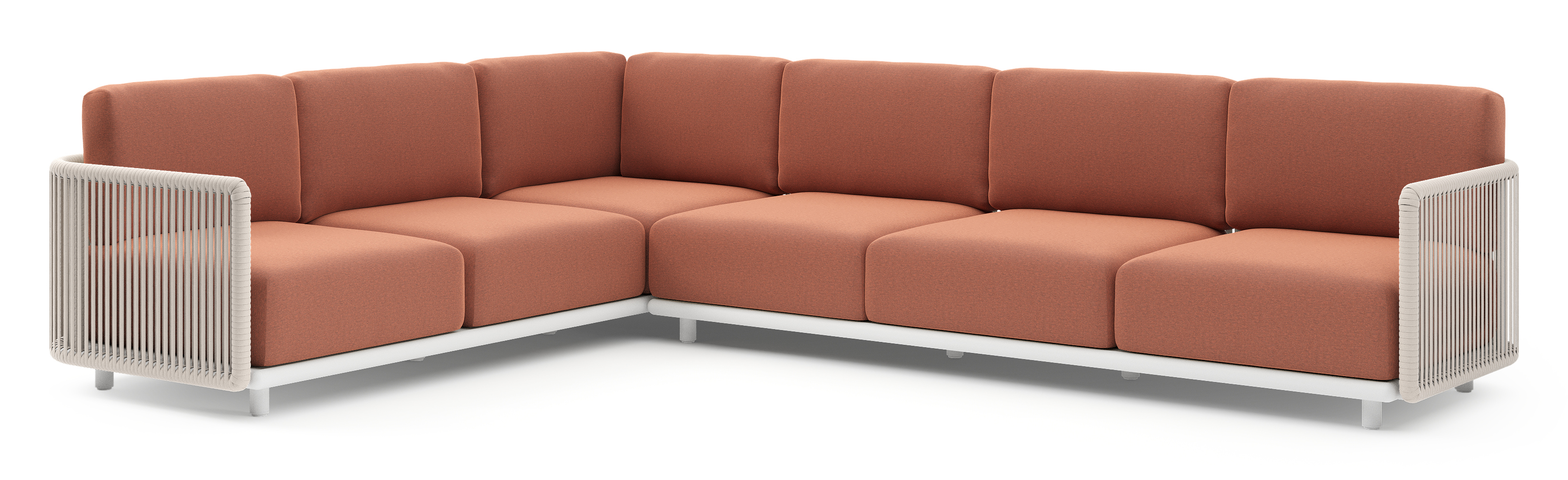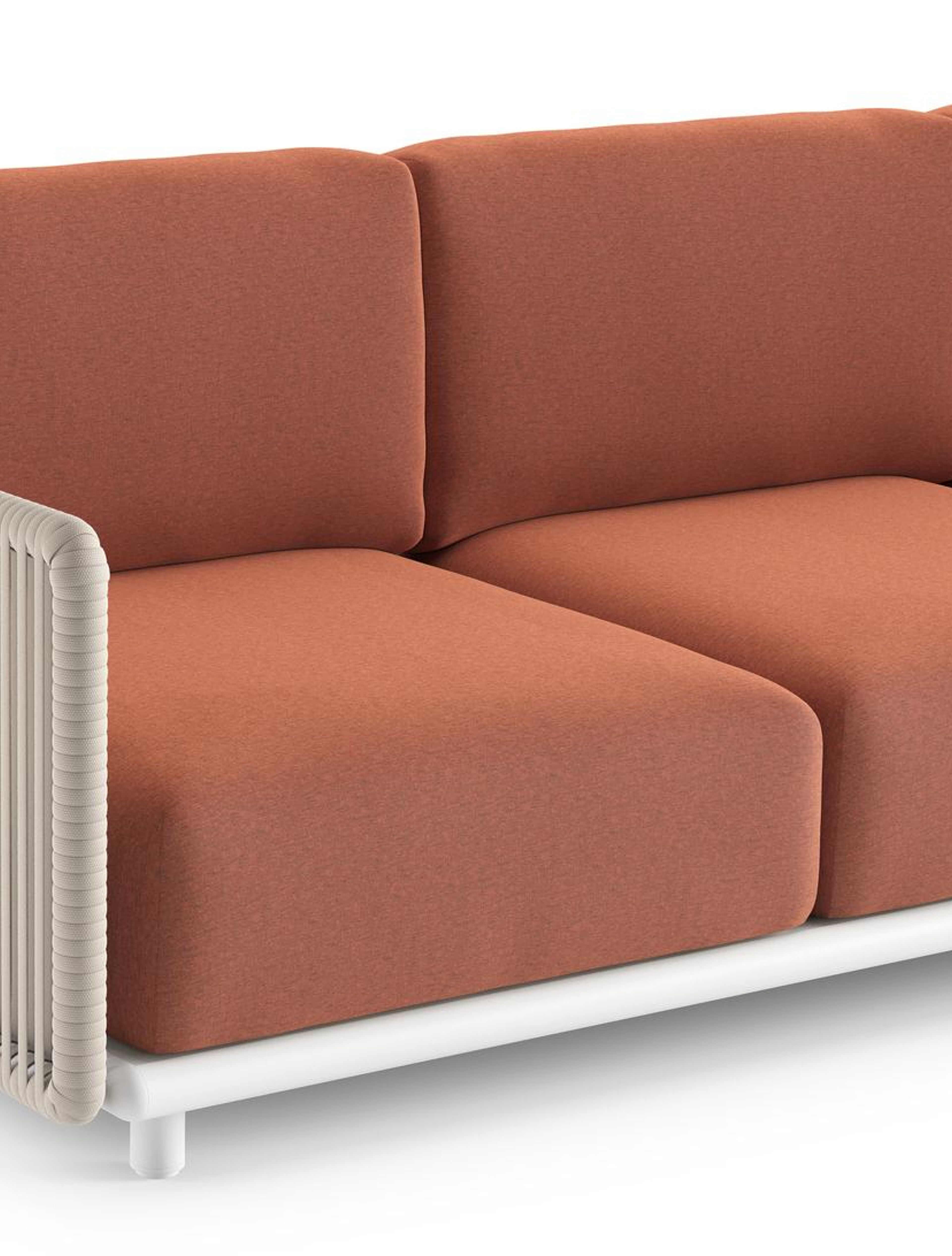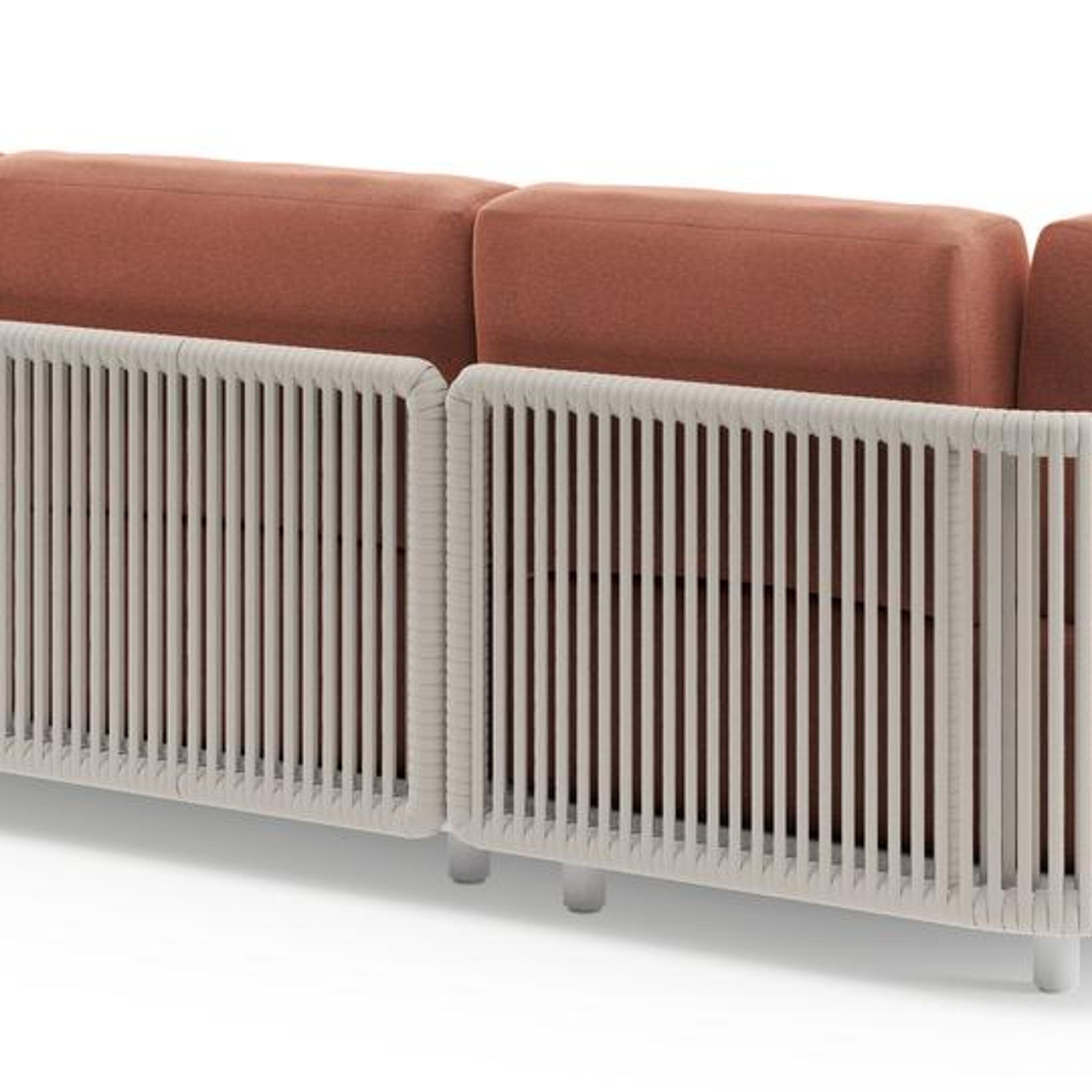 Organo loungehoek in wit aluminium en beige verticaal geweven luxe vlakke rope met heritage rust all weather Sunbrella® luxe kussen | Exterioo tuinmeubelen