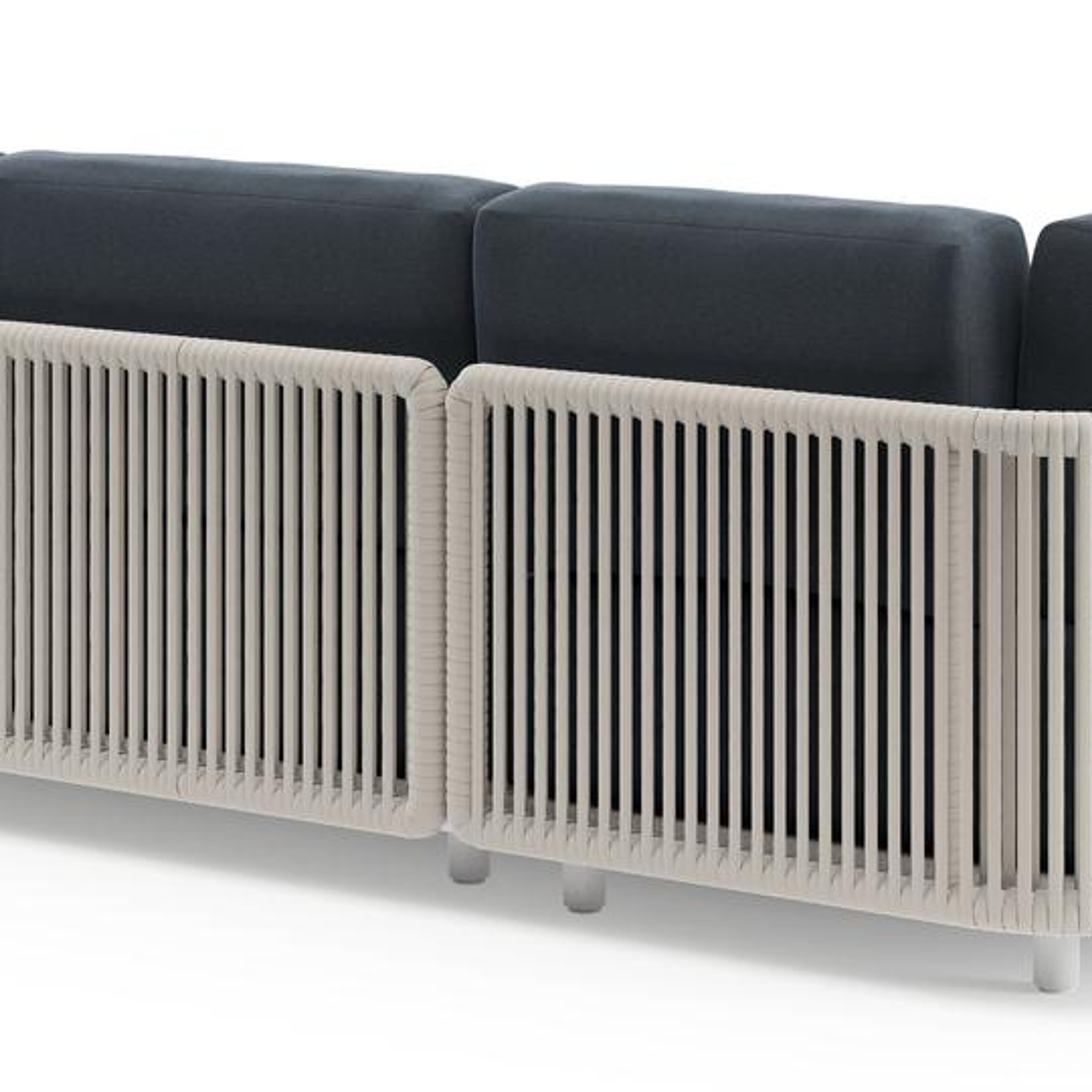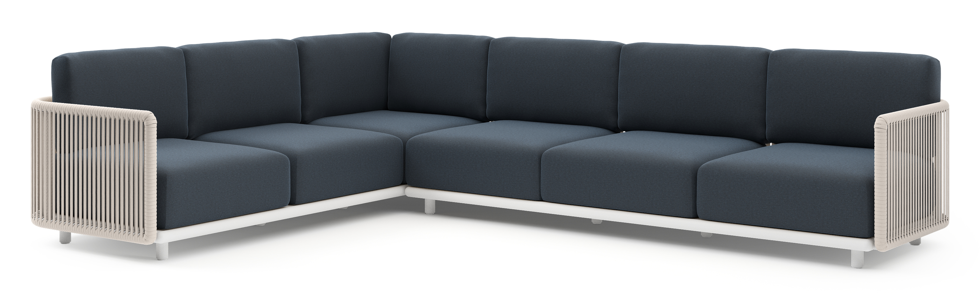 Organo loungehoek in wit aluminium en beige verticaal geweven luxe vlakke rope met heritage indigo all weather Sunbrella® luxe kussen | Exterioo tuinmeubelen