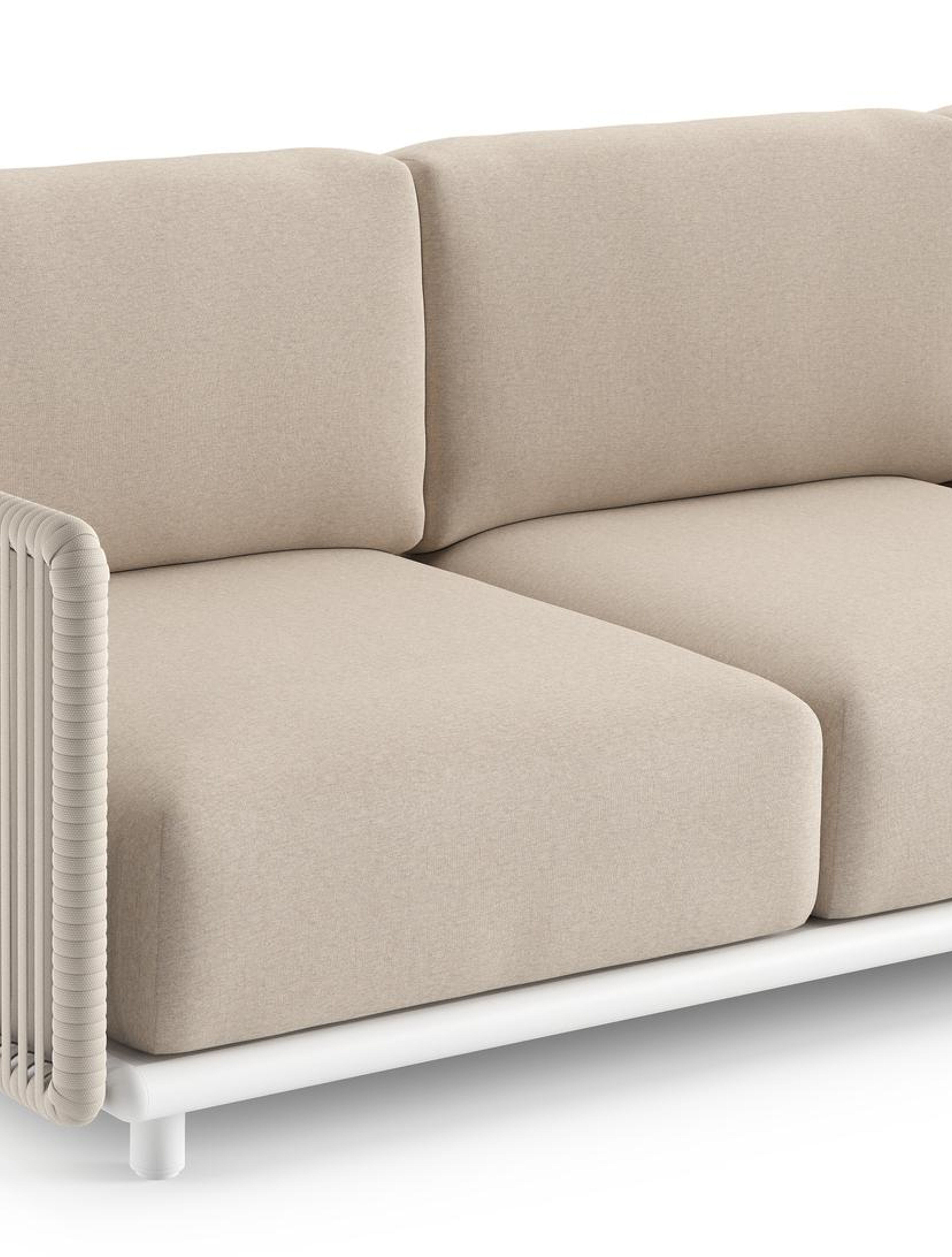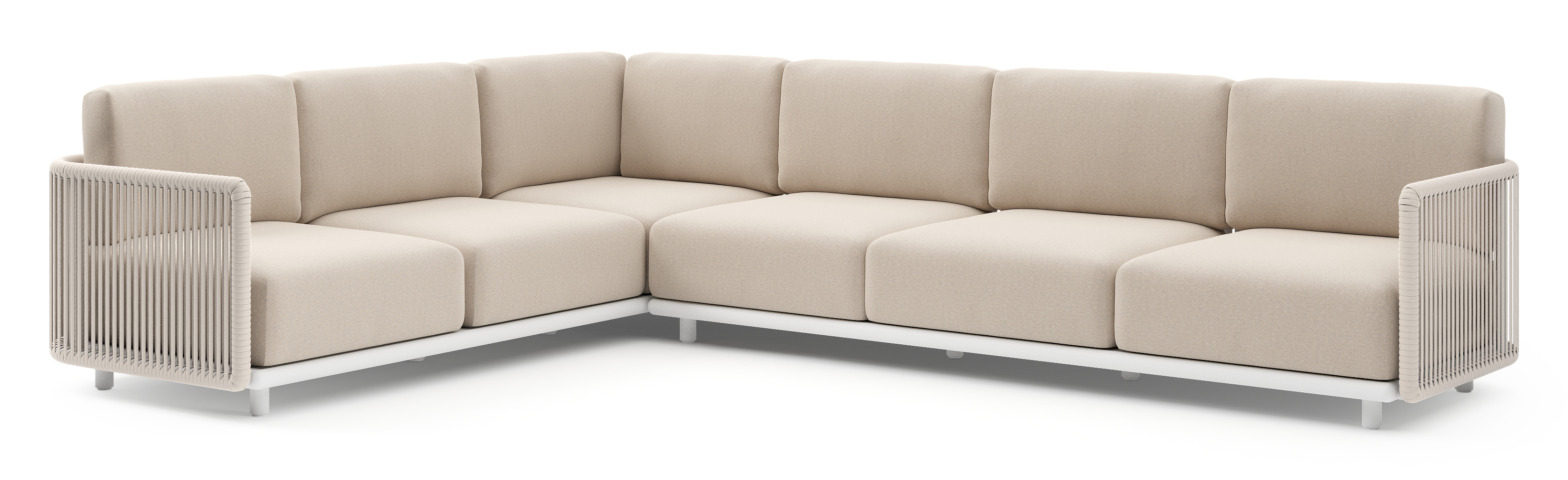 Organo loungehoek in wit aluminium en beige verticaal geweven luxe vlakke rope met heritage ash all weather Sunbrella® luxe kussen | Exterioo tuinmeubelen