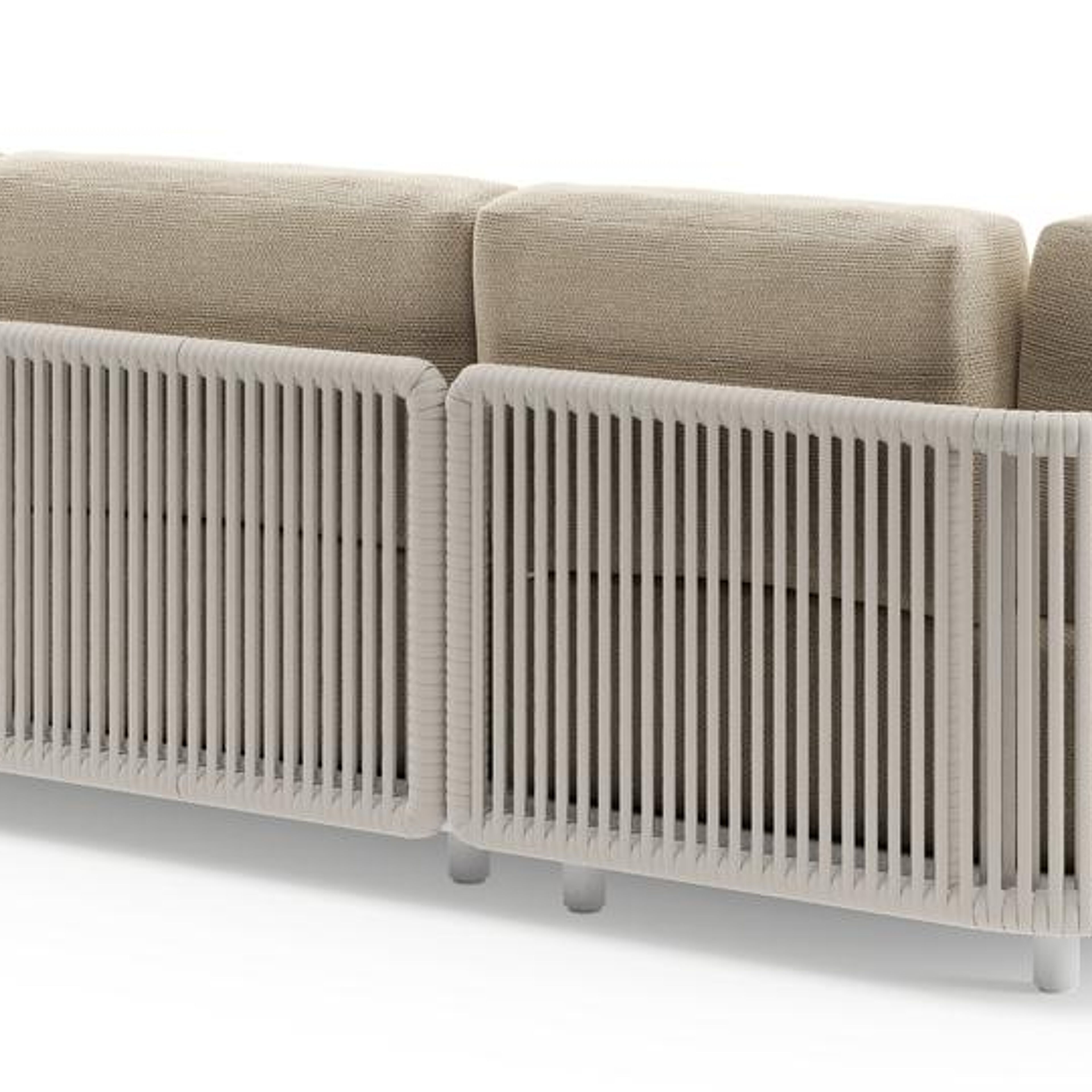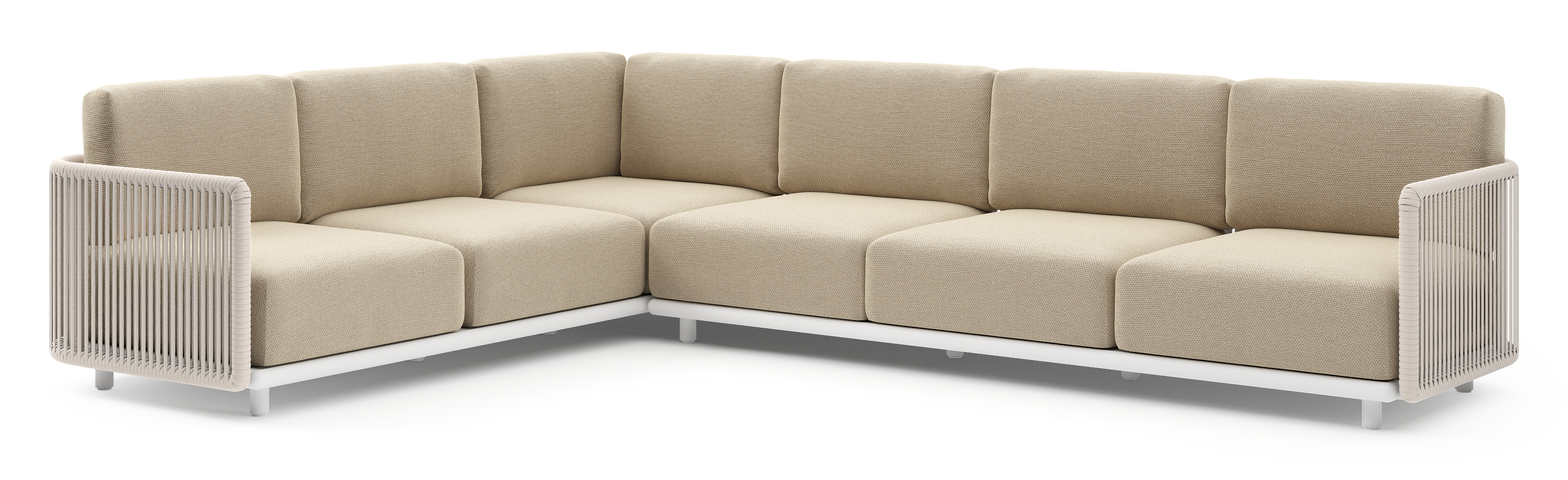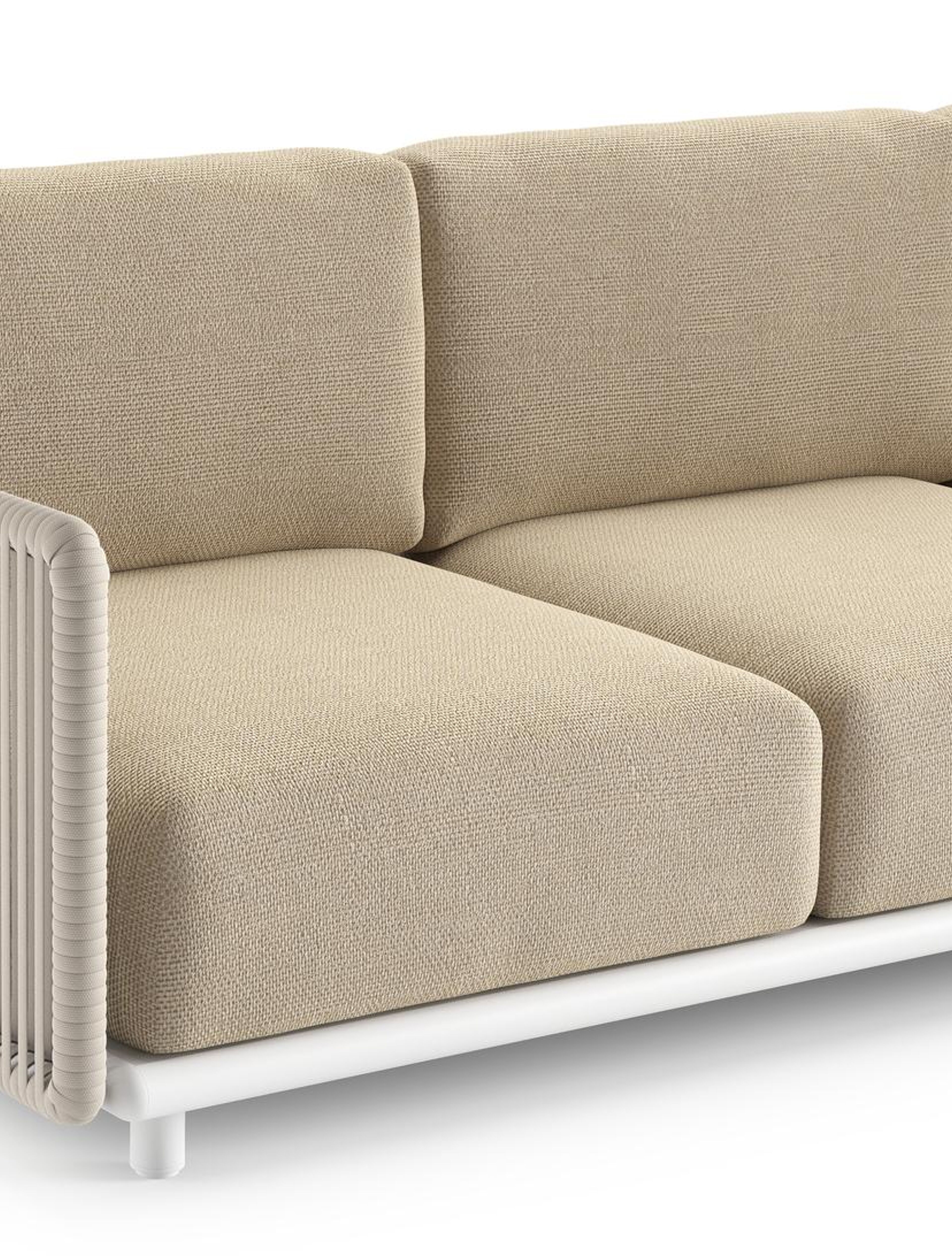 Organo loungehoek in wit aluminium en beige verticaal geweven luxe vlakke rope met althea camel all weather Cosytica kussen | Exterioo tuinmeubelen