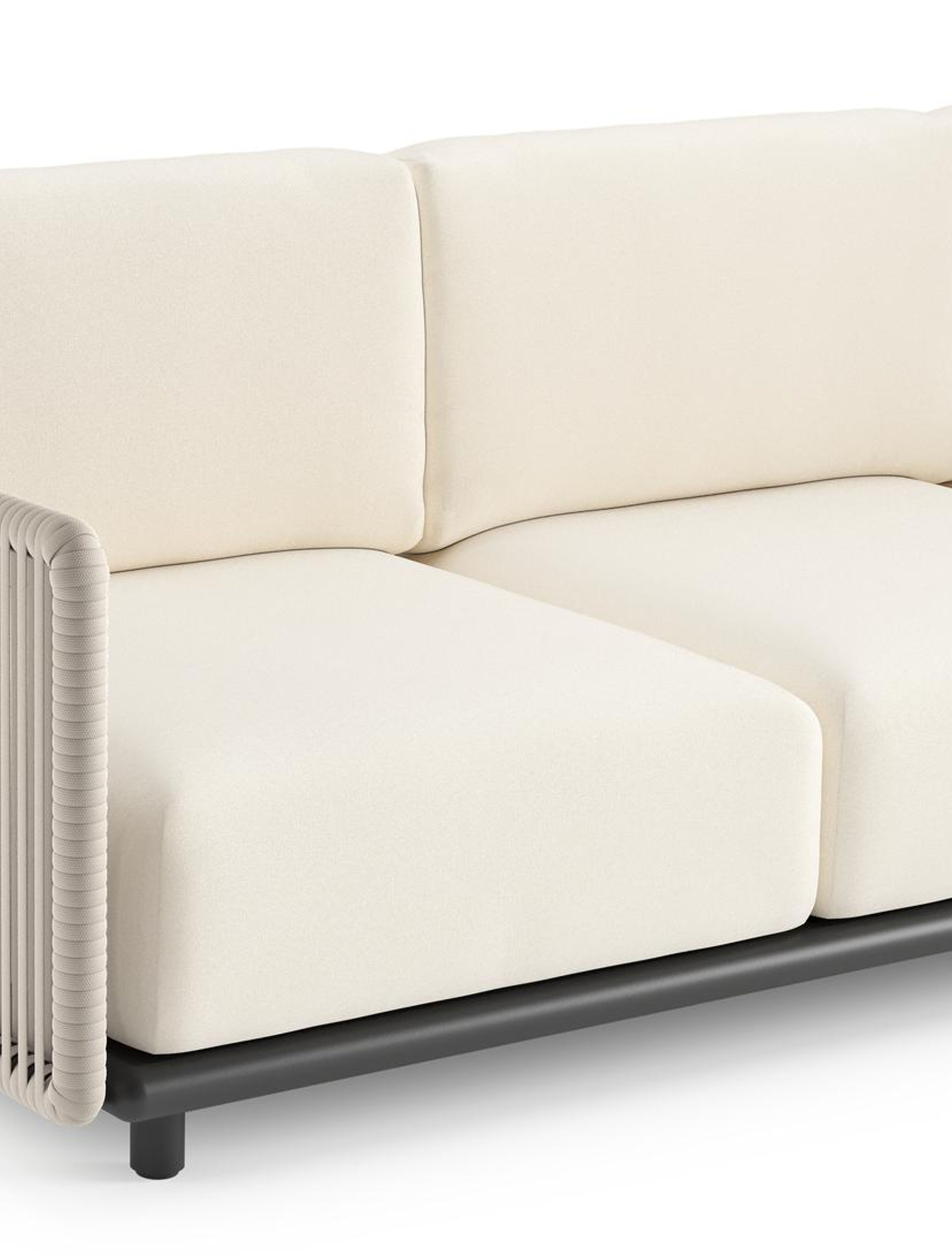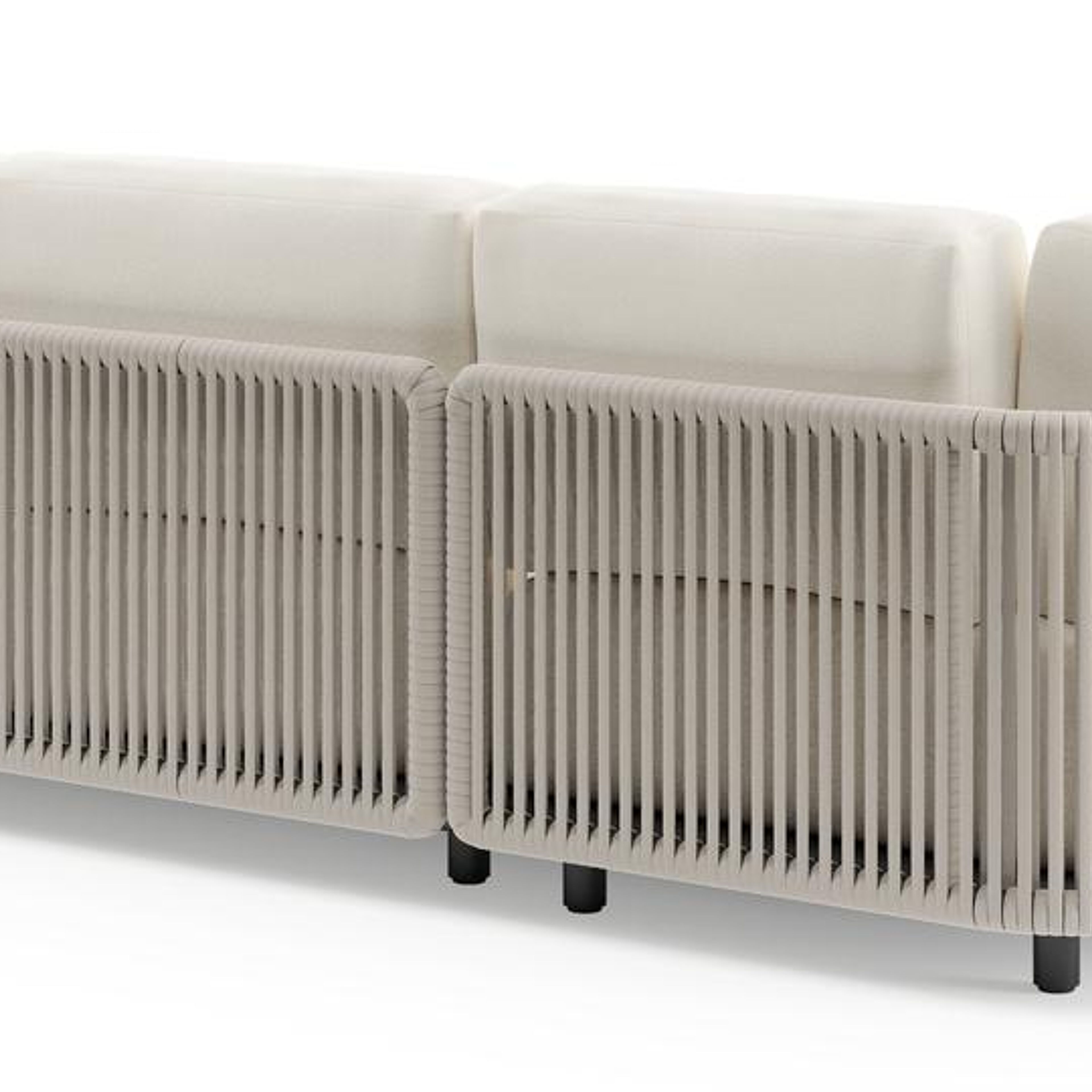 Organo loungehoek in zwart aluminium en beige verticaal geweven luxe vlakke rope met natte white all weather Sunbrella® luxe kussen | Exterioo tuinmeubelen