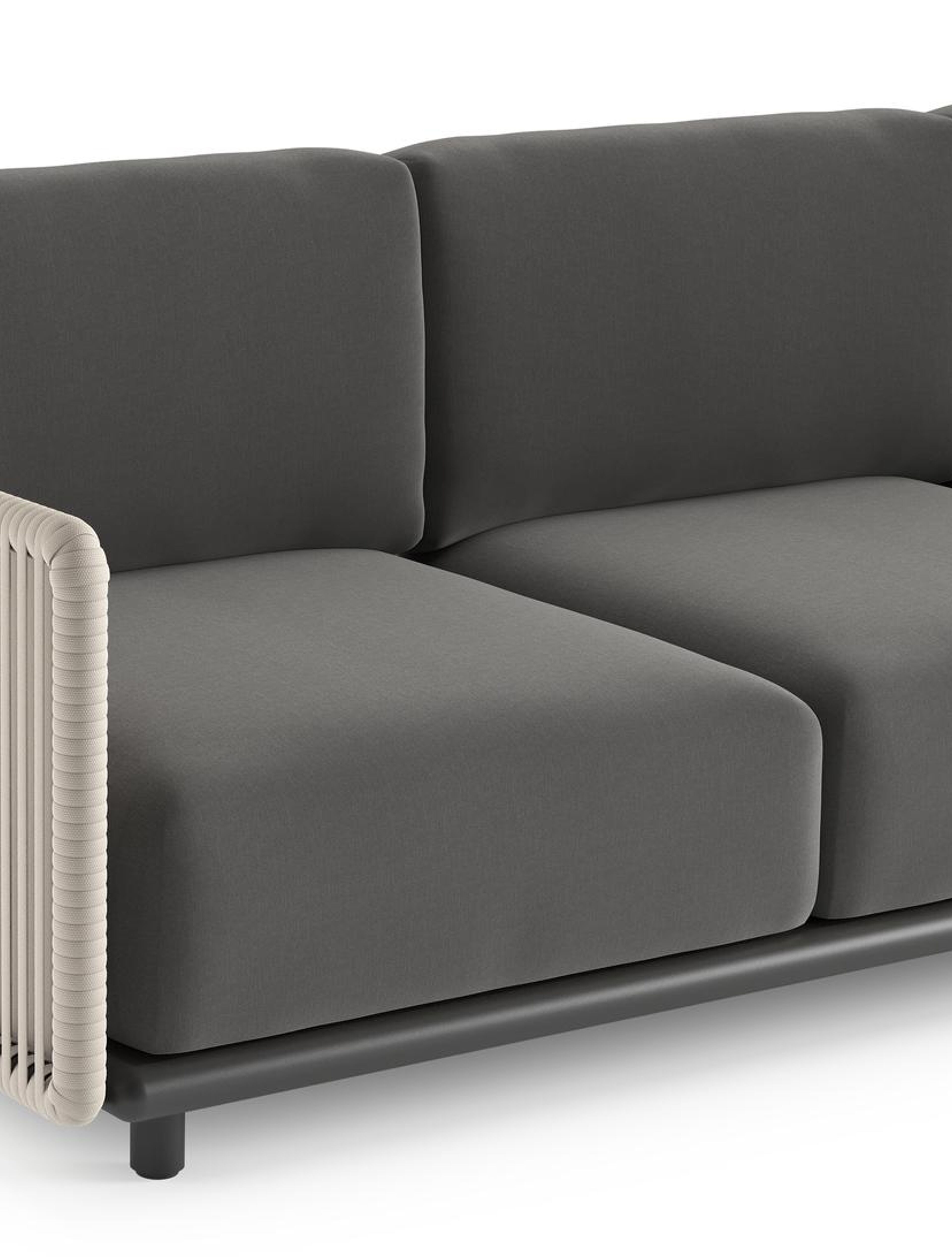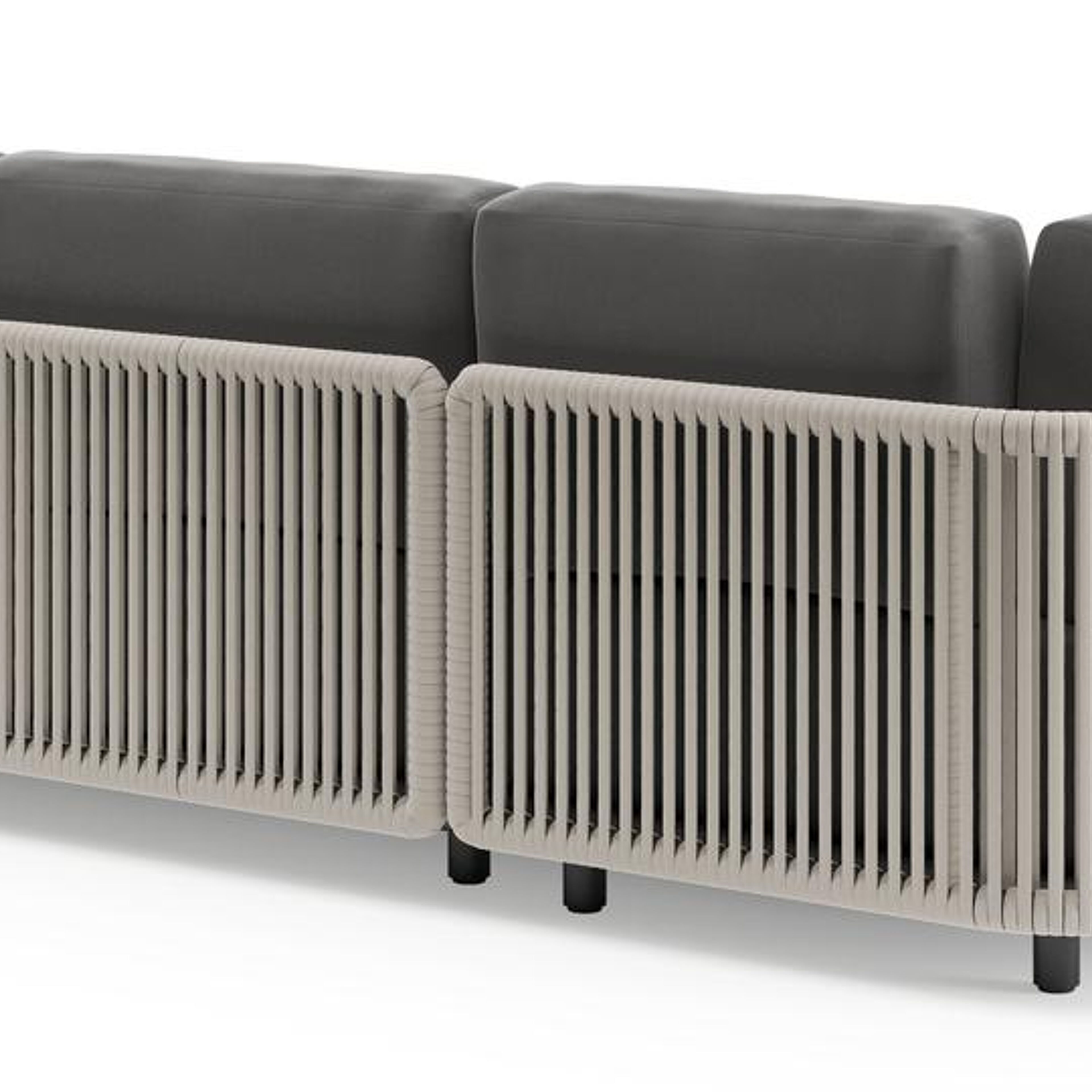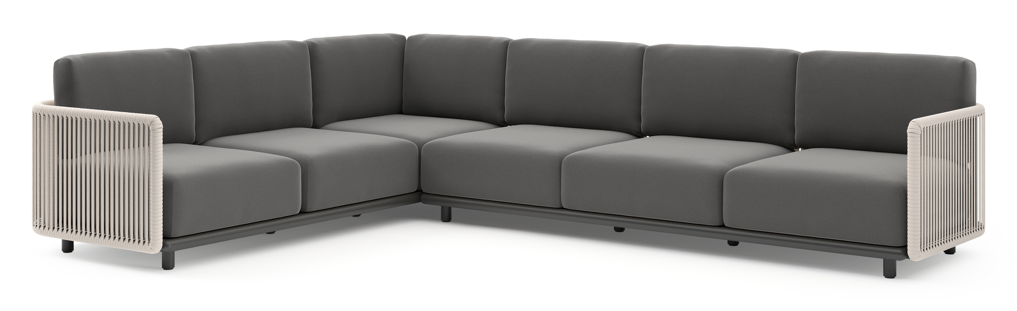 Organo loungehoek in zwart aluminium en beige verticaal geweven luxe vlakke rope met natte charcoal chine all weather Sunbrella® luxe kussen | Exterioo tuinmeubelen
