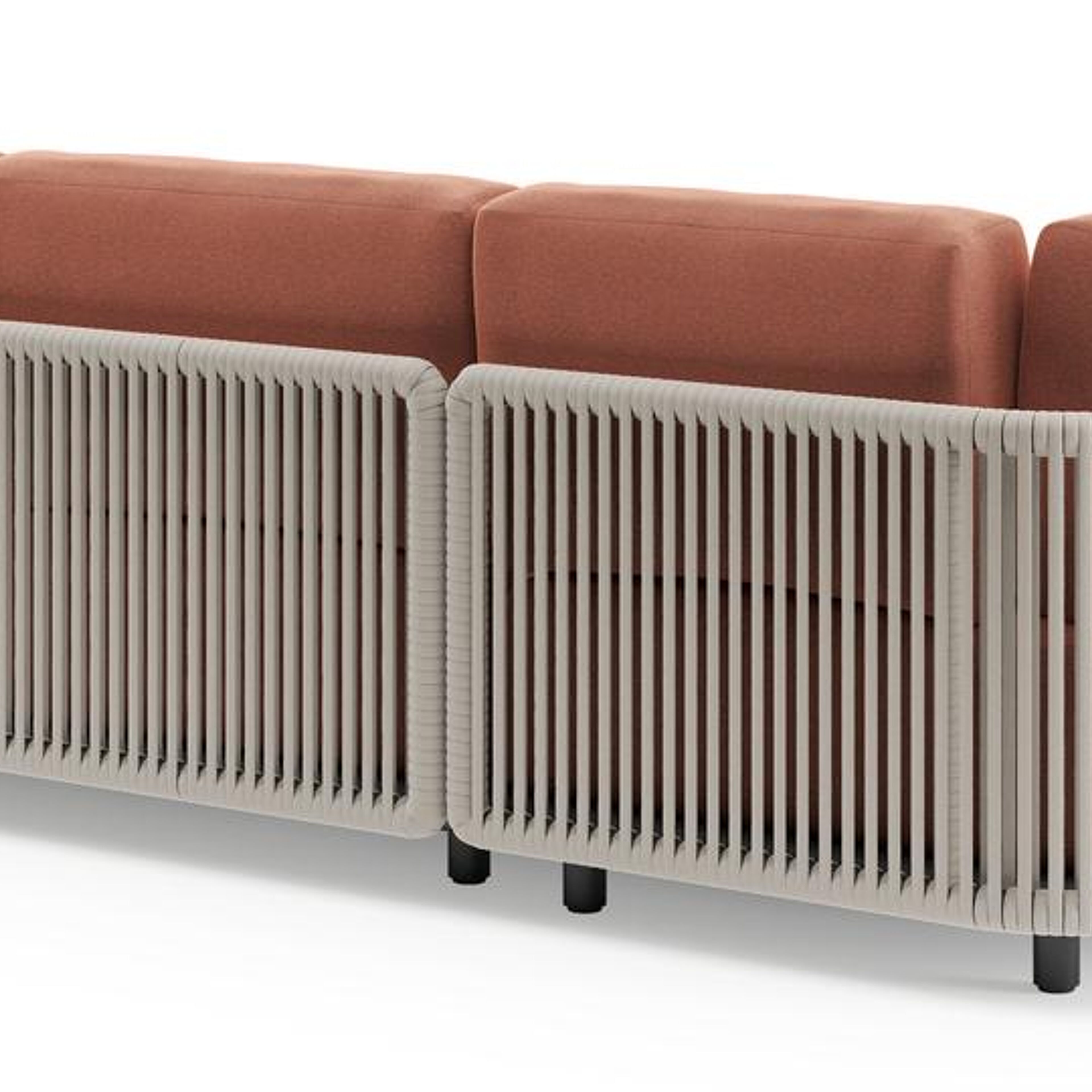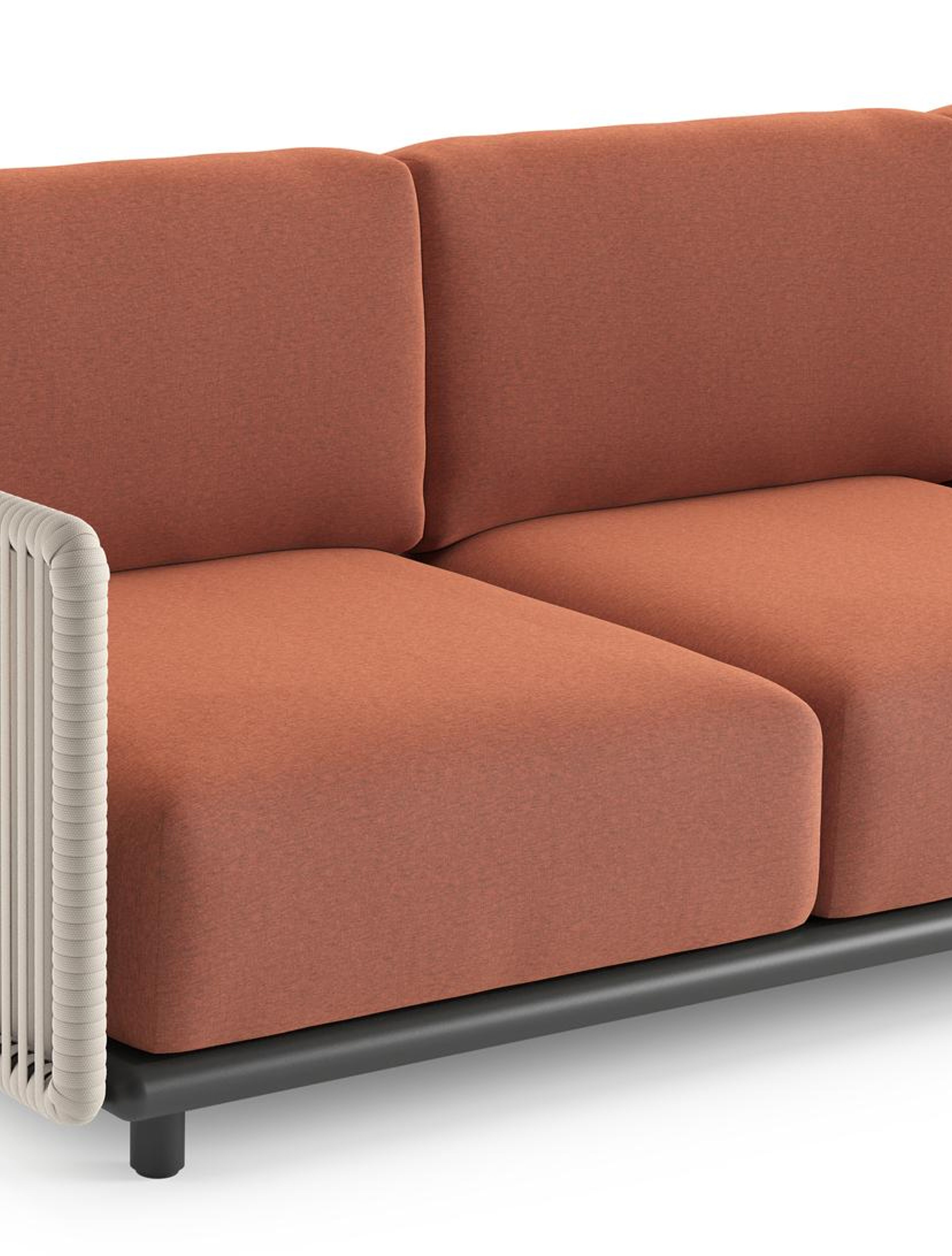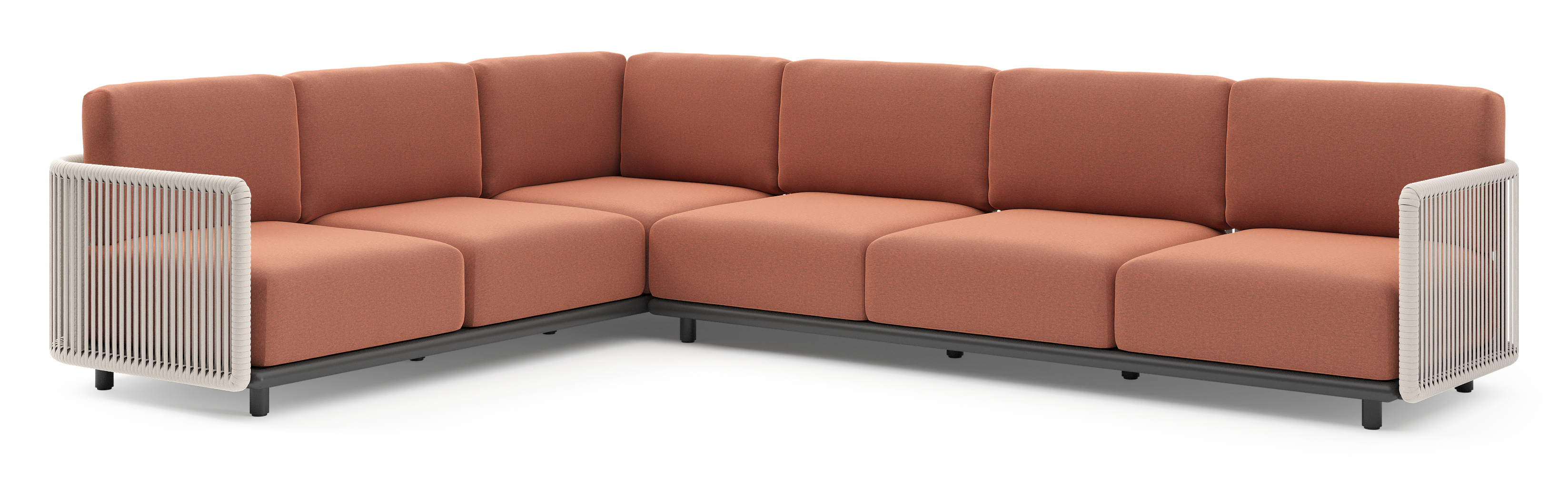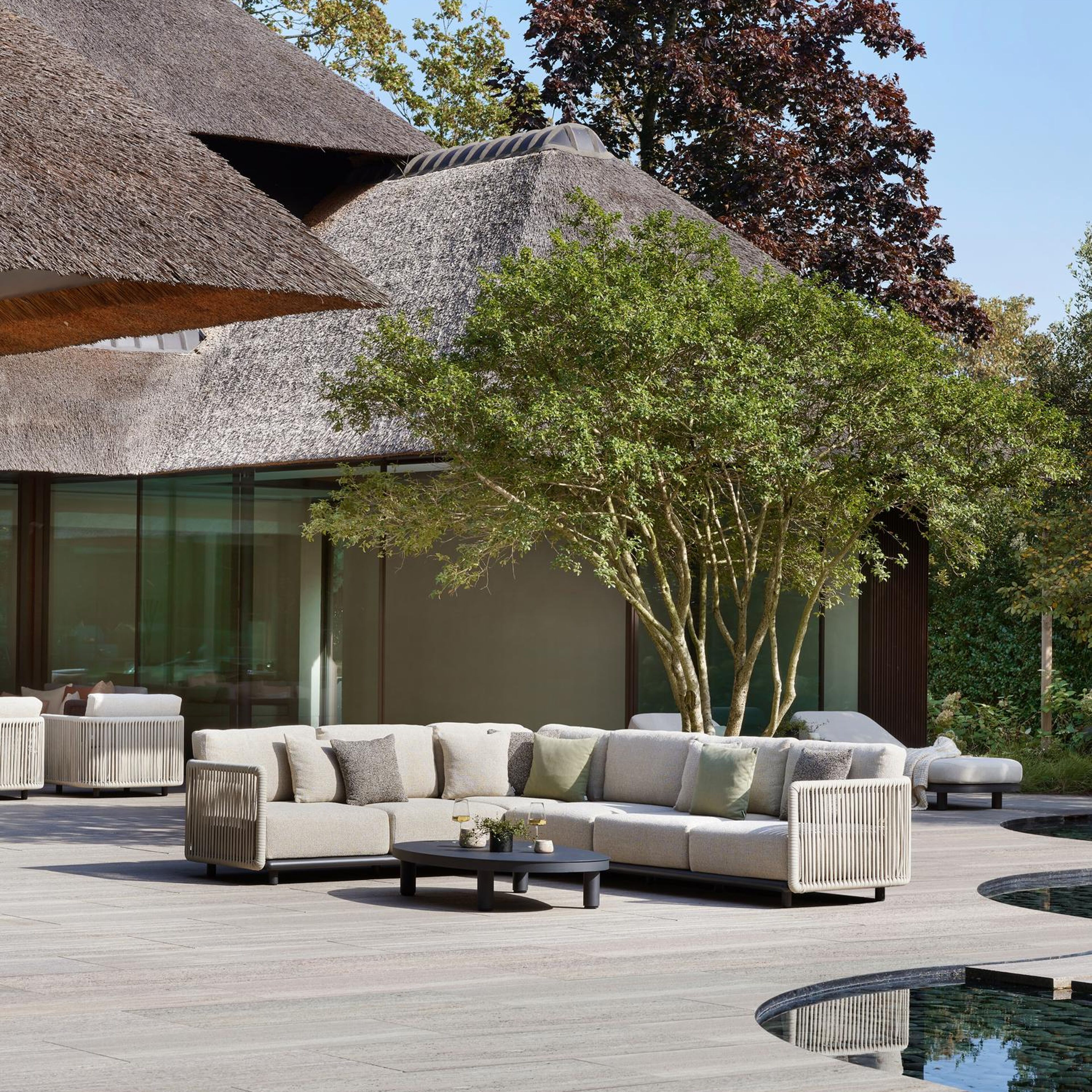 Organo loungehoek in zwart aluminium en beige verticaal geweven luxe vlakke rope met heritage rust all weather Sunbrella® luxe kussen | Exterioo tuinmeubelen