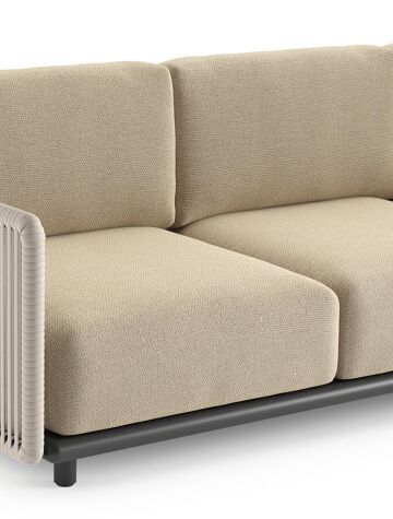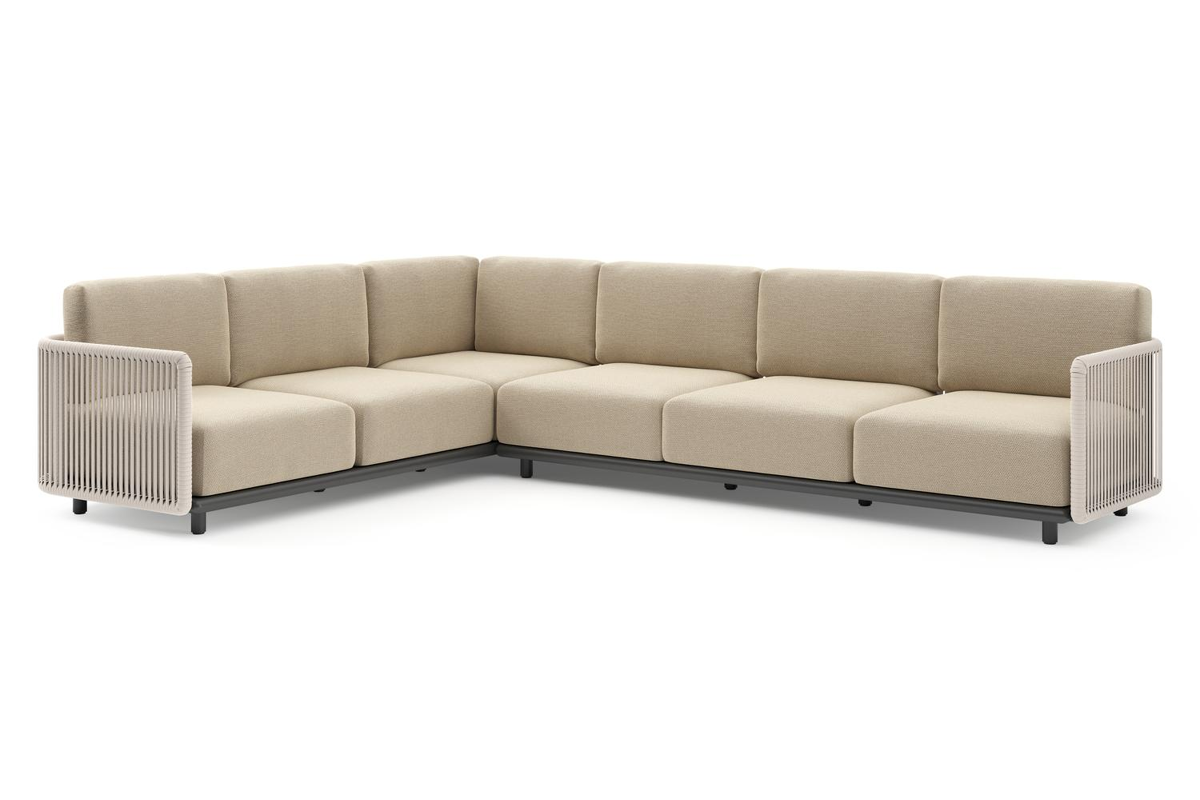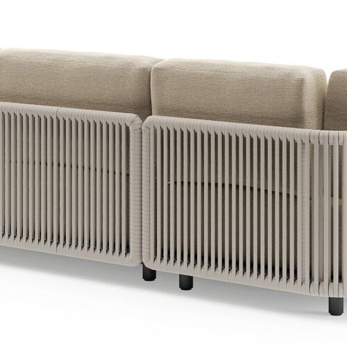 Organo loungehoek in zwart aluminium en beige verticaal geweven luxe vlakke rope met althea camel all weather Cosytica kussen | Exterioo
