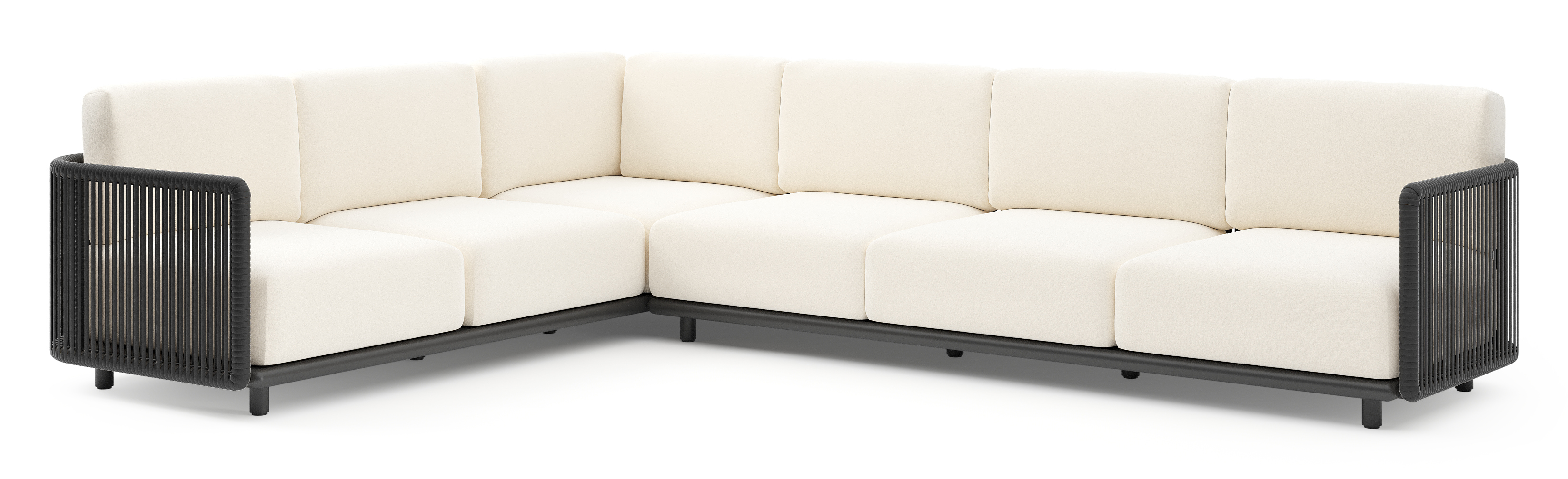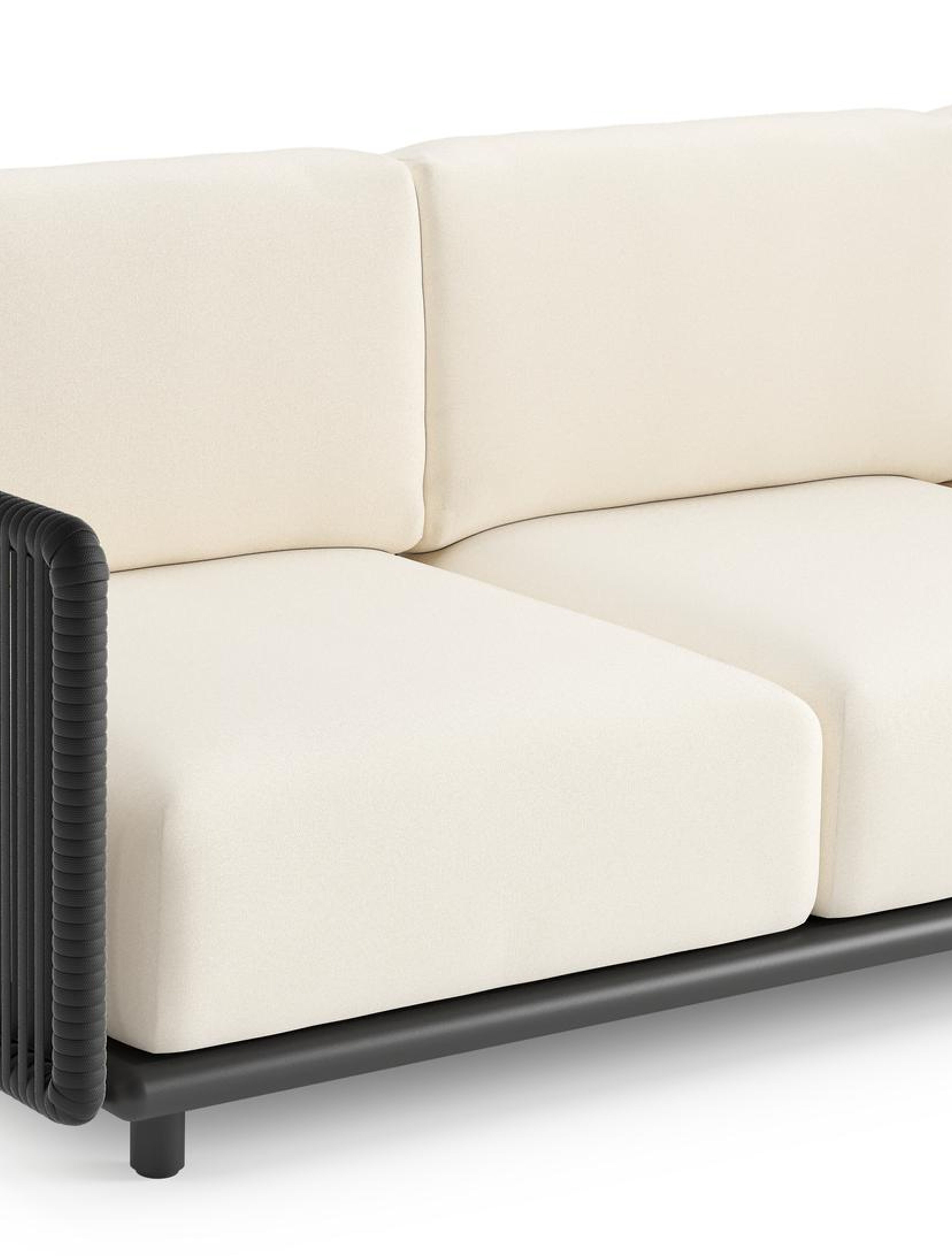Organo loungehoek in zwart aluminium en zwart verticaal geweven luxe vlakke rope met natte white all weather Sunbrella® luxe kussen | Exterioo tuinmeubelen