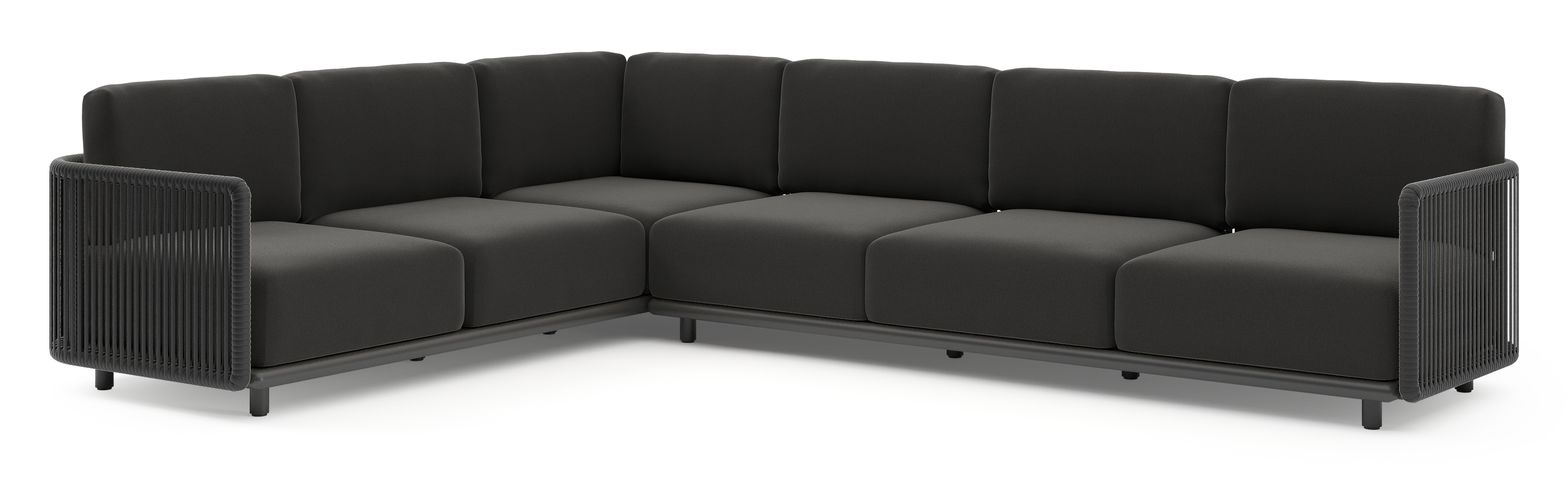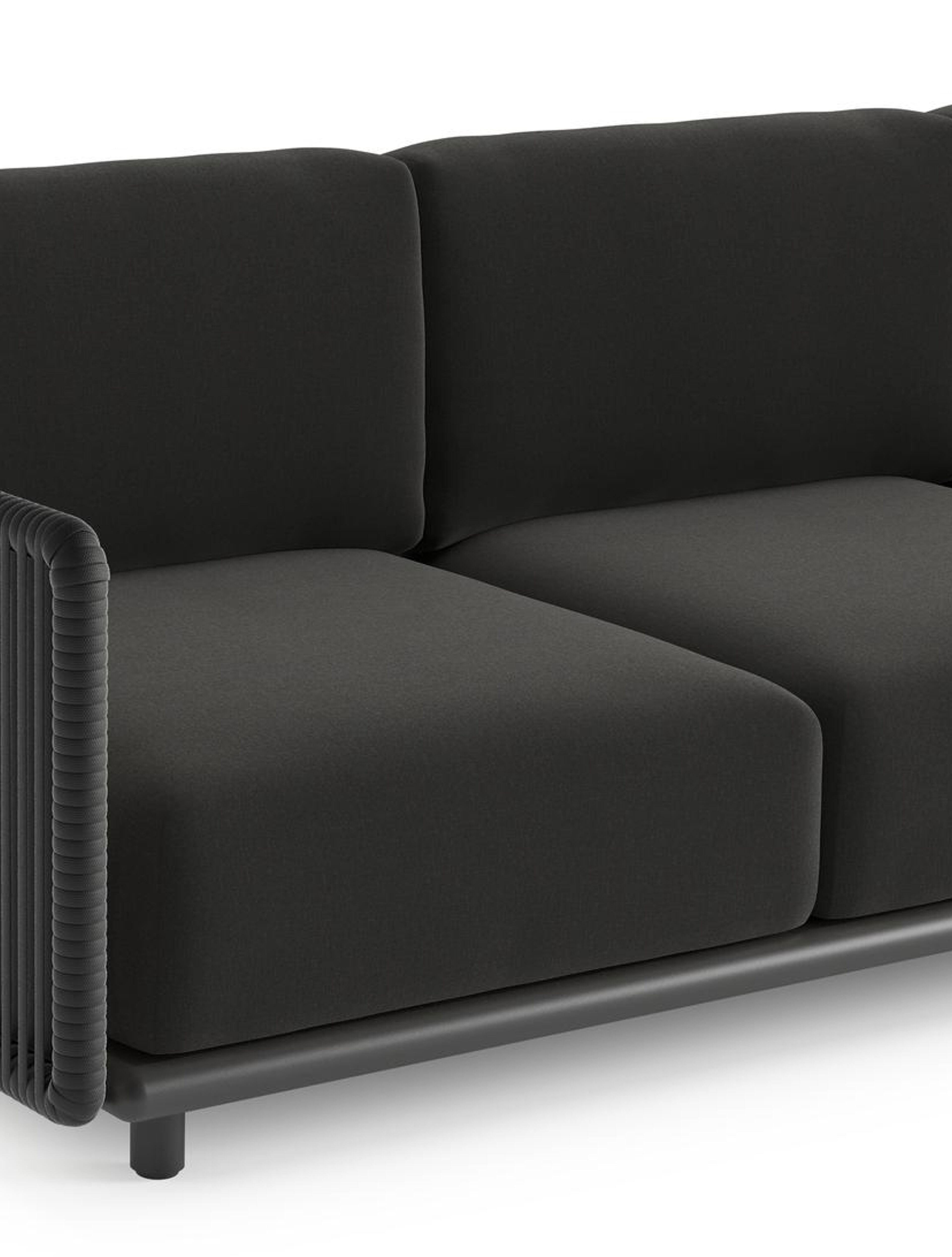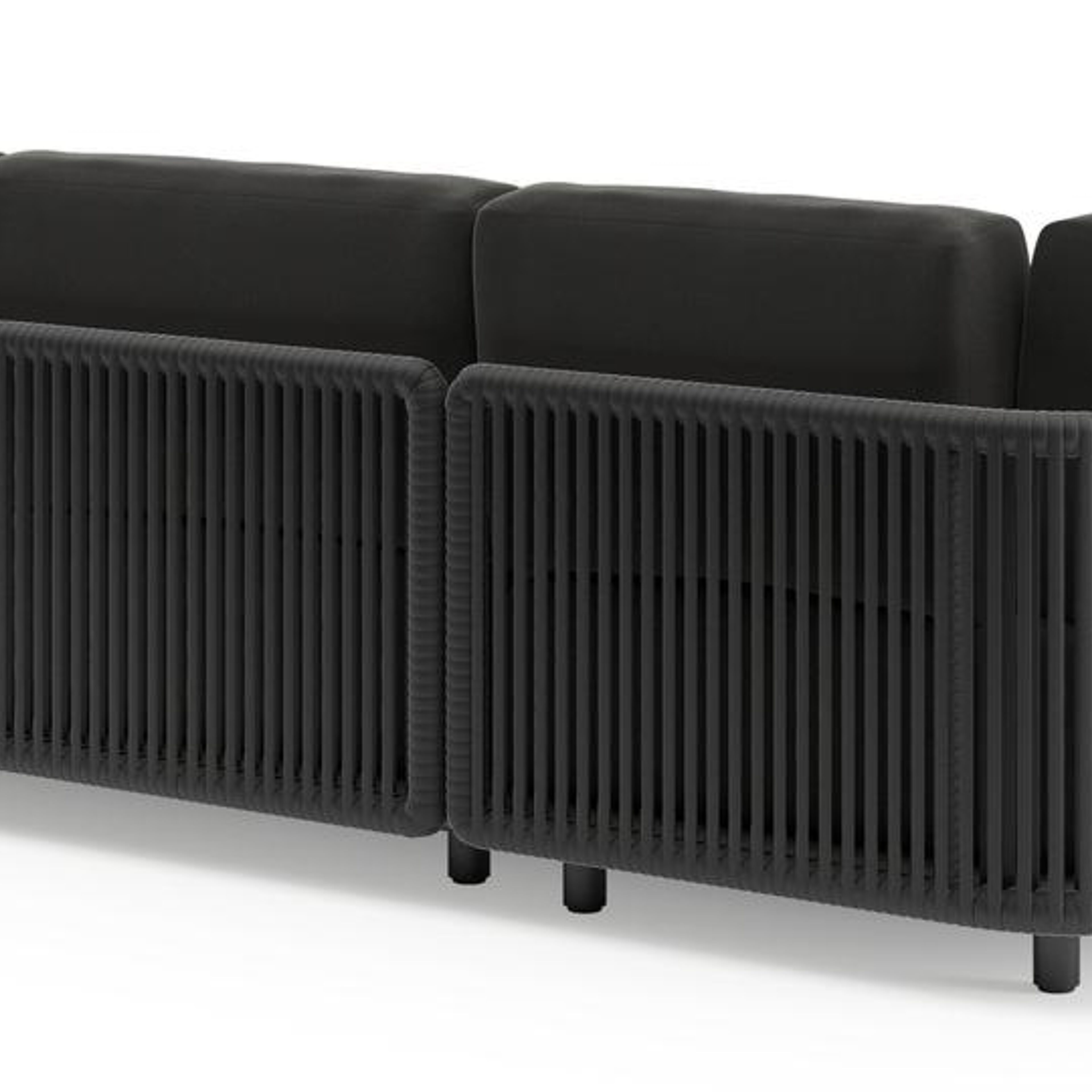 Organo loungehoek in zwart aluminium en zwart verticaal geweven luxe vlakke rope met natte sooty all weather Sunbrella® luxe kussen | Exterioo tuinmeubelen
