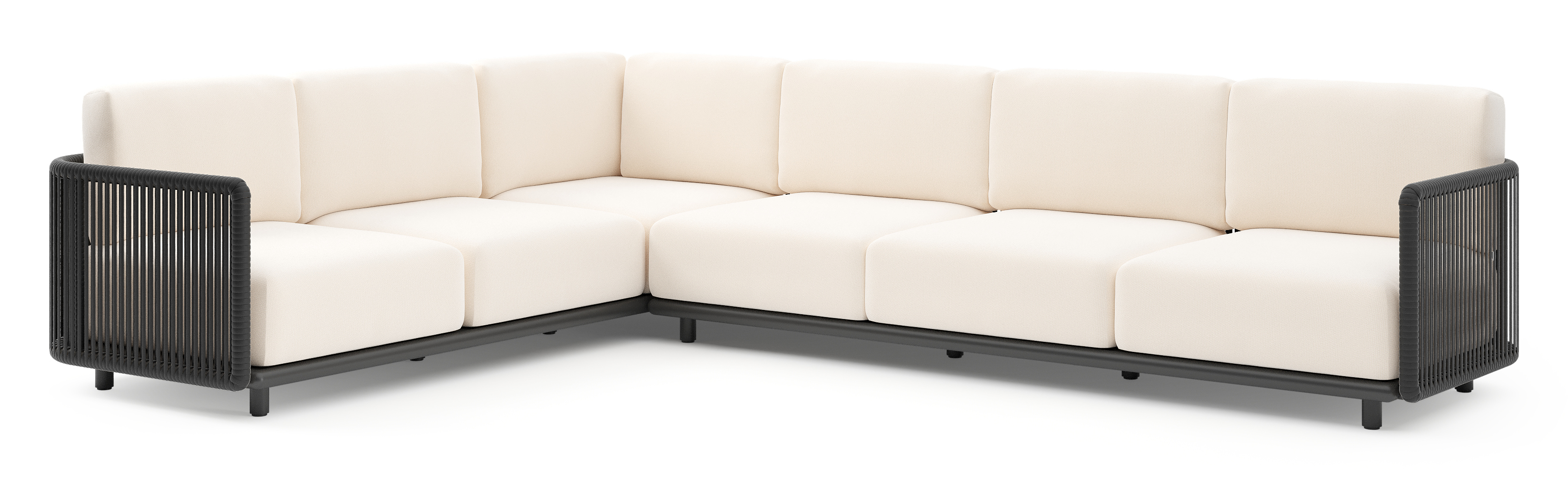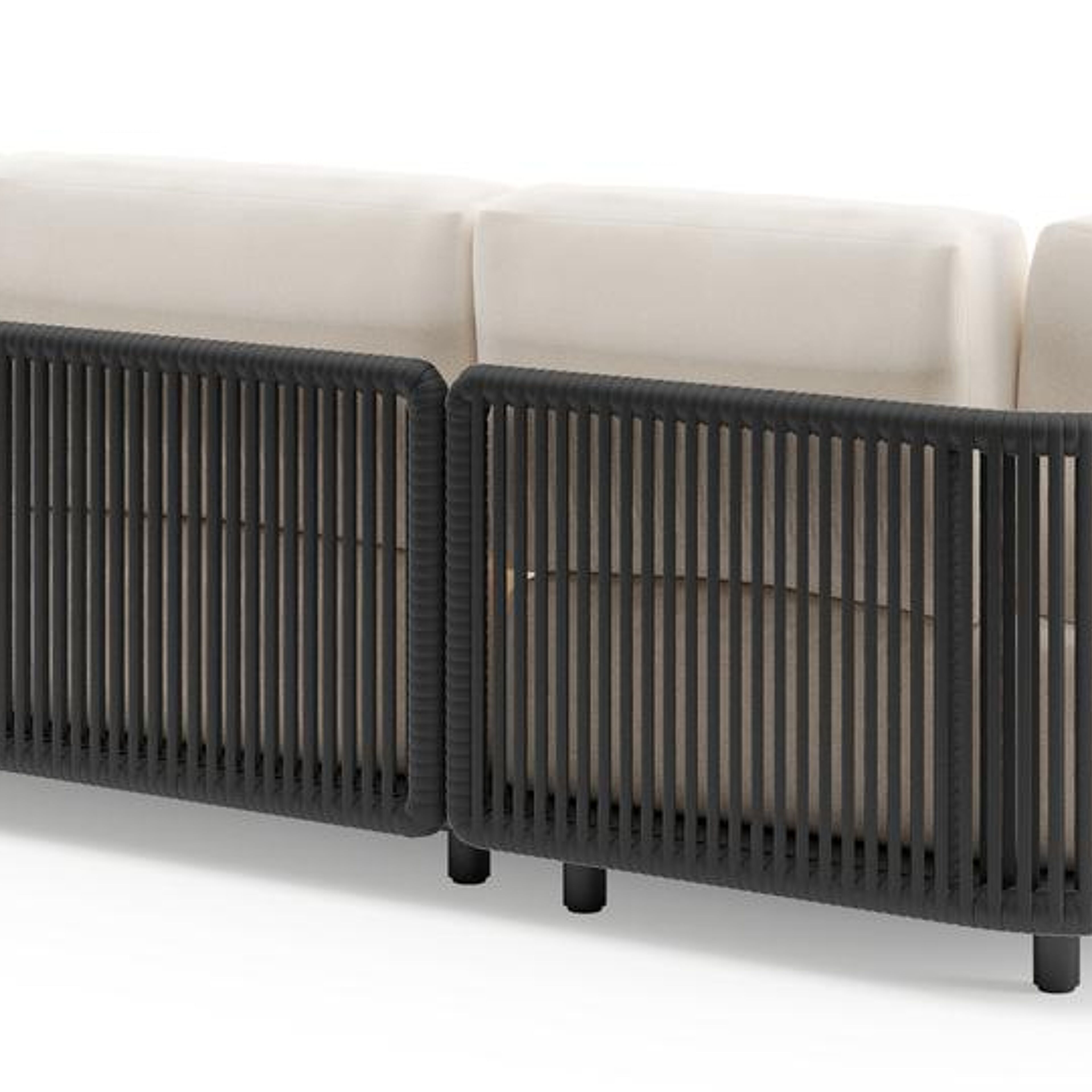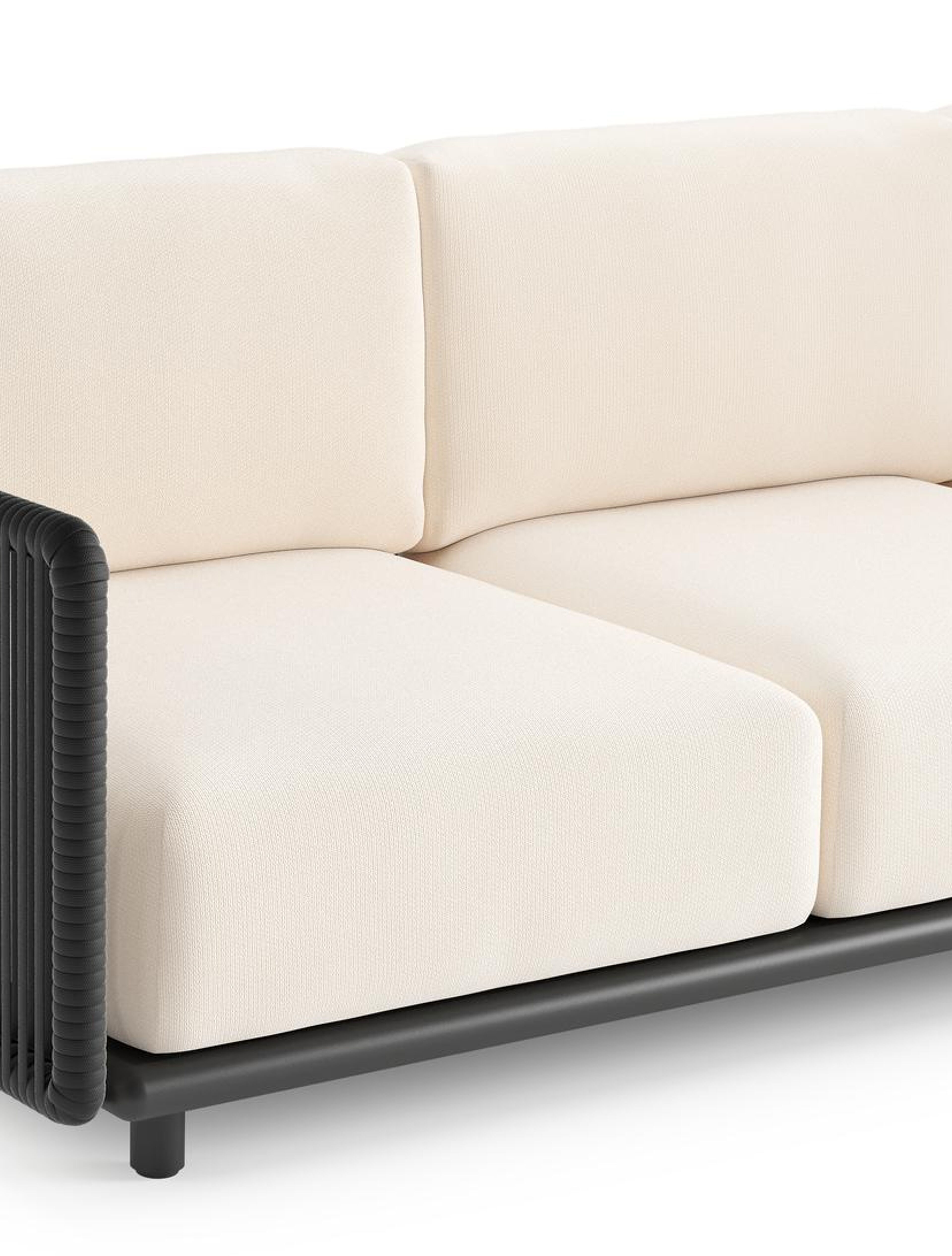 Organo loungehoek in zwart aluminium en zwart verticaal geweven luxe vlakke rope met lopi snow all weather Sunbrella® luxe kussen | Exterioo tuinmeubelen