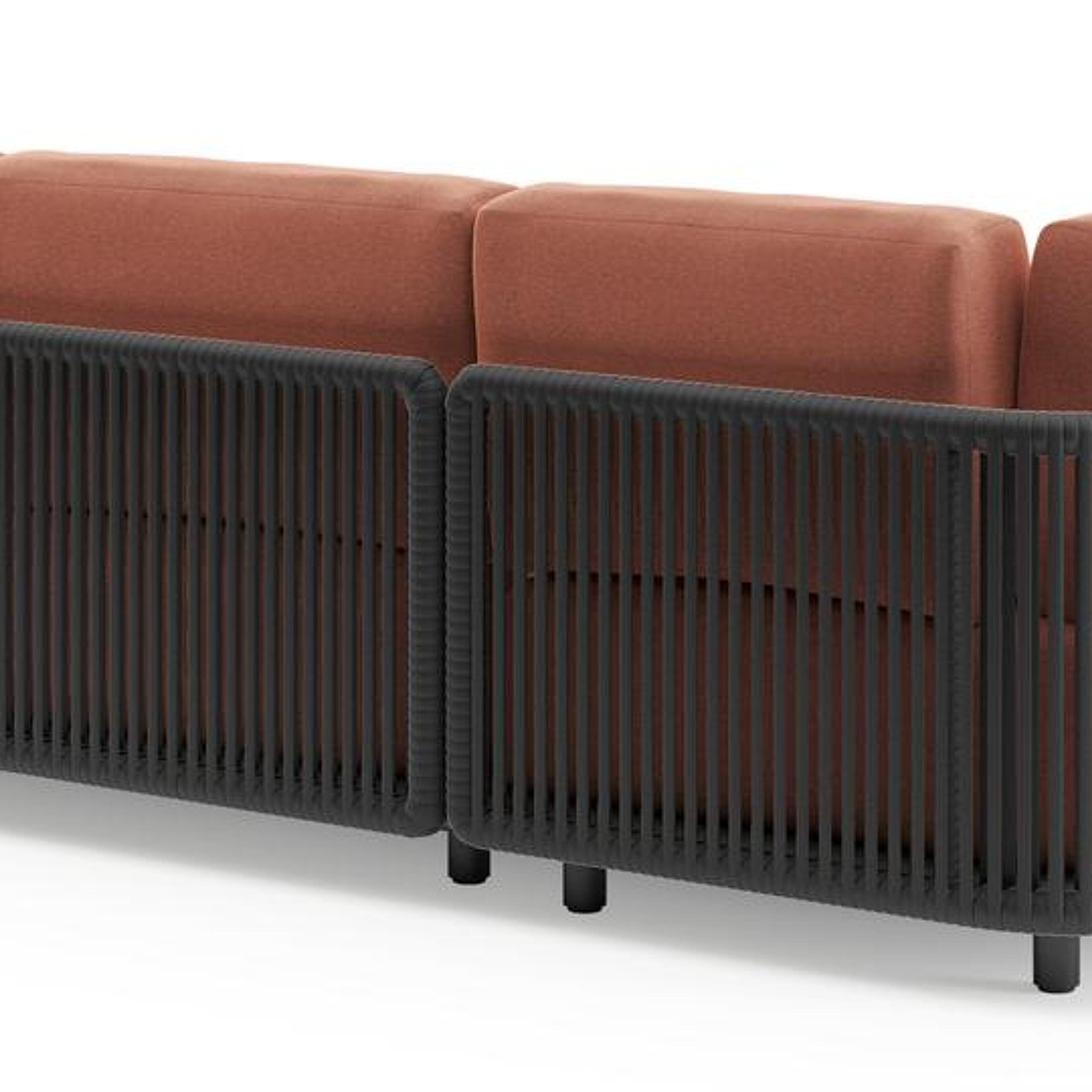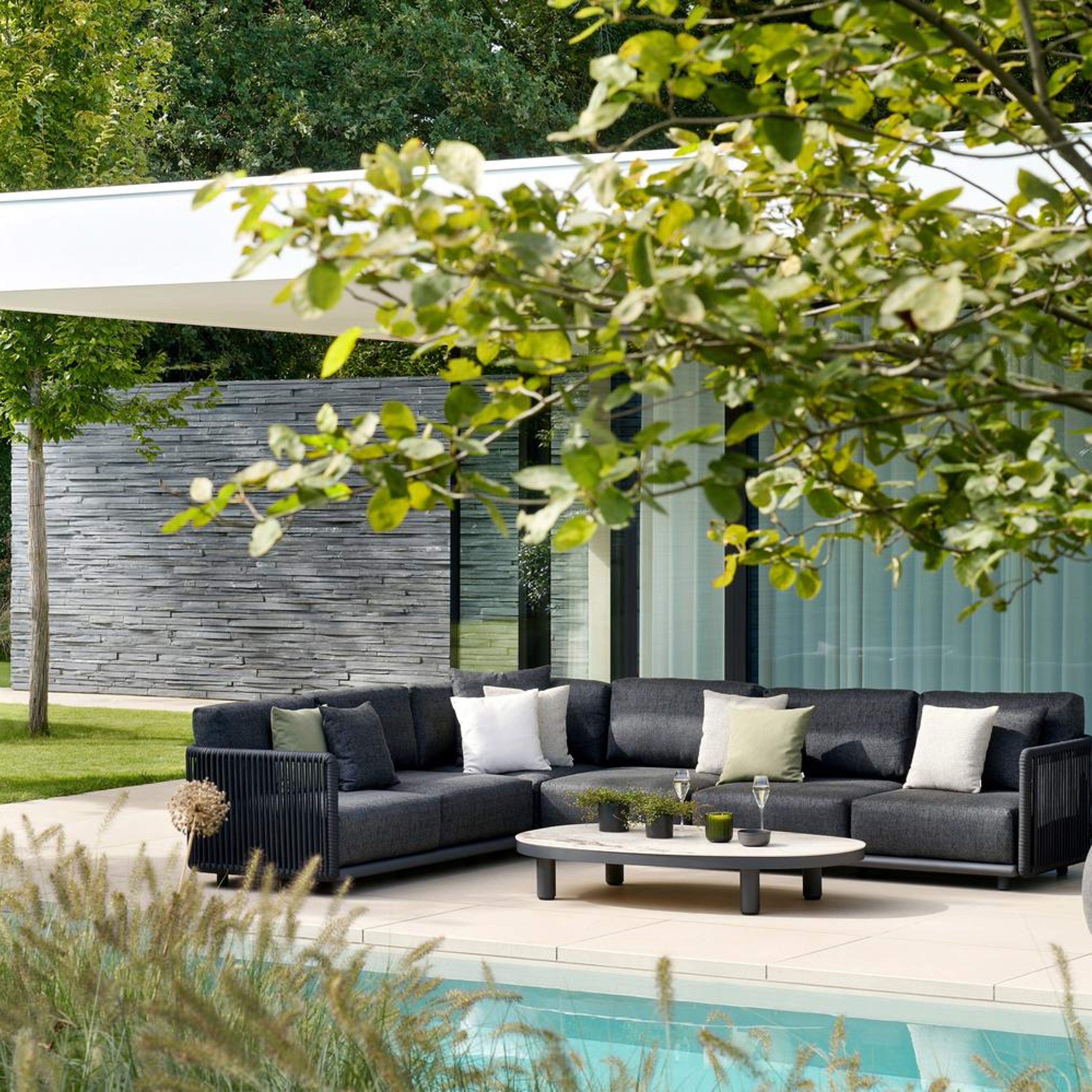 Organo loungehoek in zwart aluminium en zwart verticaal geweven luxe vlakke rope met heritage rust all weather Sunbrella® luxe kussen | Exterioo tuinmeubelen