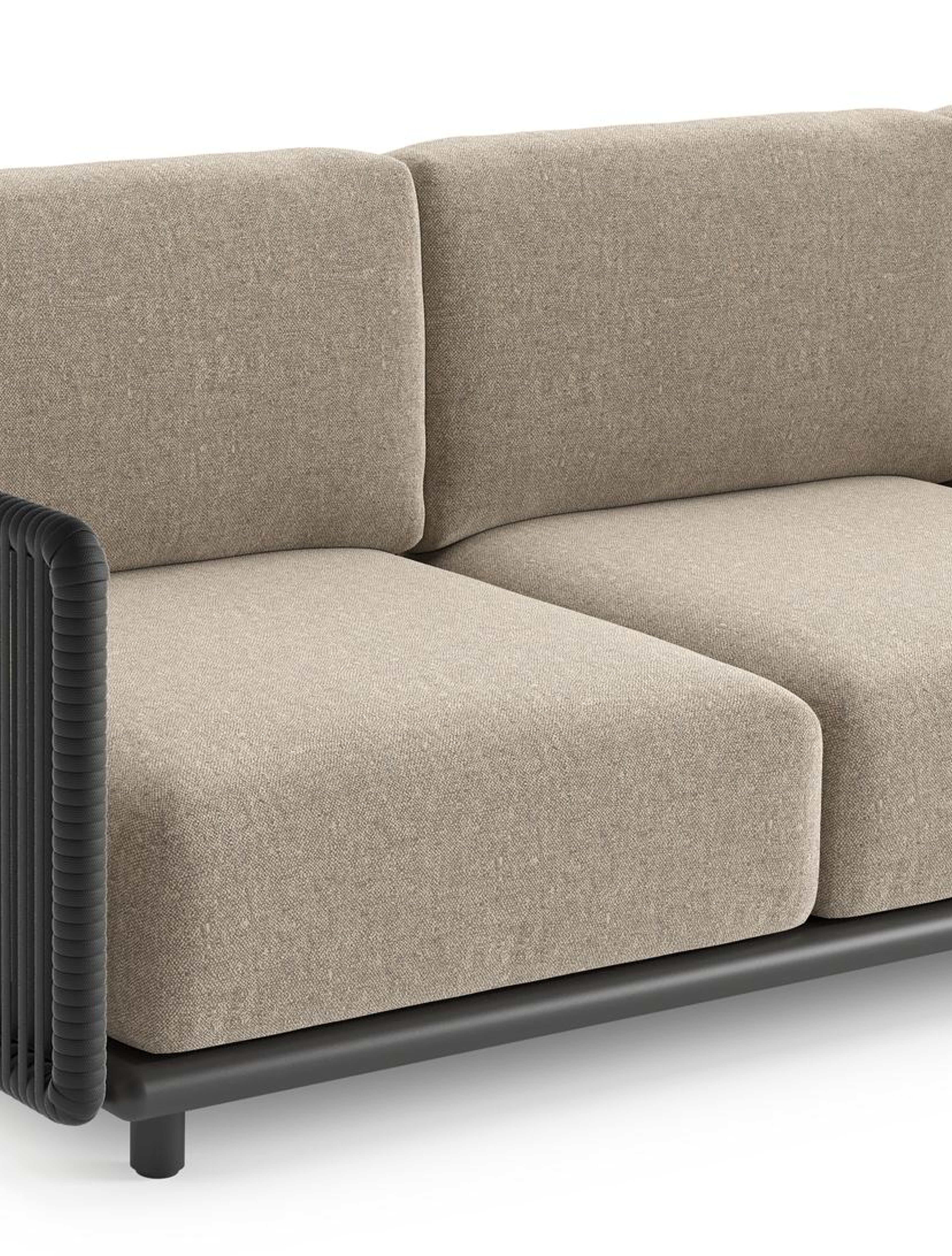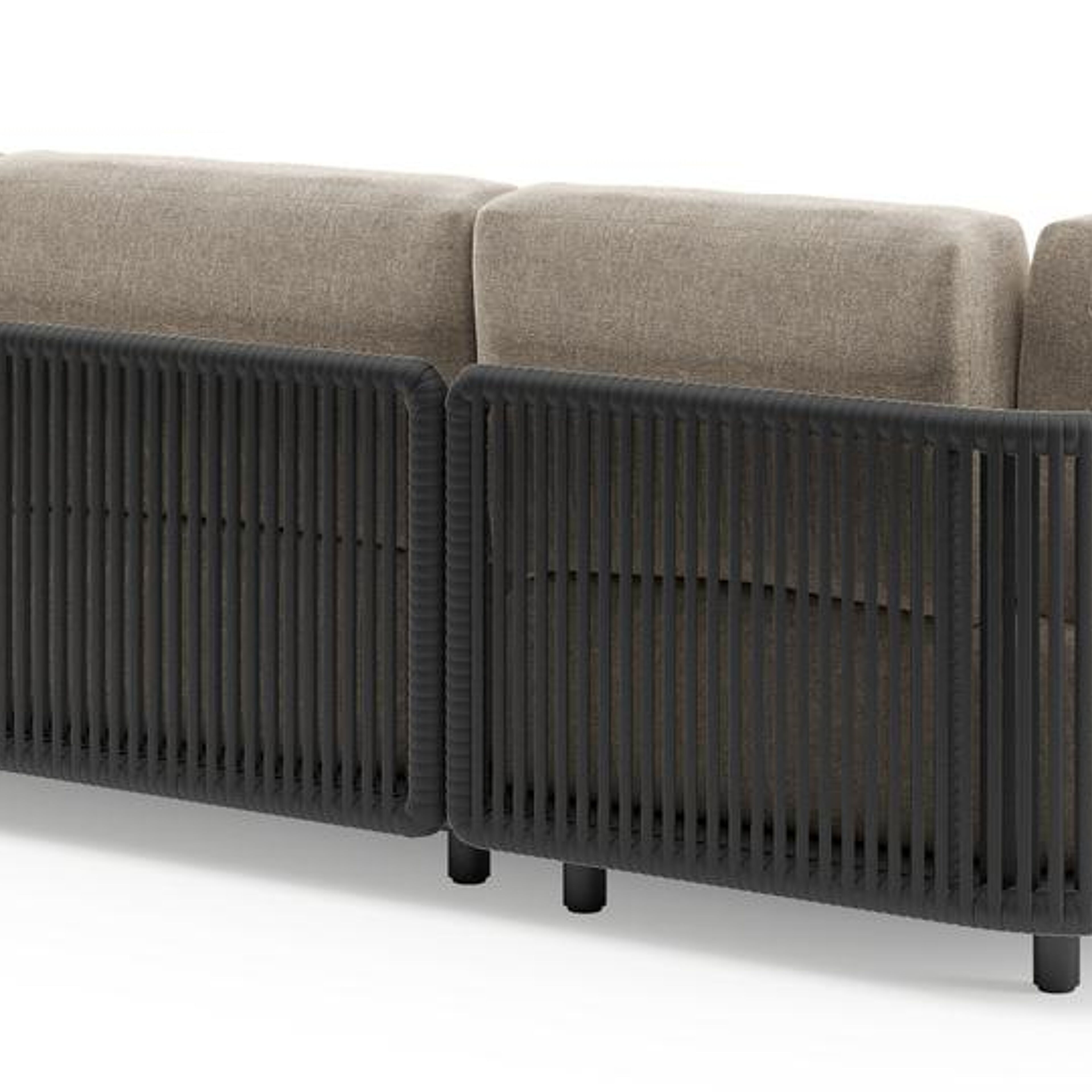 Organo loungehoek in zwart aluminium en zwart verticaal geweven luxe vlakke rope met chartres pewter all weather Sunbrella® luxe kussen | Exterioo tuinmeubelen