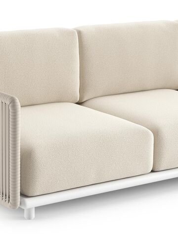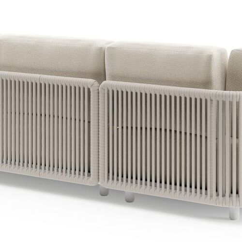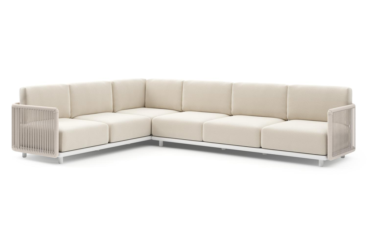 Organo loungehoek in wit aluminium en beige verticaal geweven luxe vlakke rope met althea off white All Weather Cosytica kussens | Exterioo