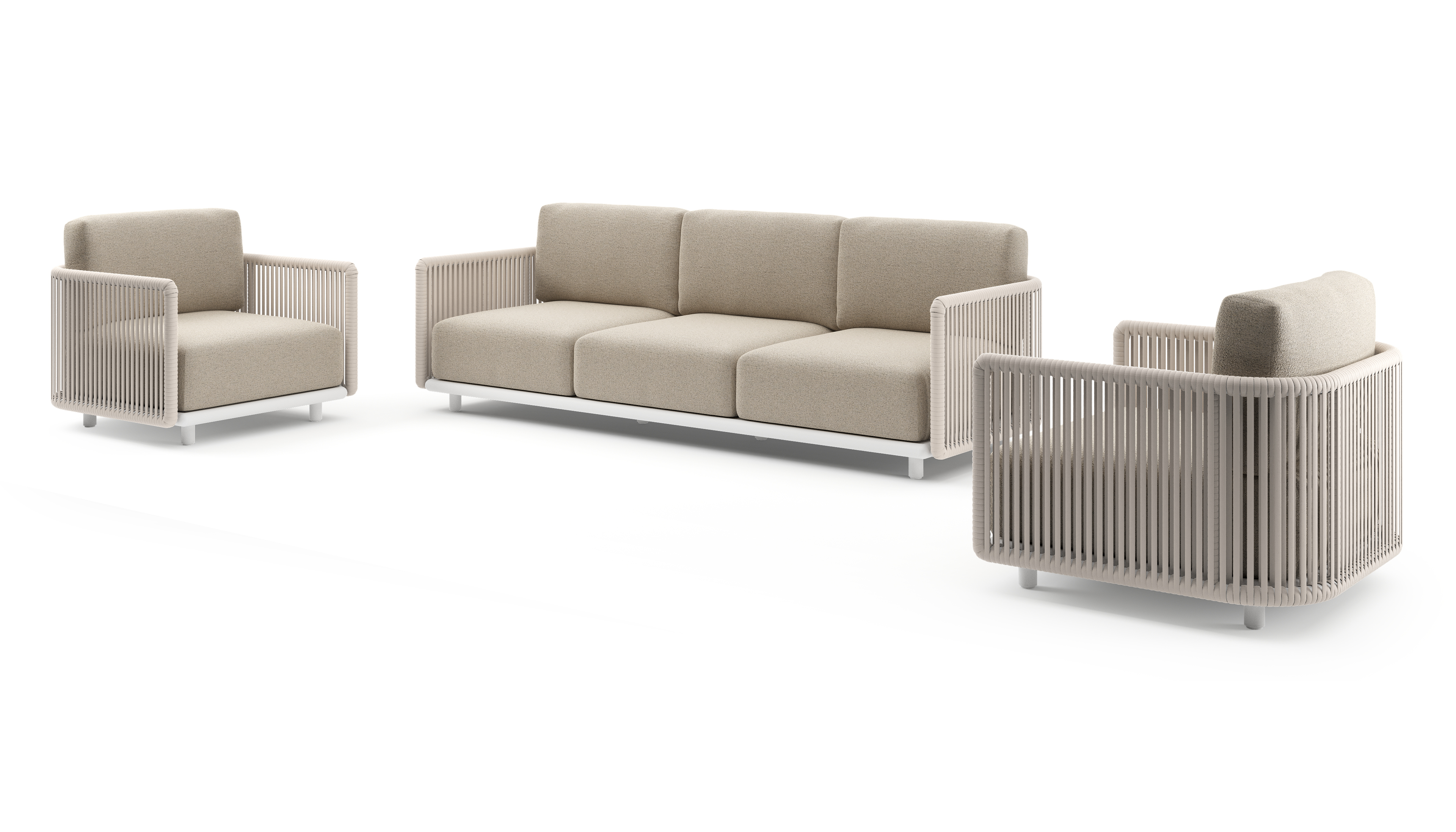 Organo loungeset in wit aluminium en beige verticaal geweven luxe vlakke rope met marbella beige all weather Cosytica kussen | Exterioo tuinmeubelen