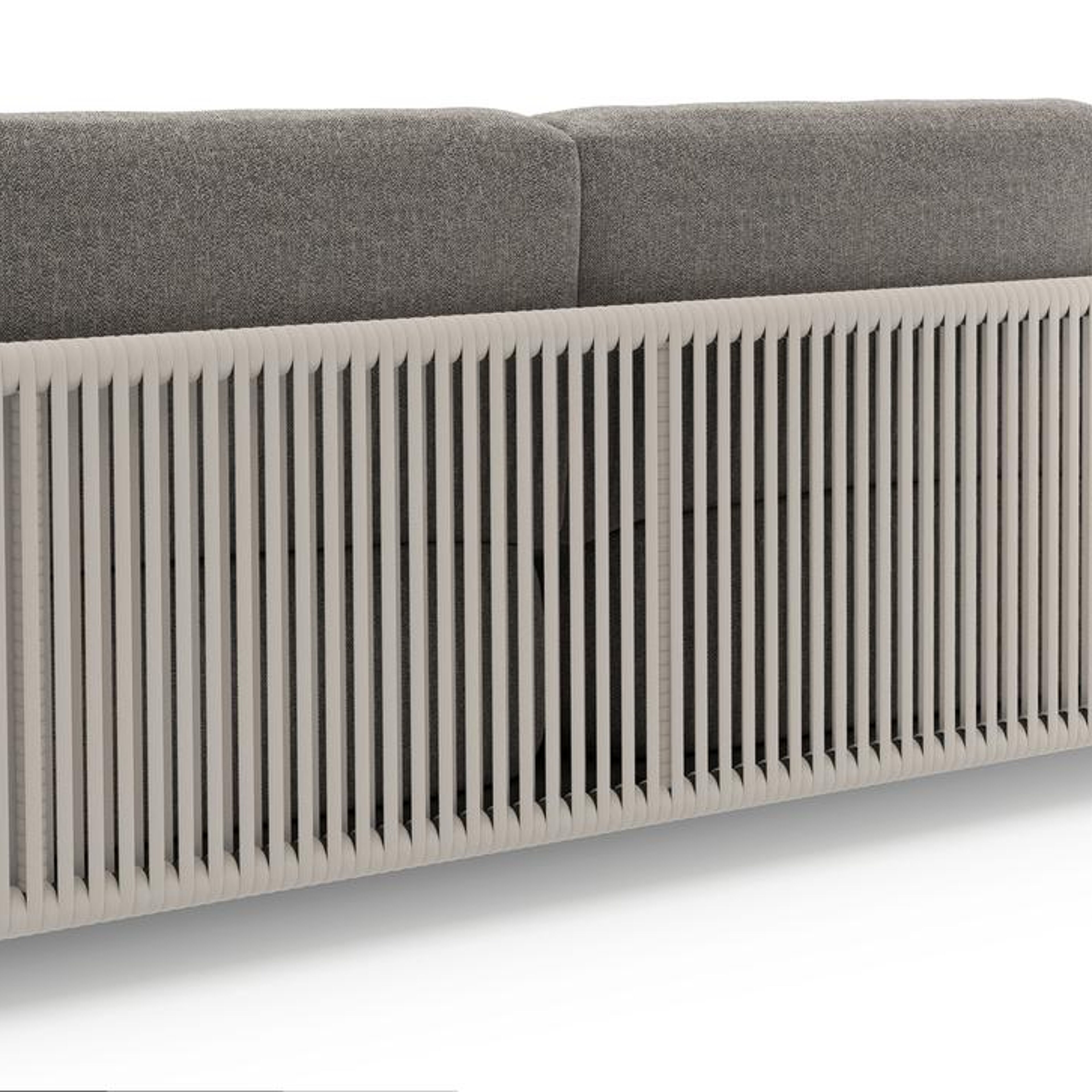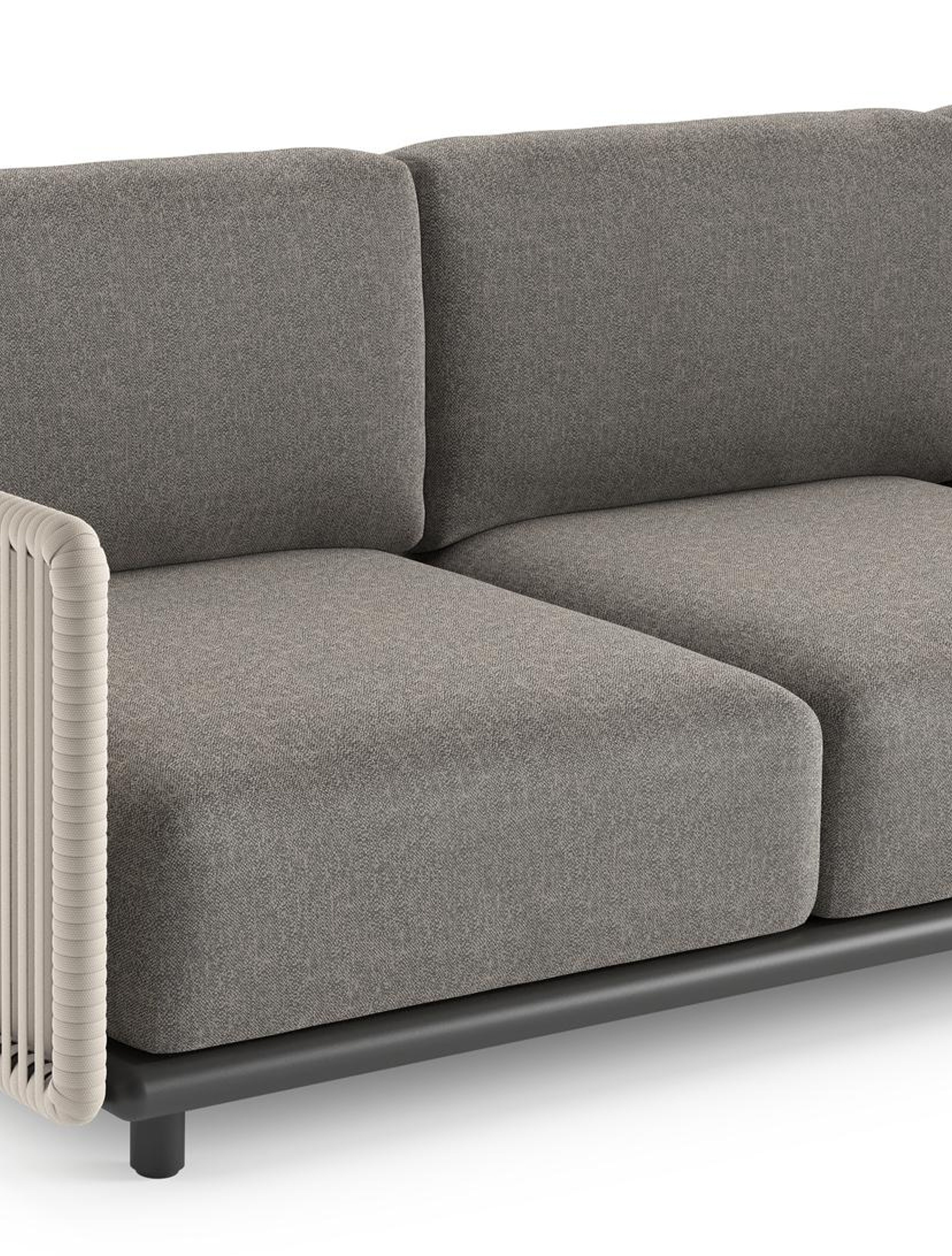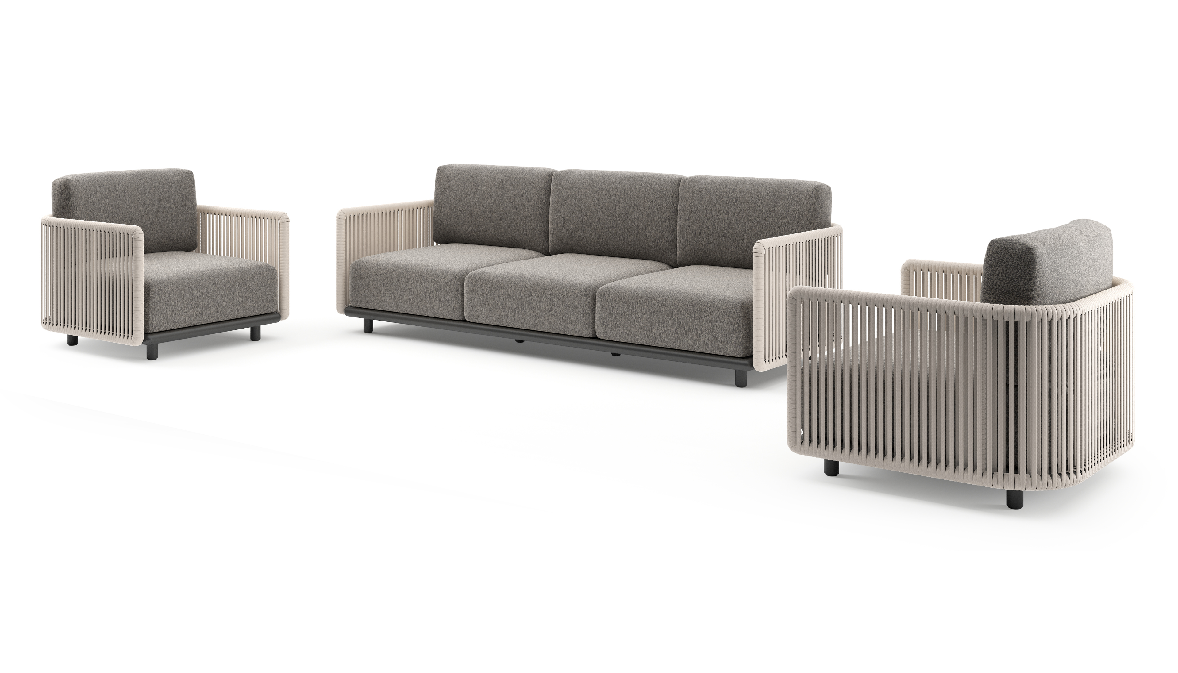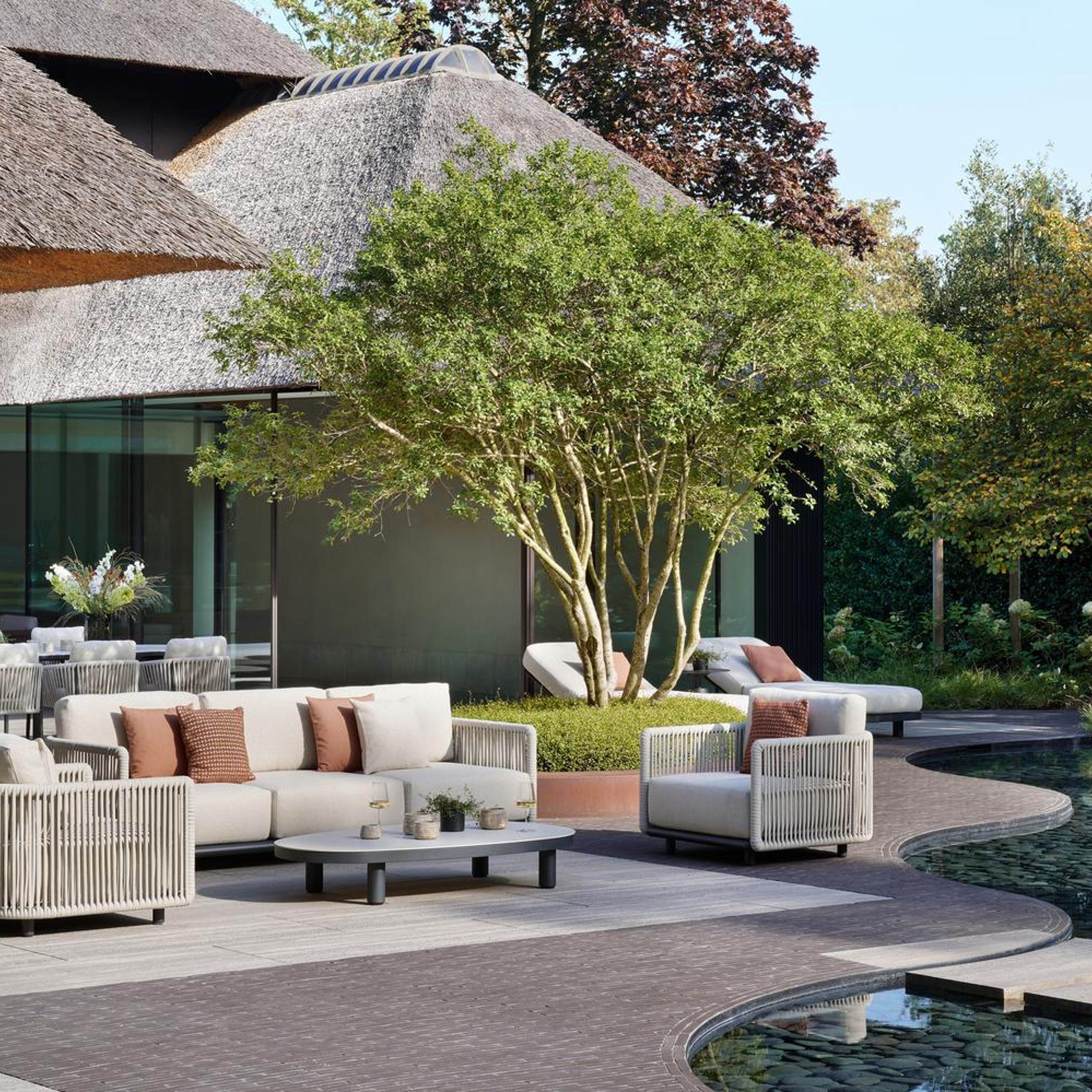 Organo loungeset in zwart aluminium en beige verticaal geweven luxe vlakke rope met chartres drizzle all weather Sunbrella® luxe kussen | Exterioo tuinmeubelen