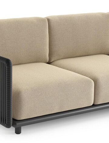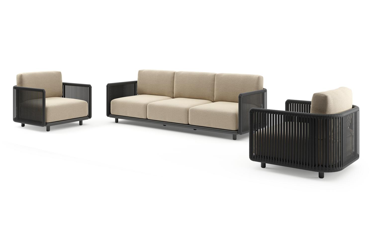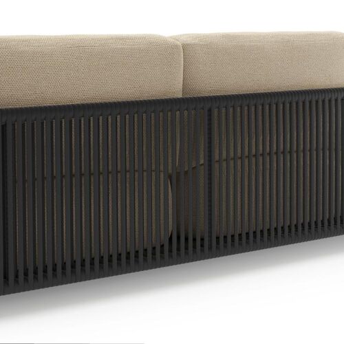 Organo loungeset in zwart aluminium en zwart verticaal geweven luxe vlakke rope met althea camel all weather Cosytica kussen | Exterioo