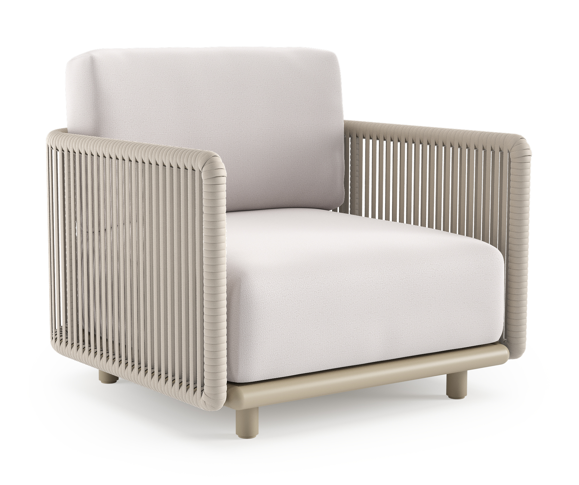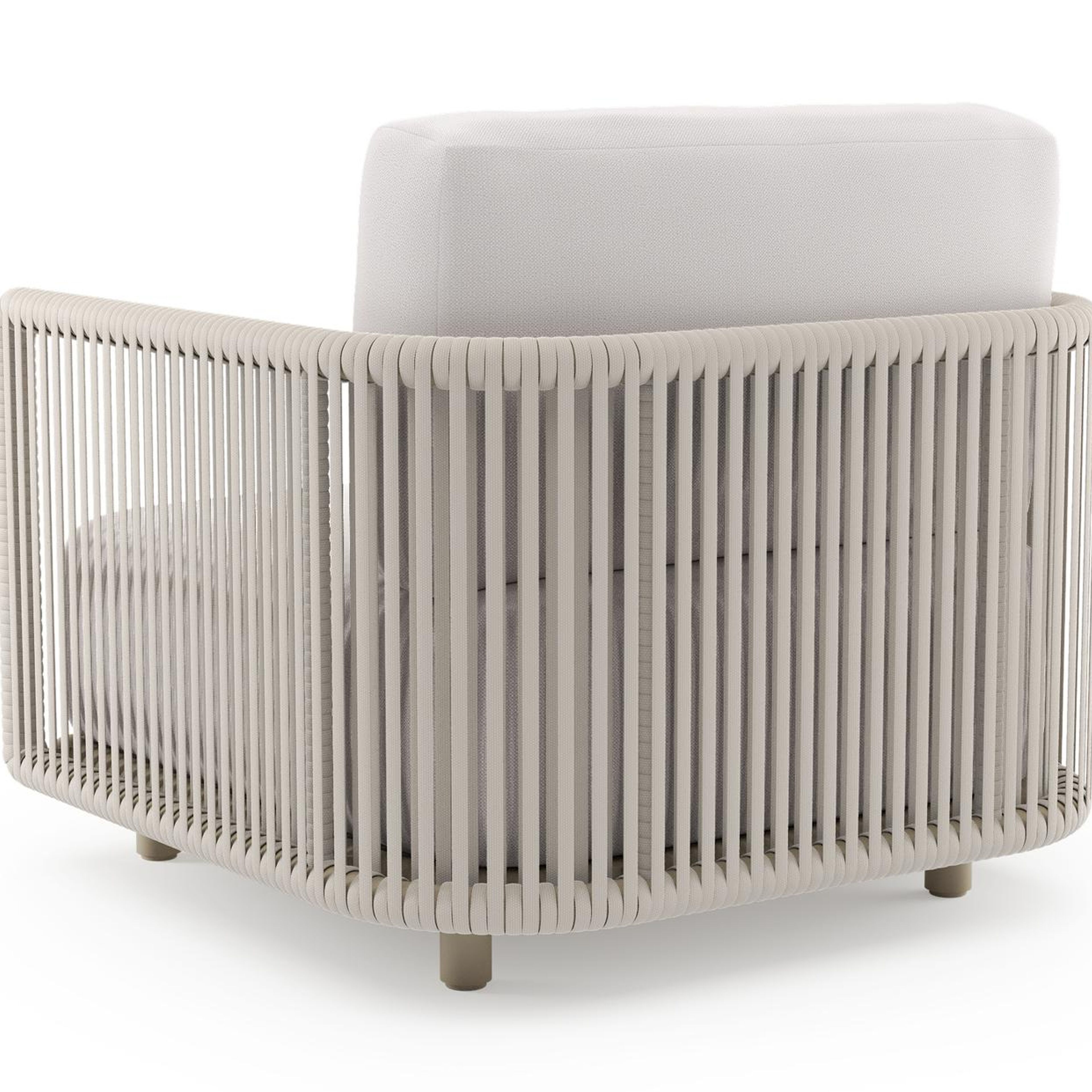 Organo loungestoel in beige aluminium en beige verticaal geweven luxe vlakke rope met savane whisper all weather Sunbrella® luxe kussen | Exterioo tuinmeubelen