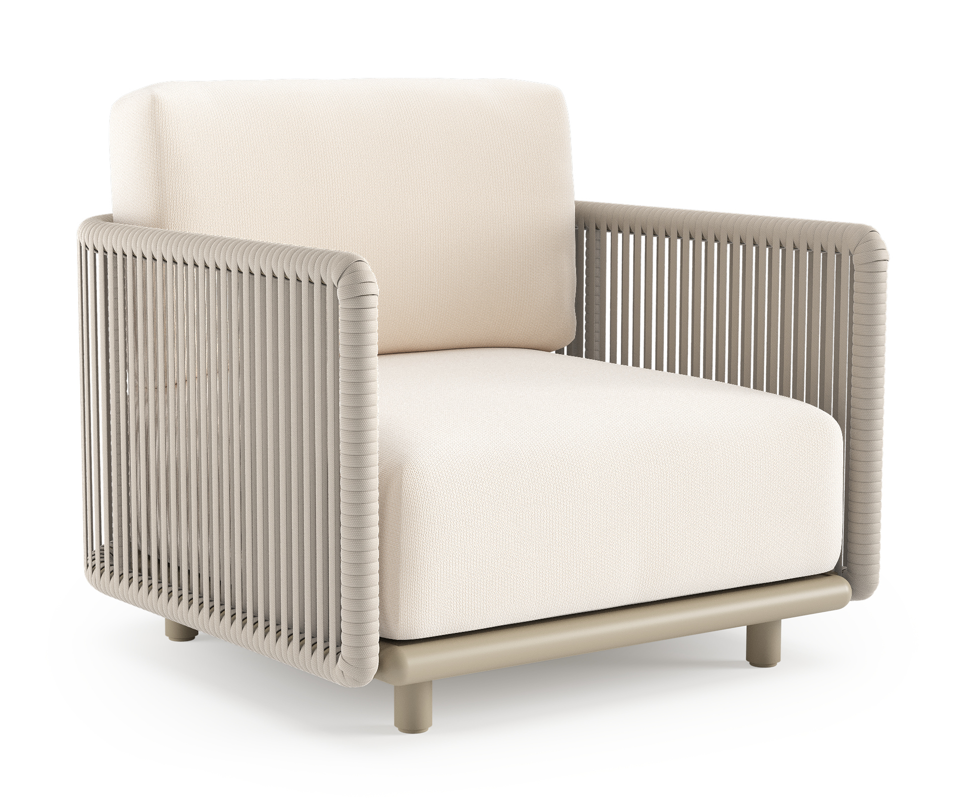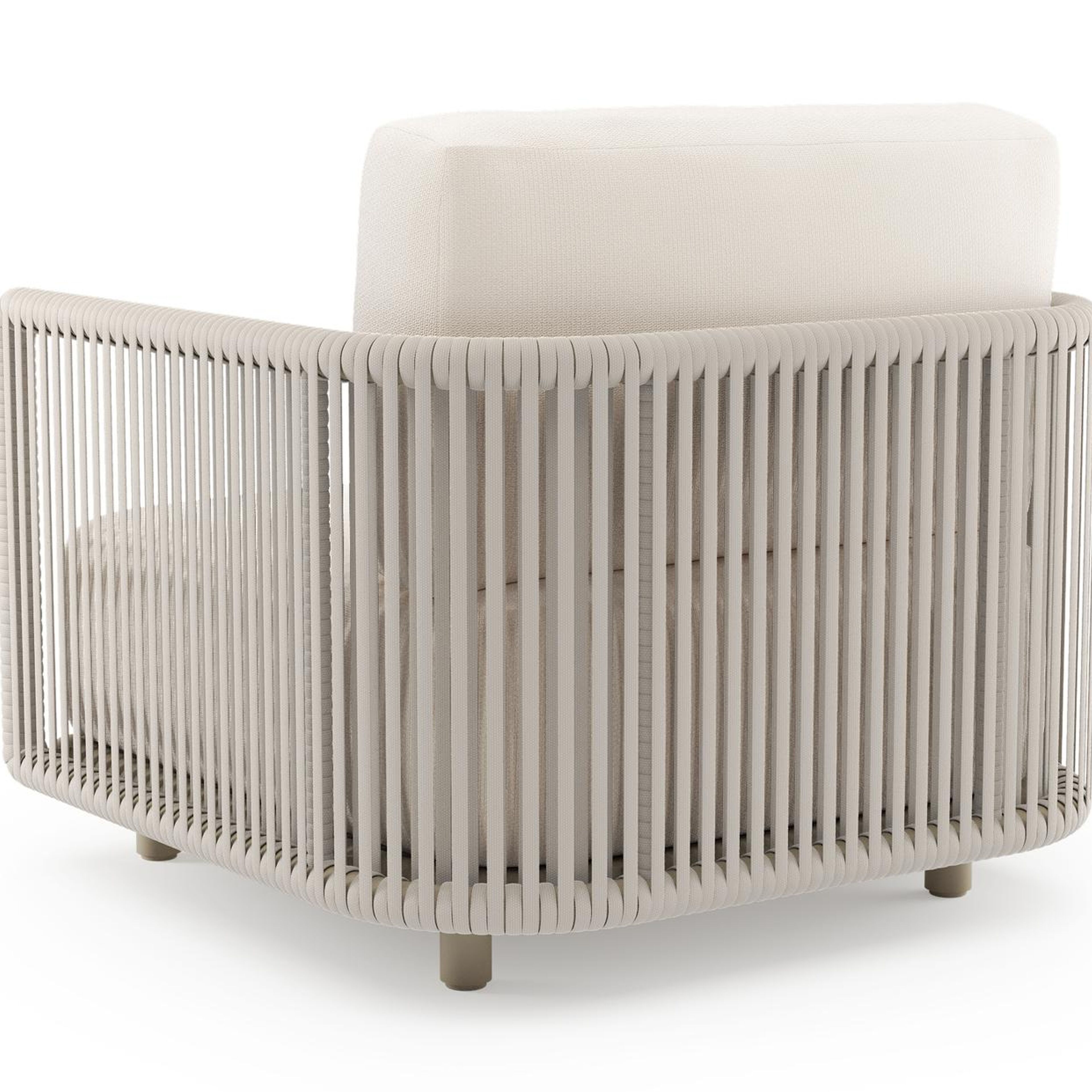 Organo loungestoel in beige aluminium en beige verticaal geweven luxe vlakke rope met lopi snow all weather Sunbrella® luxe kussen | Exterioo tuinmeubelen