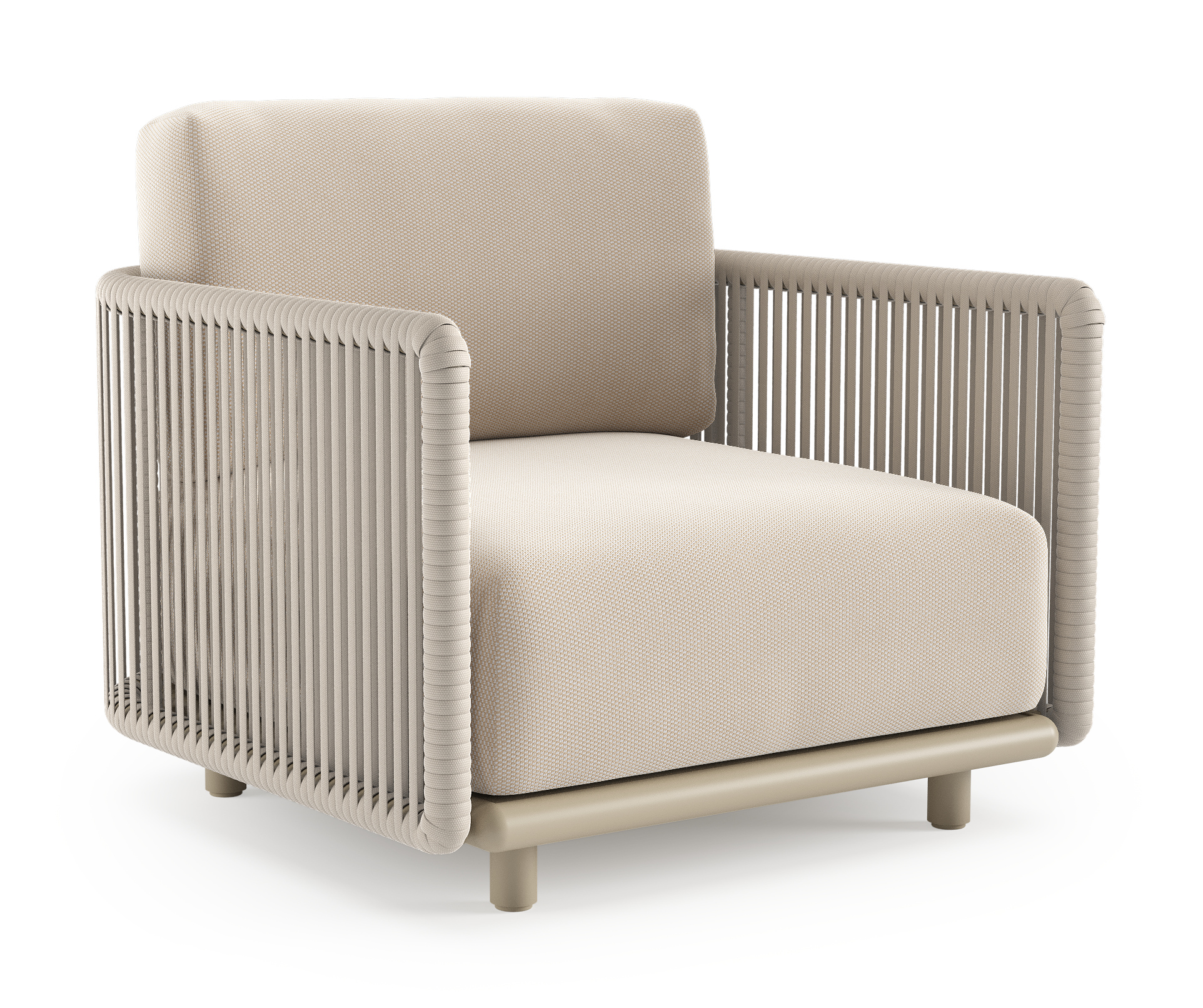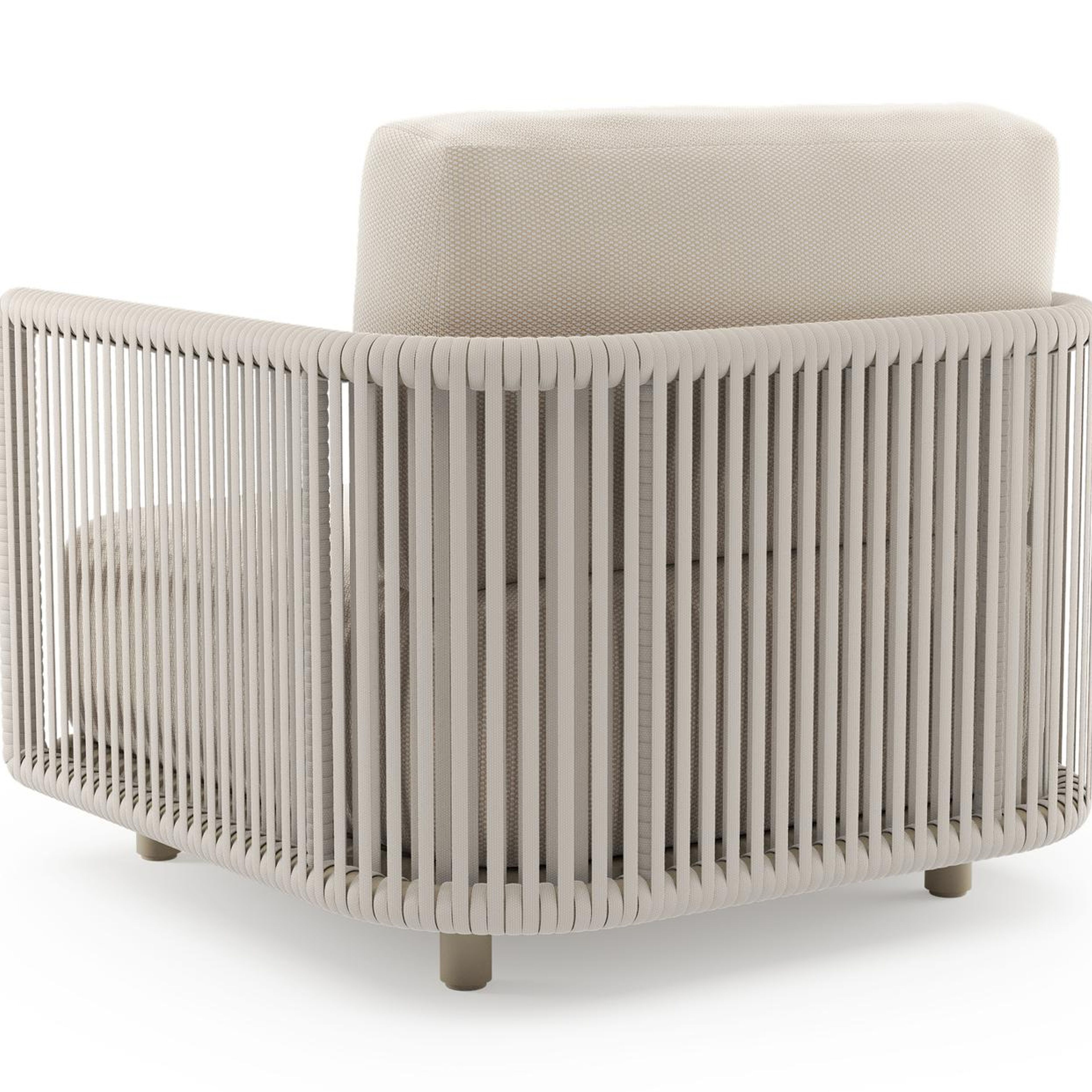 Organo loungestoel in beige aluminium en beige verticaal geweven luxe vlakke rope met lopi antique all weather Sunbrella® luxe kussen | Exterioo tuinmeubelen
