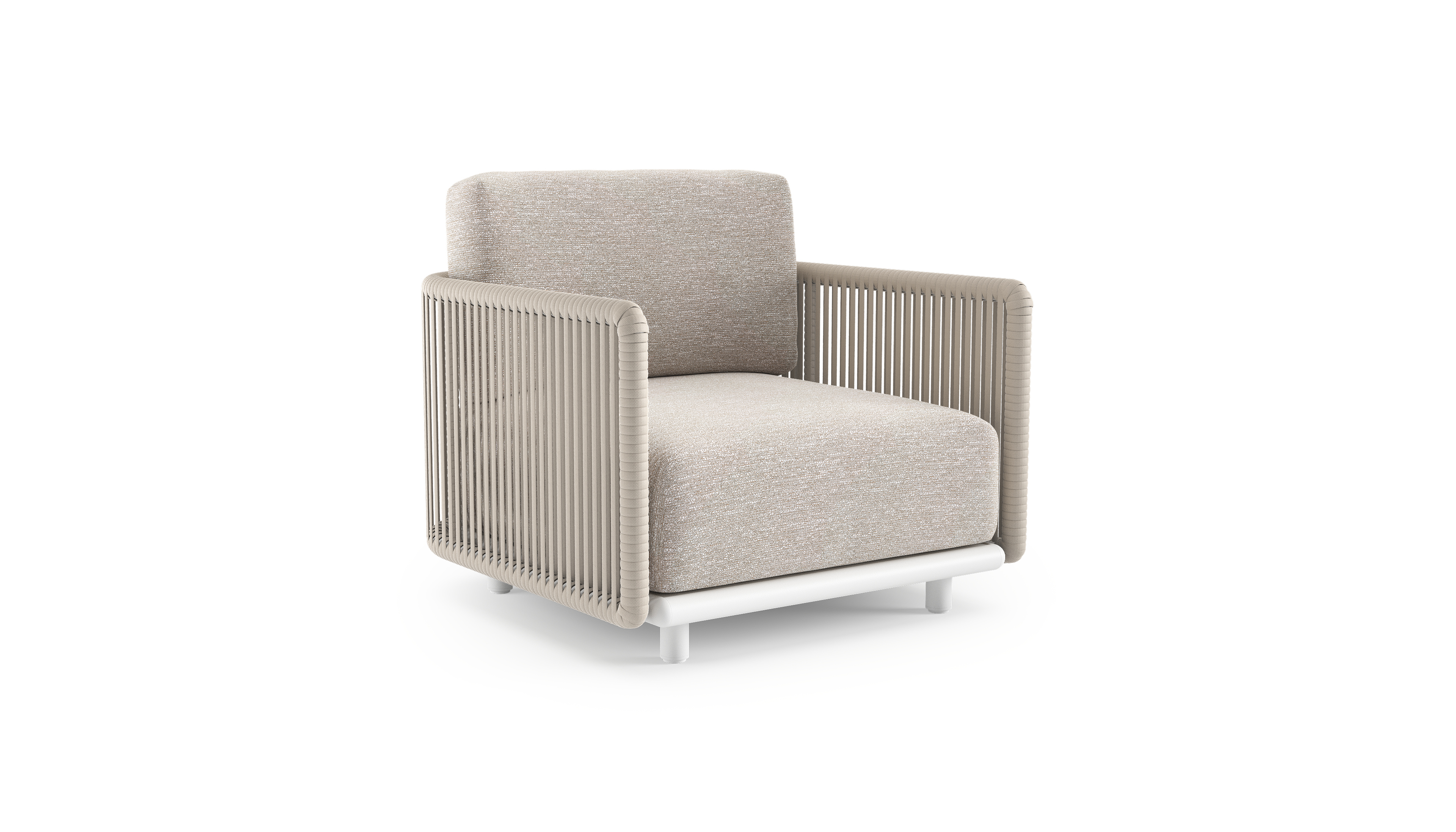 Organo loungestoel in wit aluminium en beige verticaal geweven luxe vlakke rope met tundra sand all weather Sunbrella® luxe kussen | Exterioo tuinmeubelen