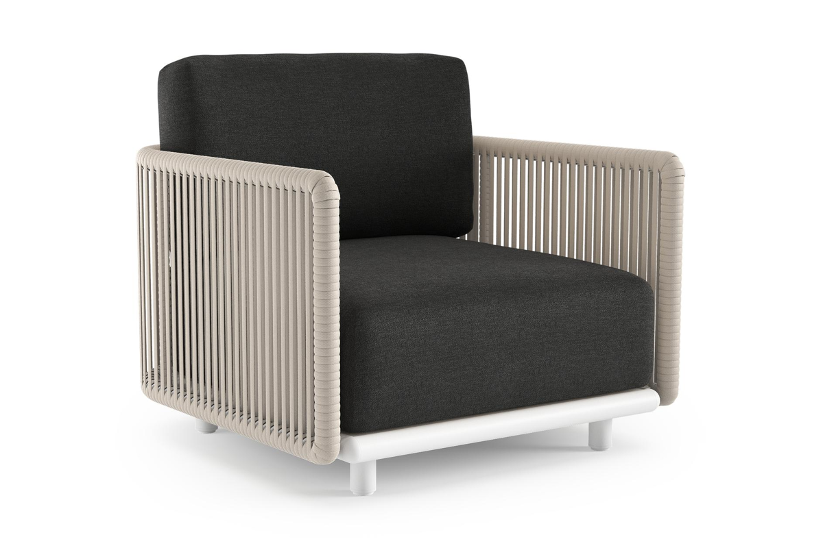 Organo loungestoel in wit aluminium en beige verticaal geweven luxe vlakke rope met chartres sooty all weather Sunbrella® luxe kussen | Exterioo