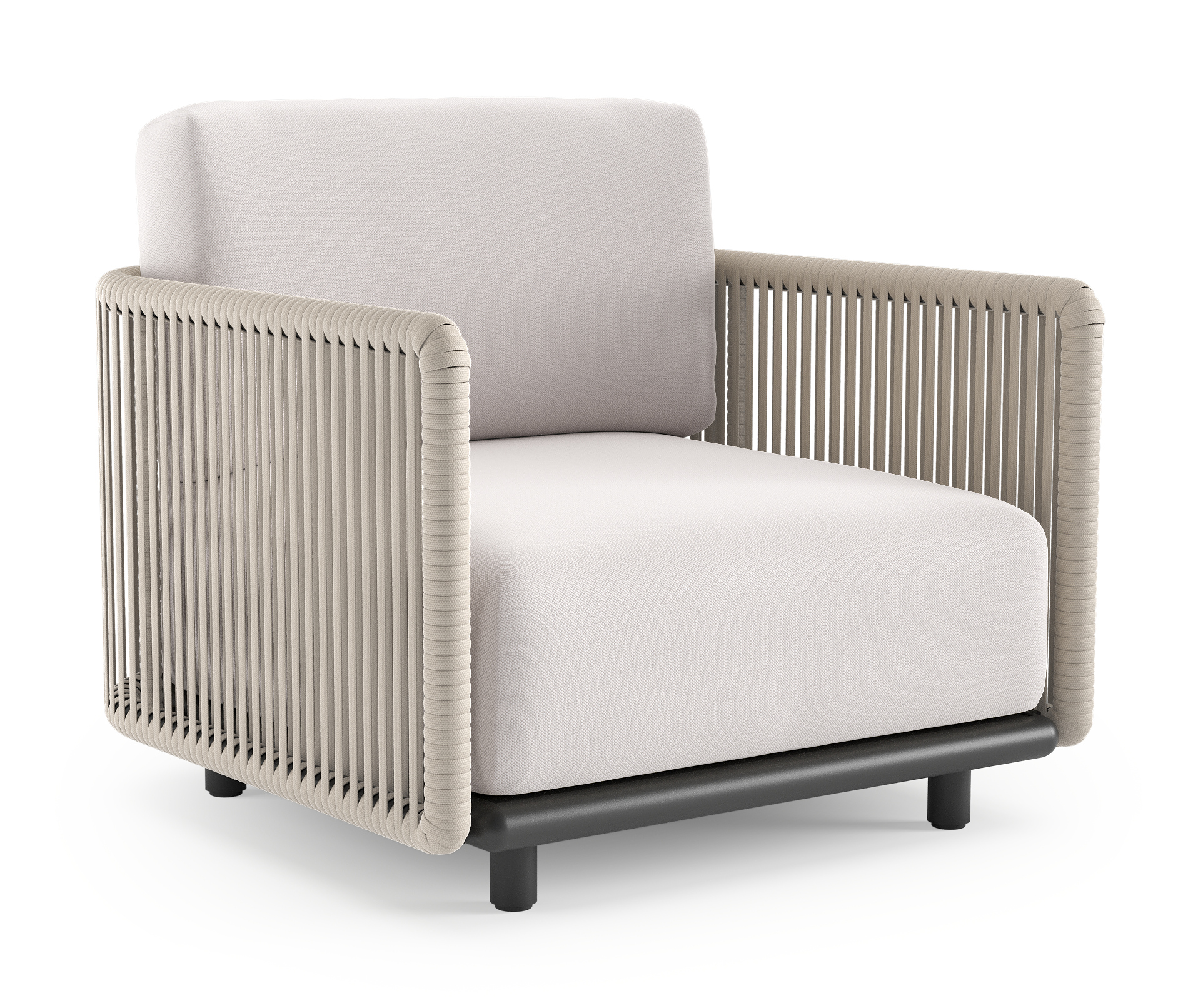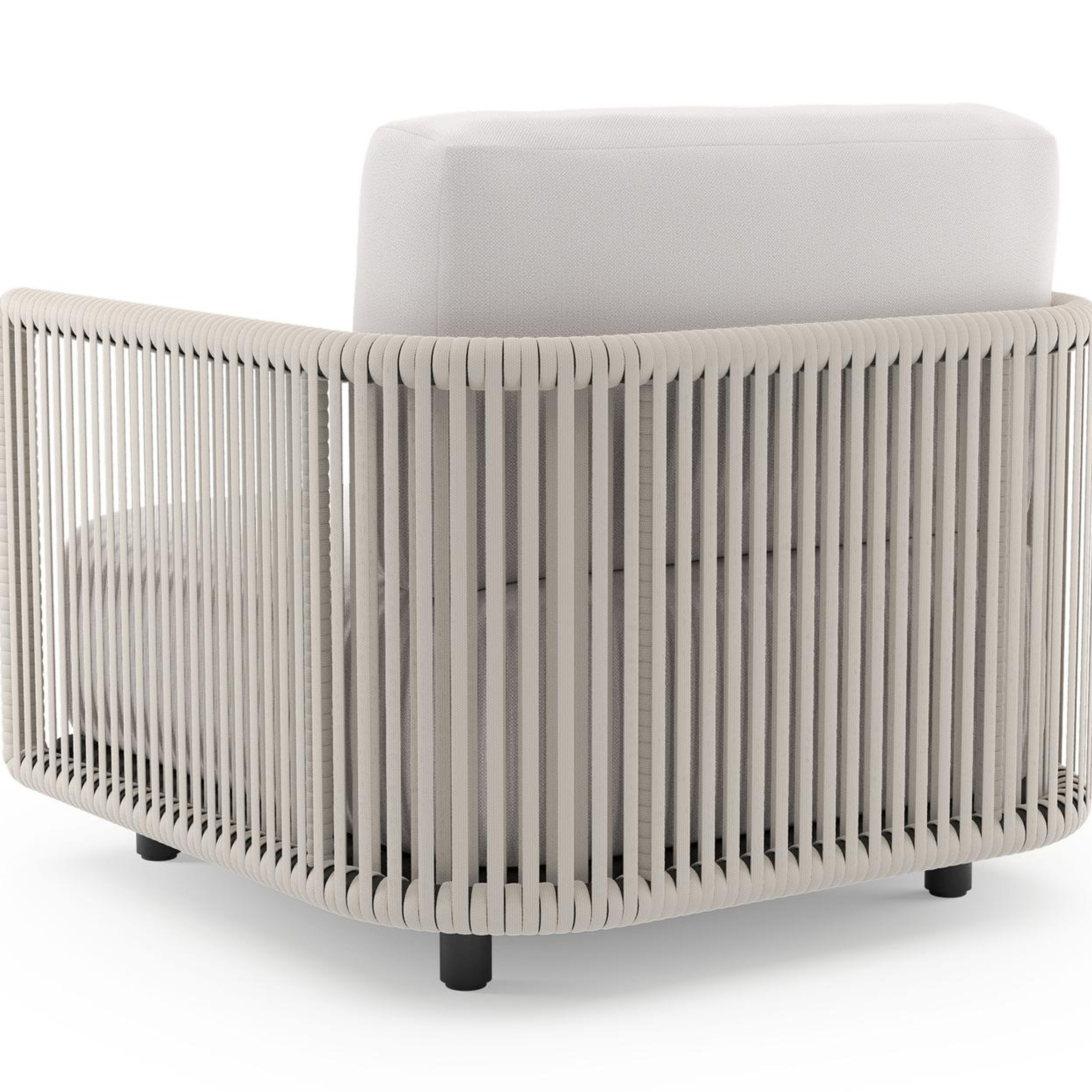 Organo loungestoel in zwart aluminium en beige verticaal geweven luxe vlakke rope met savane whisper all weather Sunbrella® luxe kussen | Exterioo tuinmeubelen