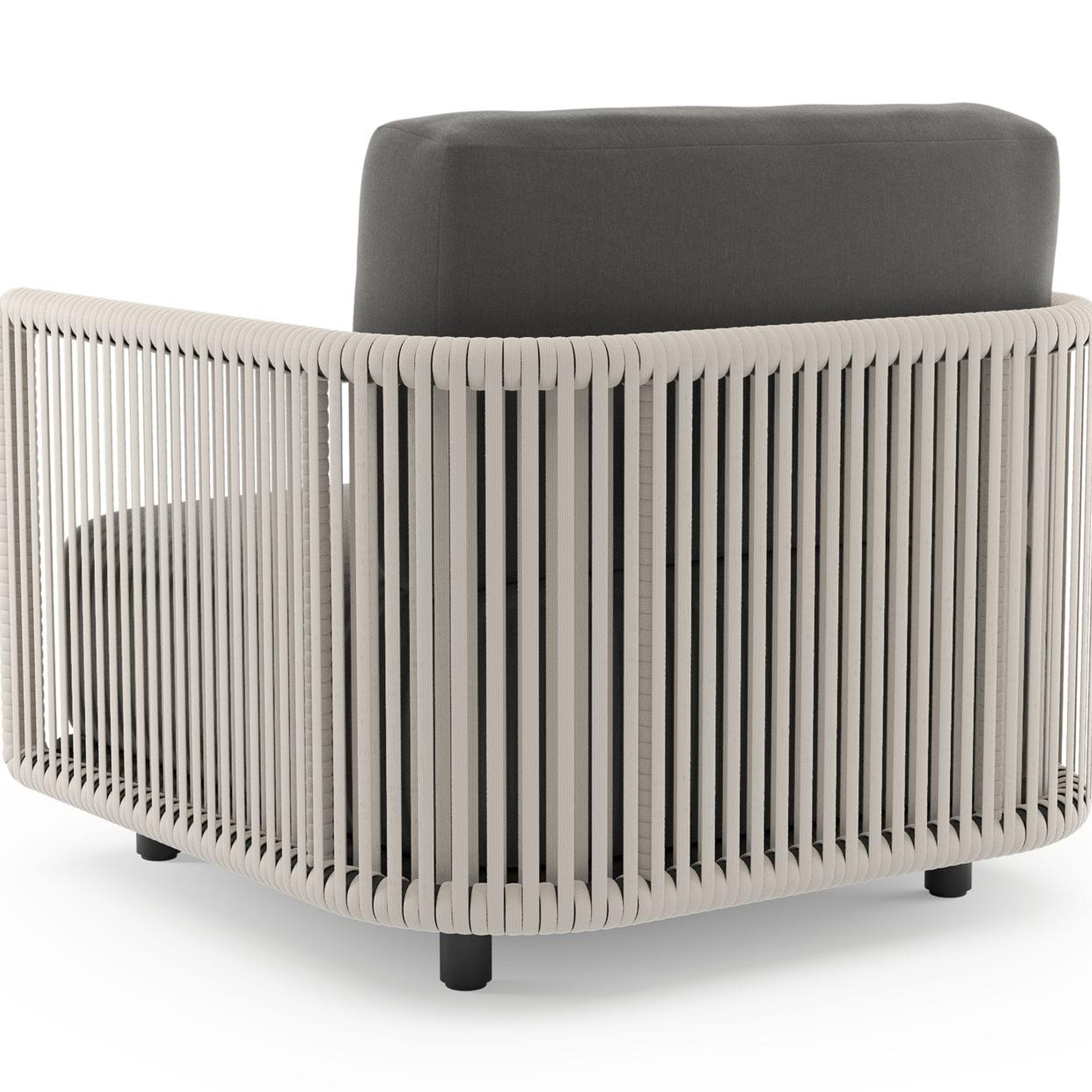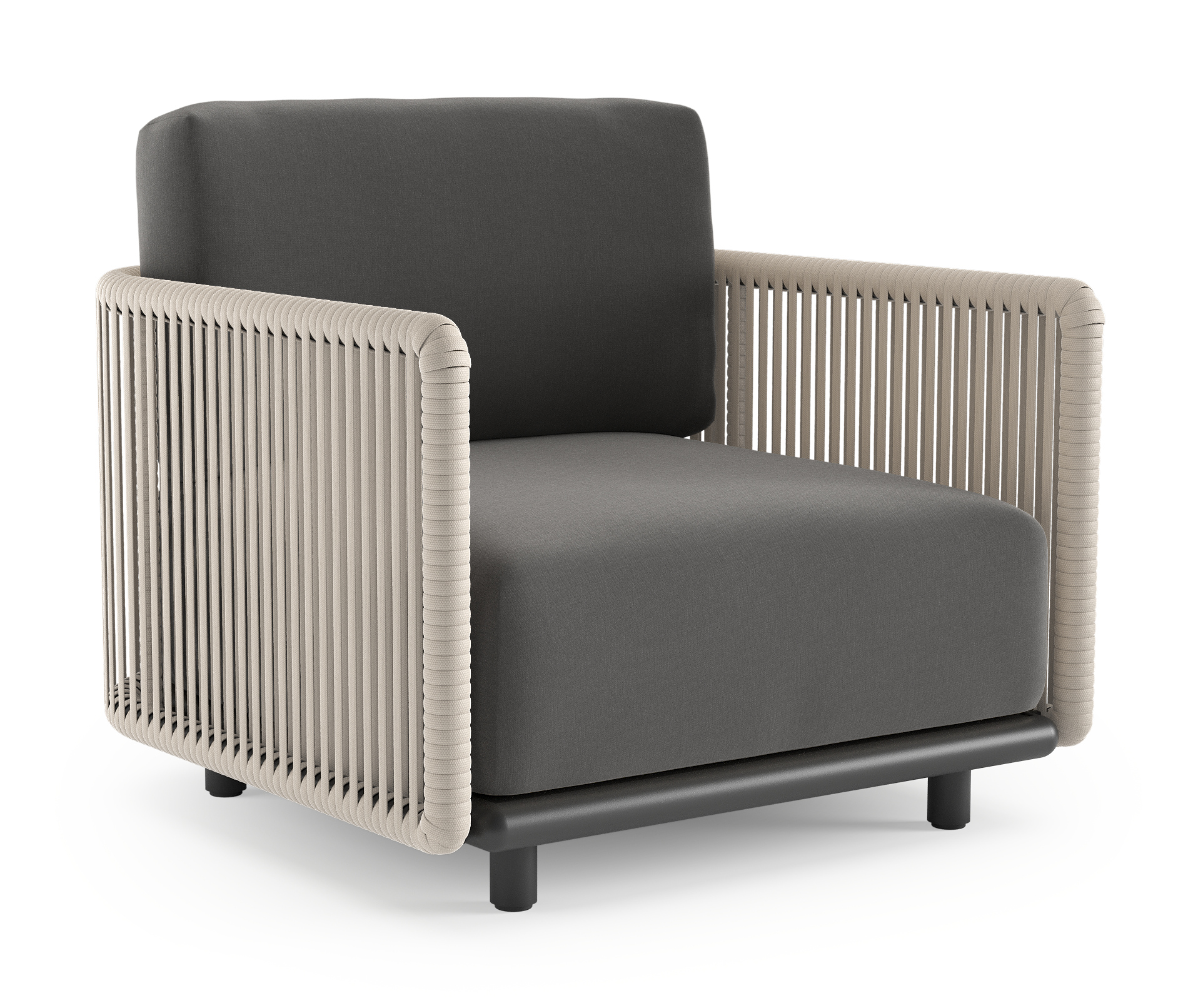 Organo loungestoel in zwart aluminium en beige verticaal geweven luxe vlakke rope met natte charcoal chine all weather Sunbrella® luxe kussen | Exterioo tuinmeubelen