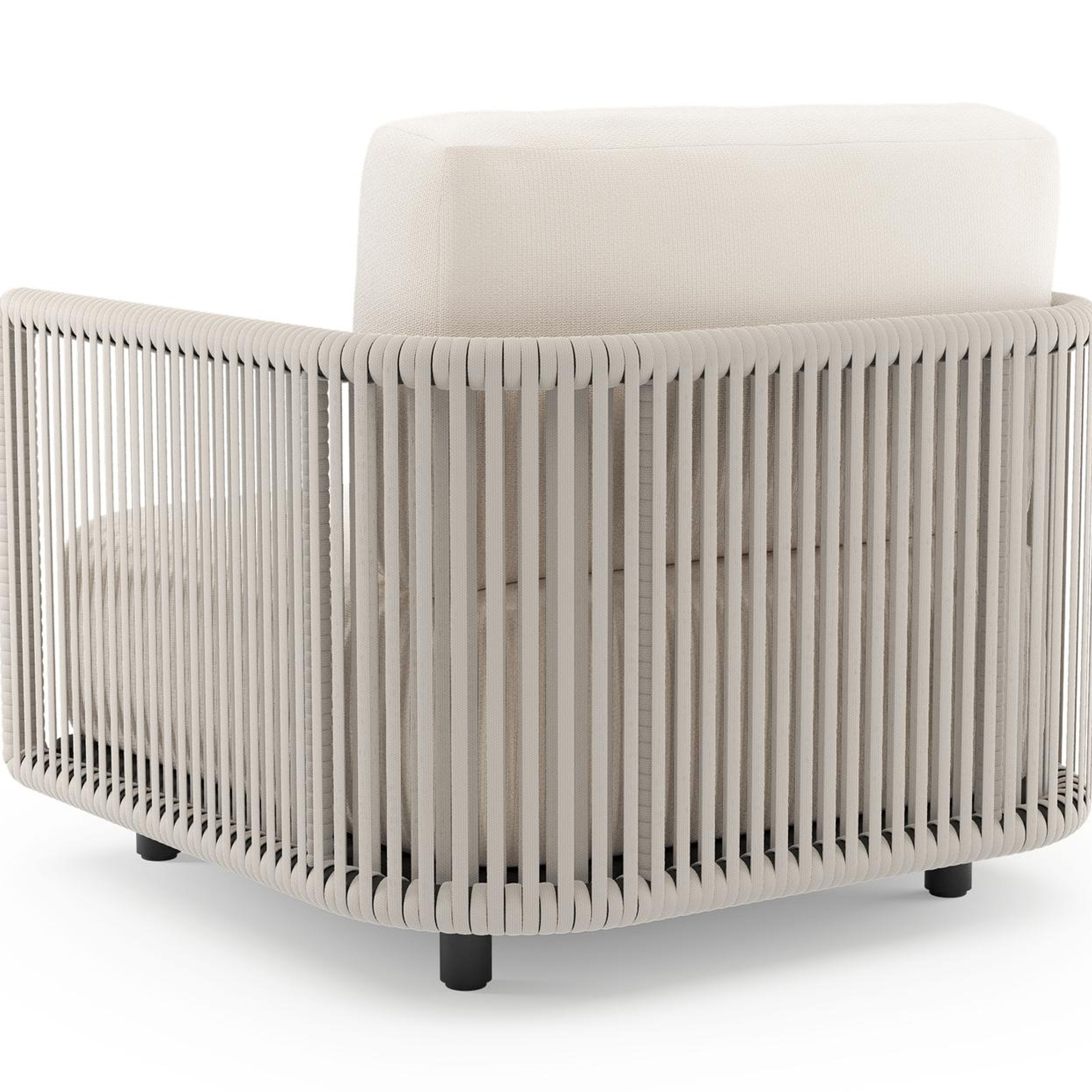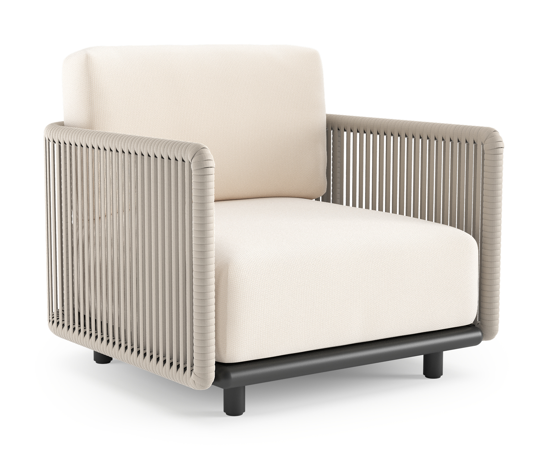 Organo loungestoel in zwart aluminium en beige verticaal geweven luxe vlakke rope met lopi snow all weather Sunbrella® luxe kussen | Exterioo tuinmeubelen