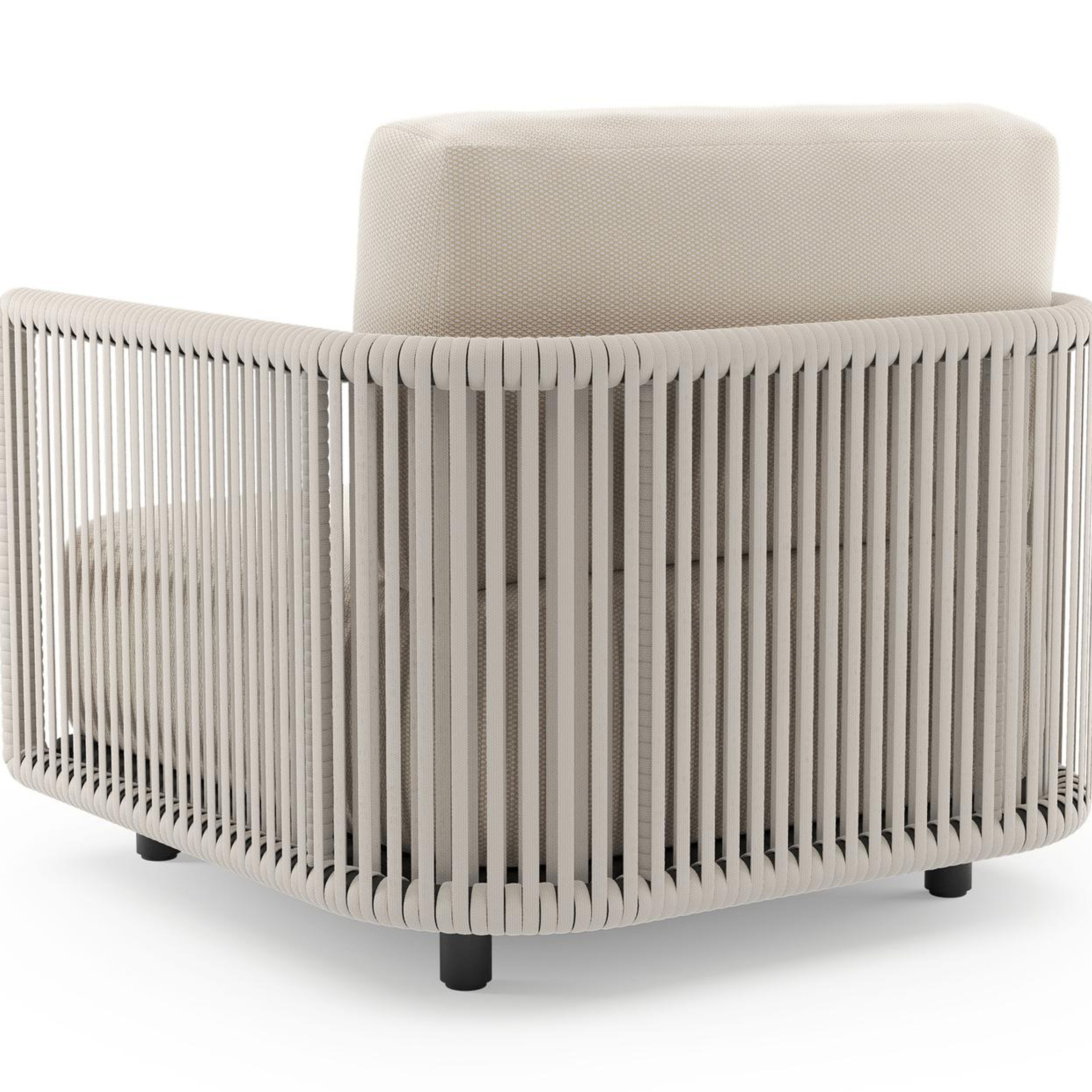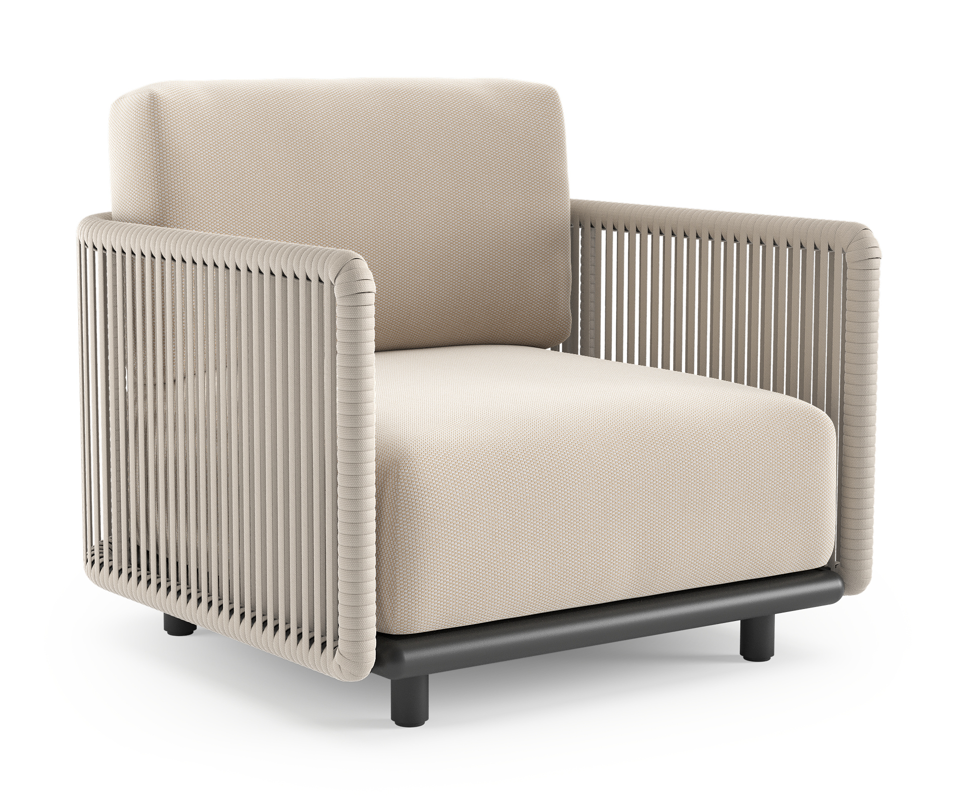 Organo loungestoel in zwart aluminium en beige verticaal geweven luxe vlakke rope met lopi antique all weather Sunbrella® luxe kussen | Exterioo tuinmeubelen