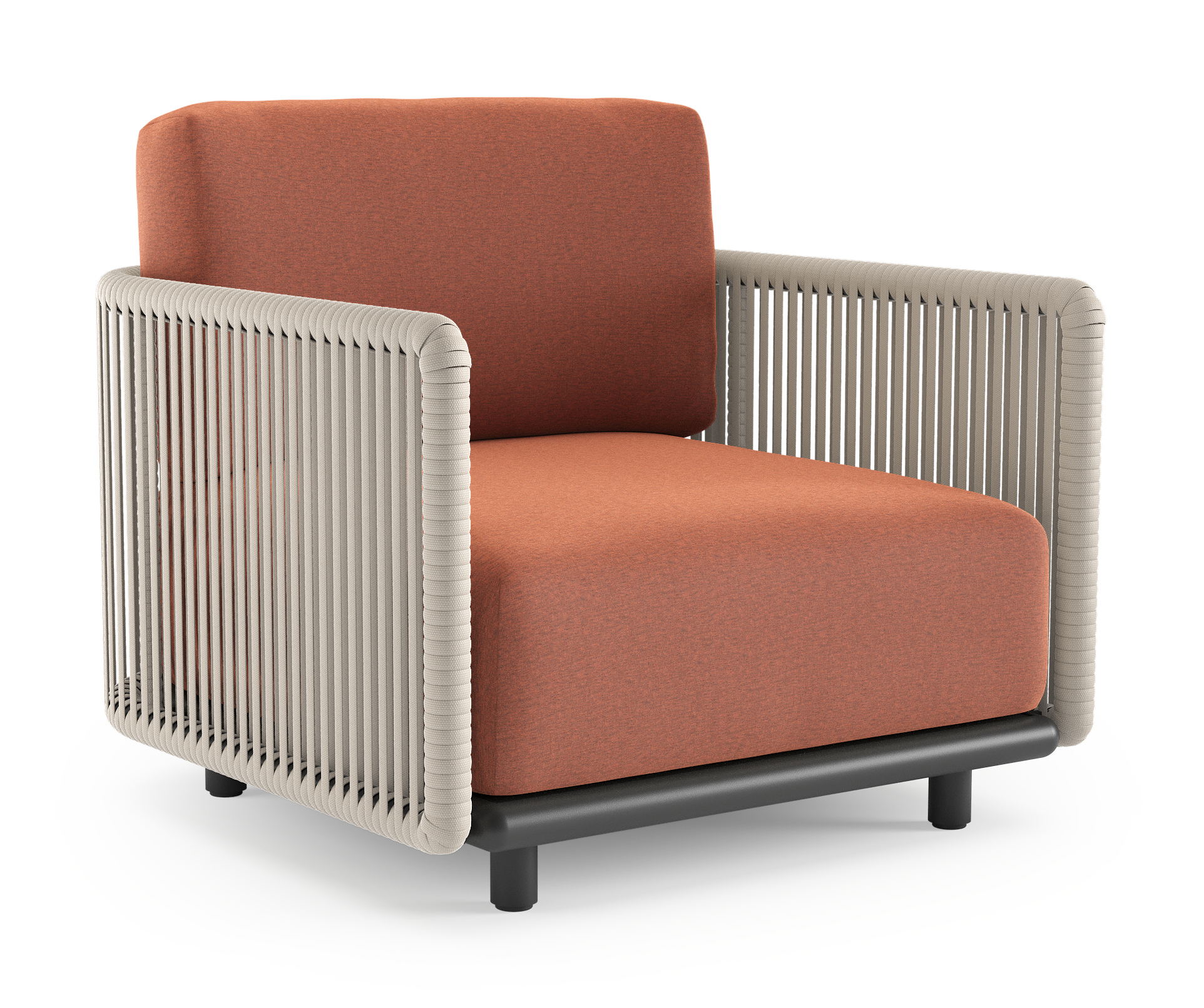 Organo loungestoel in zwart aluminium en beige verticaal geweven luxe vlakke rope met heritage rust all weather Sunbrella® luxe kussen | Exterioo tuinmeubelen
