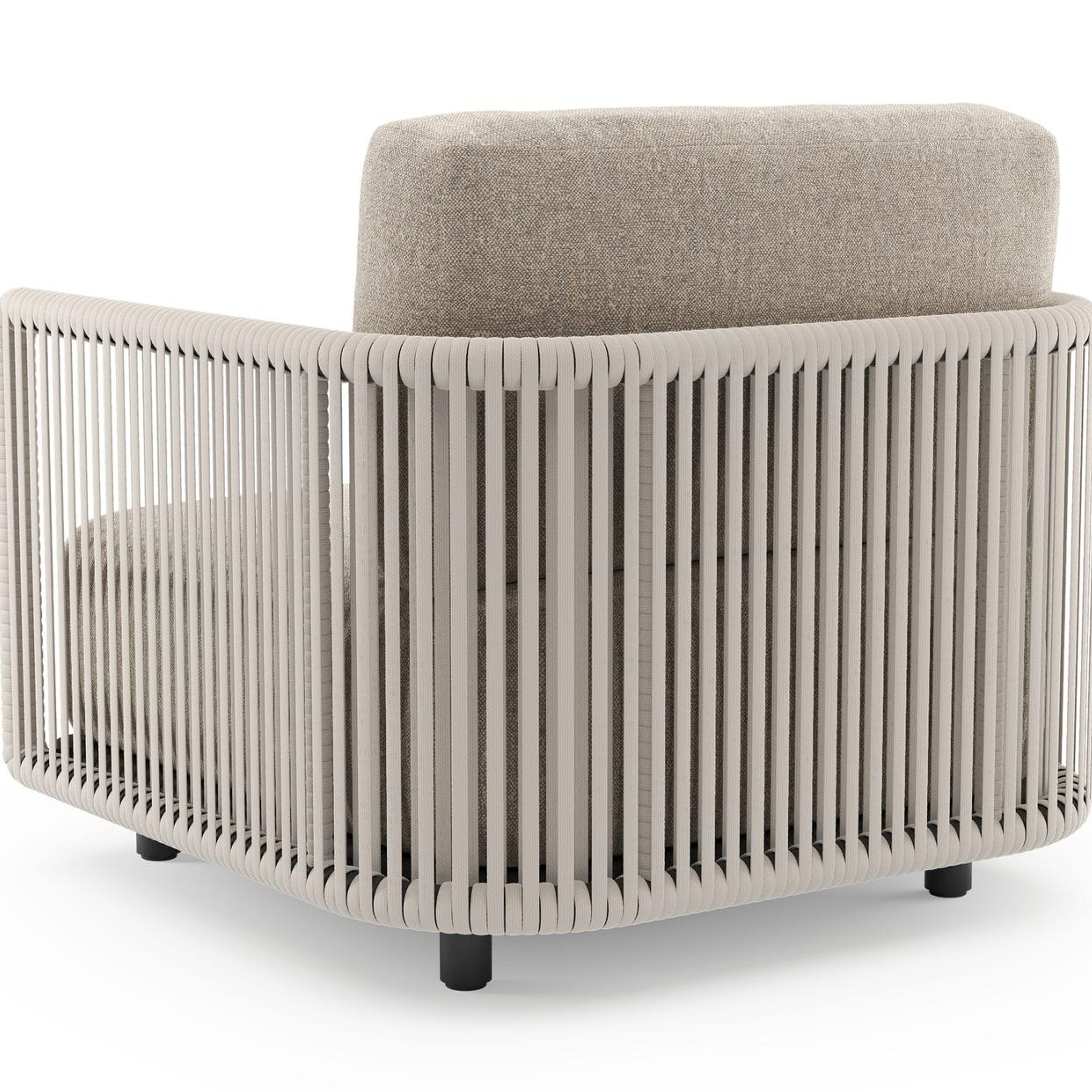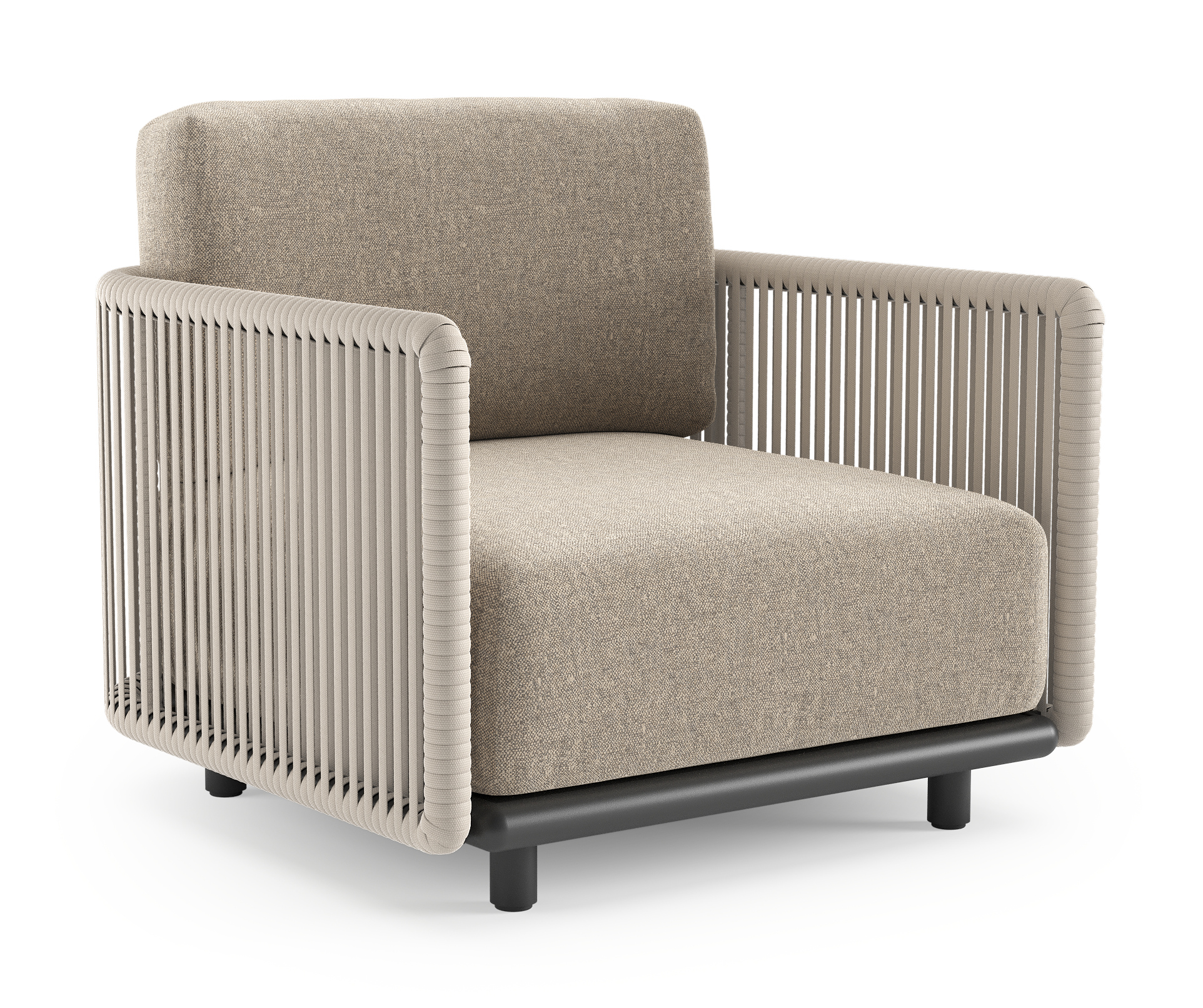 Organo loungestoel in zwart aluminium en beige verticaal geweven luxe vlakke rope met chartres pewter all weather Sunbrella® luxe kussen | Exterioo tuinmeubelen