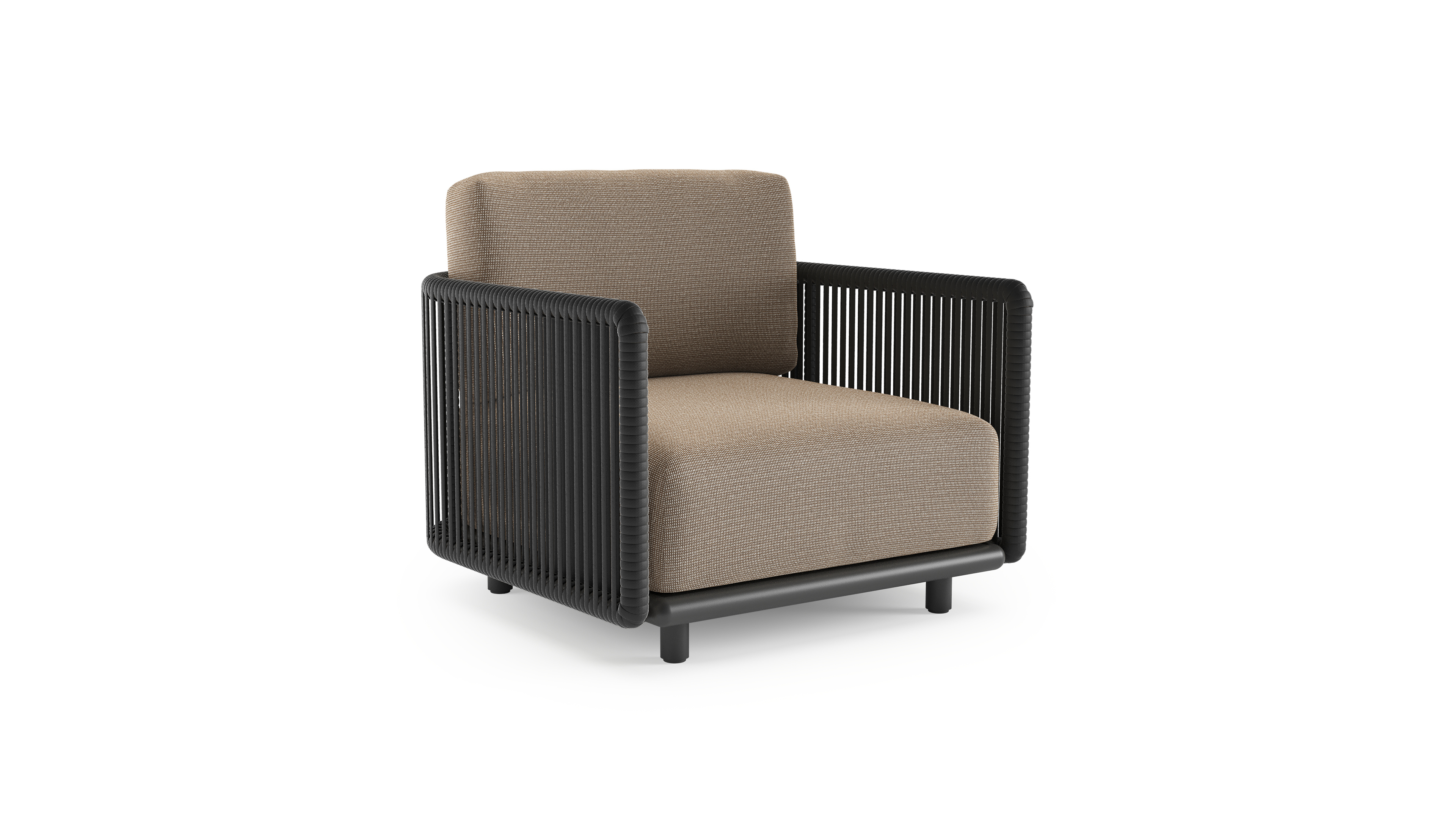 Organo loungestoel in zwart aluminium en zwart verticaal geweven luxe vlakke rope met firenze earth all weather Solica kussen | Exterioo tuinmeubelen