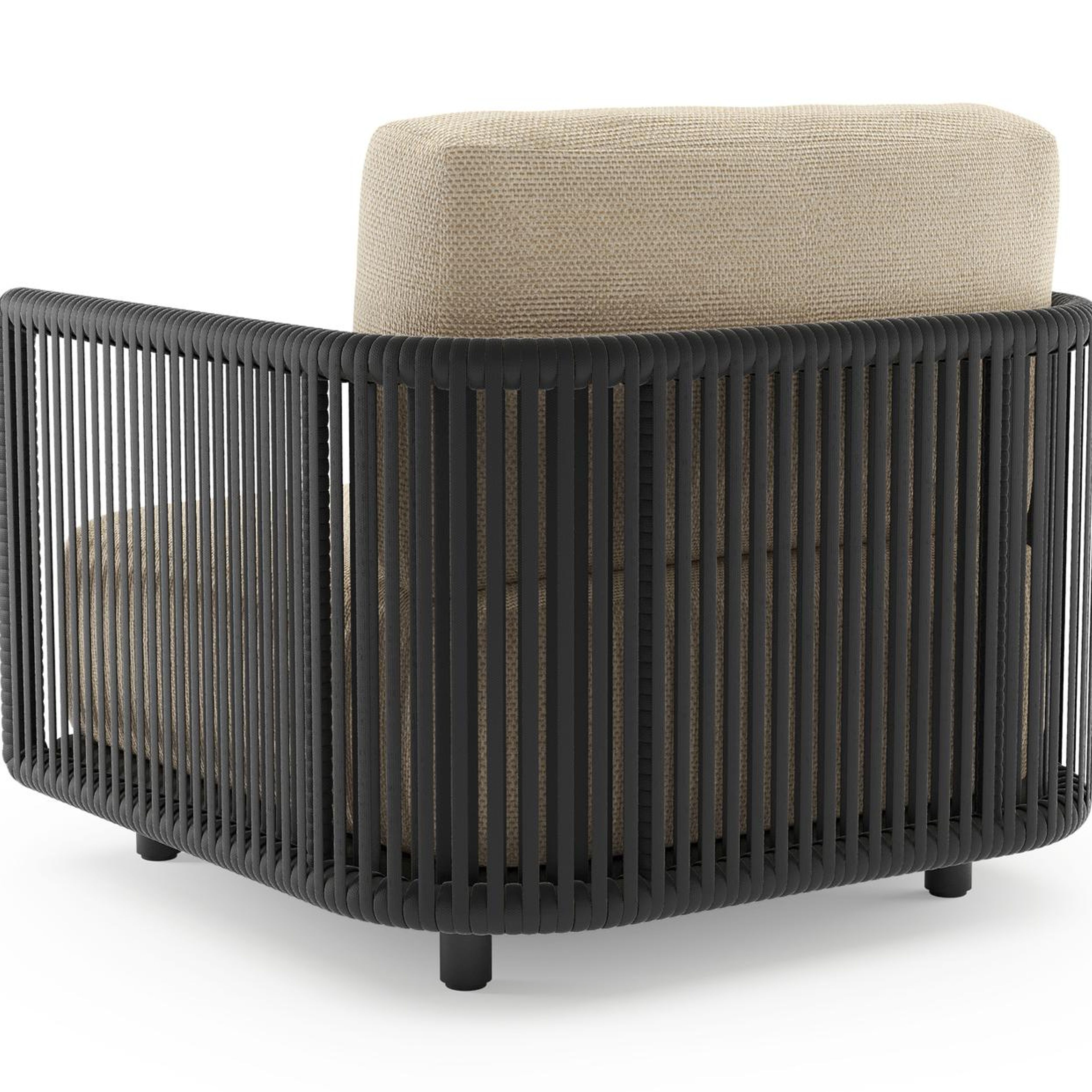 Organo loungestoel in zwart aluminium en zwart verticaal geweven luxe vlakke rope met althea camel all weather Cosytica kussen | Exterioo tuinmeubelen