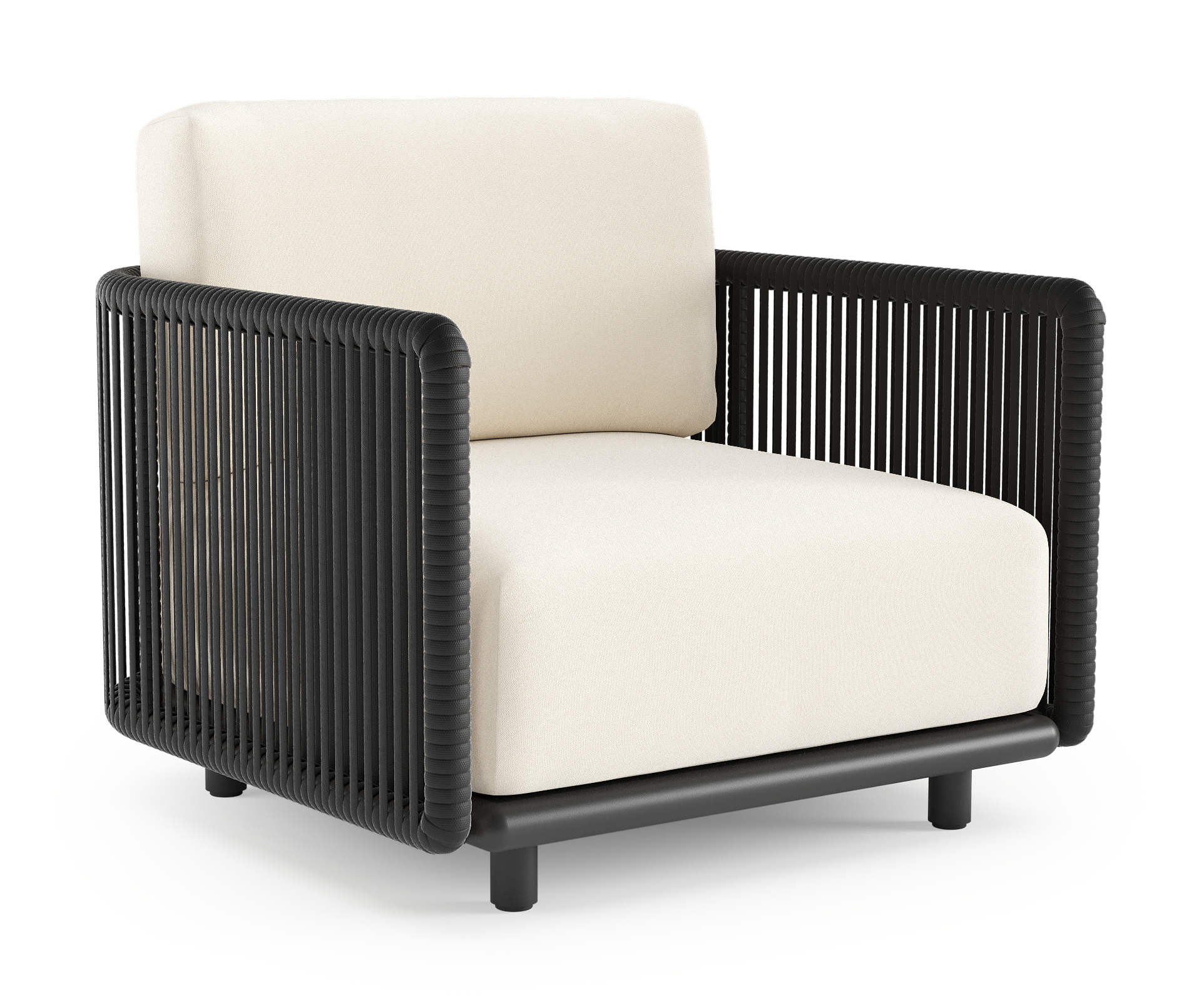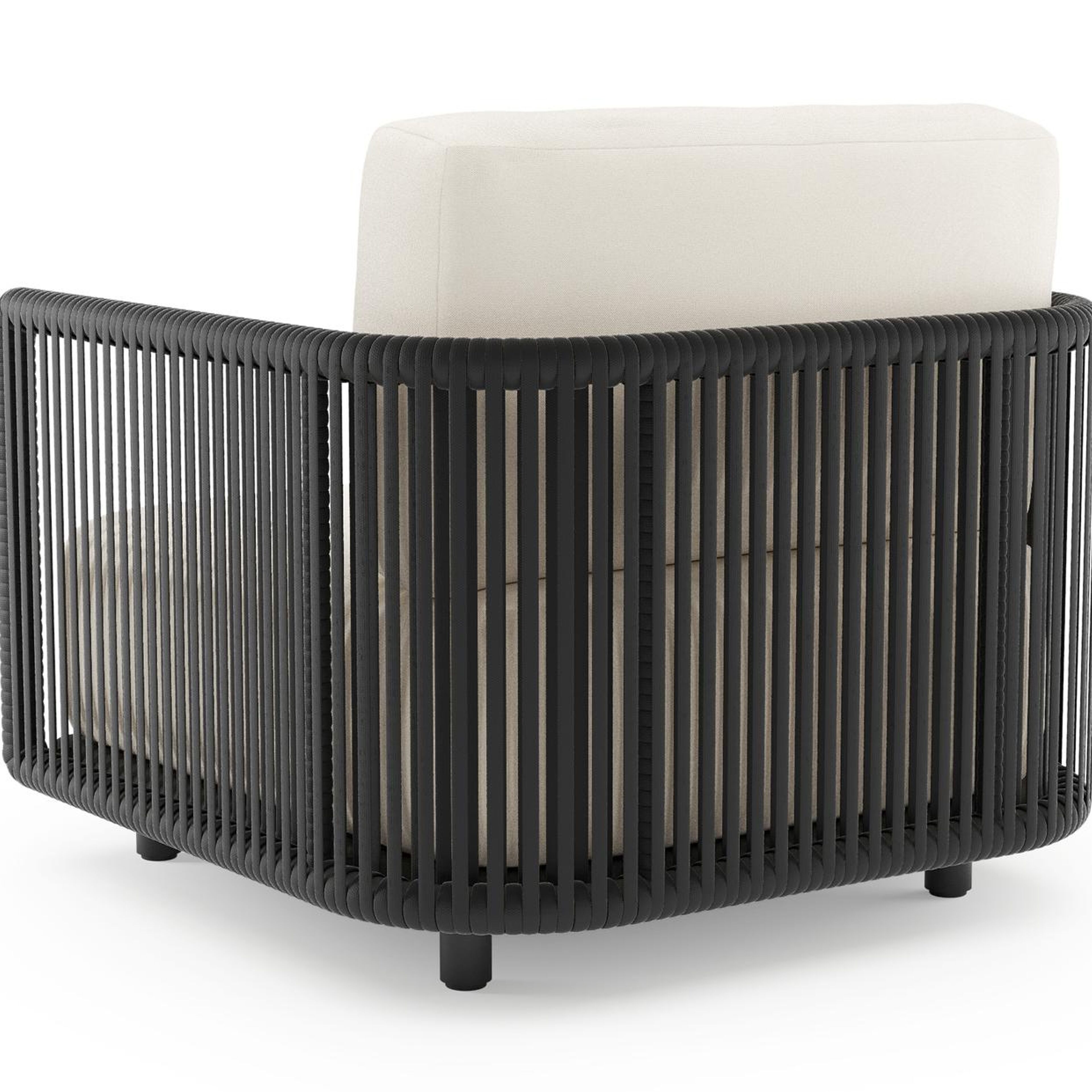 Organo loungestoel in zwart aluminium en zwart verticaal geweven luxe vlakke rope met natte white all weather Sunbrella® luxe kussen | Exterioo tuinmeubelen
