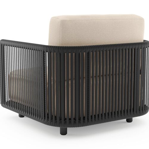 Organo loungestoel in zwart aluminium en zwart verticaal geweven luxe vlakke rope met heritage papyrus all weather Sunbrella® luxe kussen | Exterioo