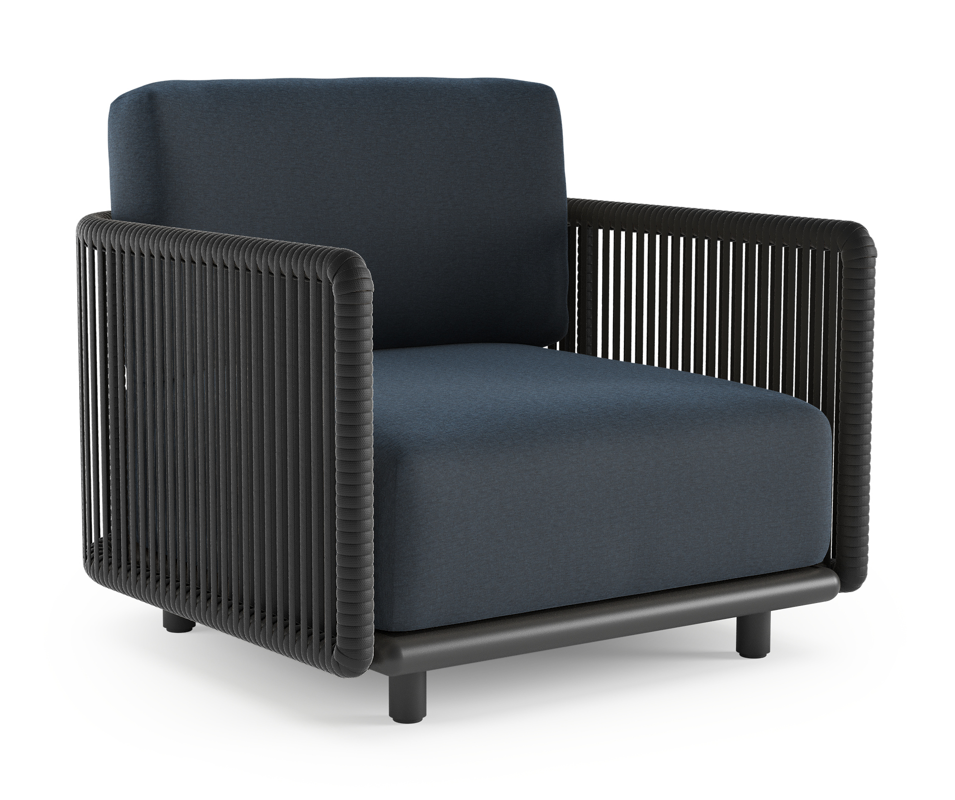 Organo loungestoel in zwart aluminium en zwart verticaal geweven luxe vlakke rope met heritage indigo all weather Sunbrella® luxe kussen | Exterioo tuinmeubelen