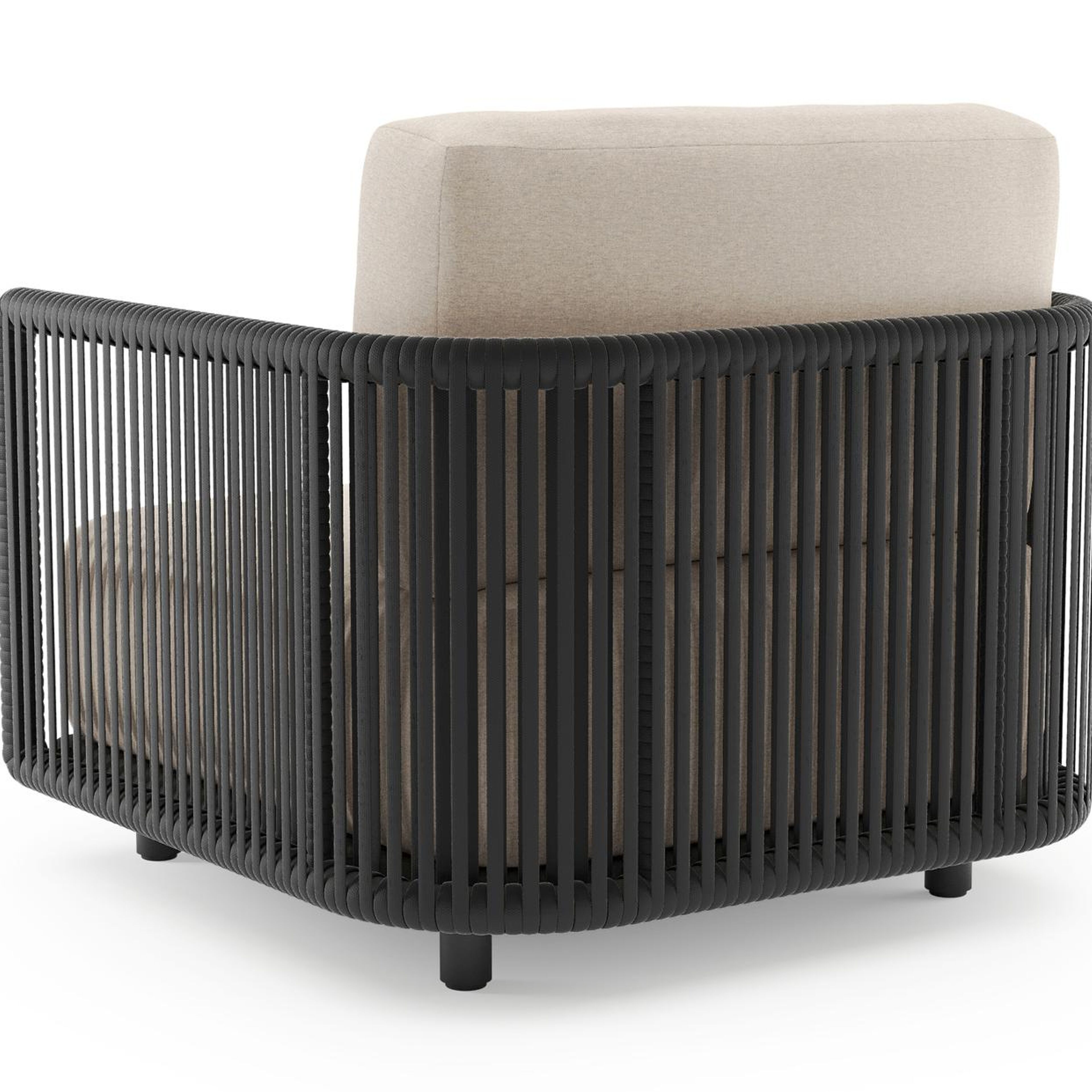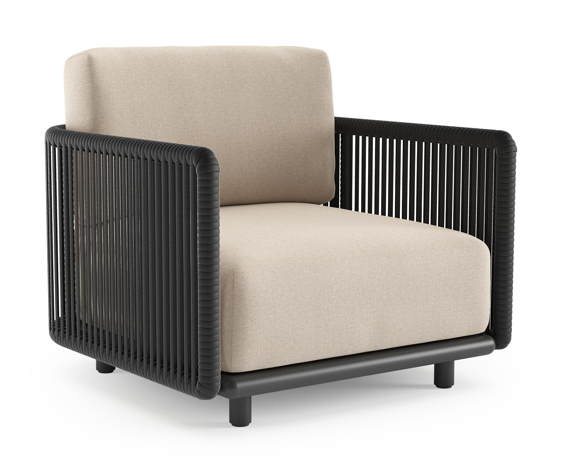 Organo loungestoel in zwart aluminium en zwart verticaal geweven luxe vlakke rope met heritage ash all weather Sunbrella® luxe kussen | Exterioo tuinmeubelen