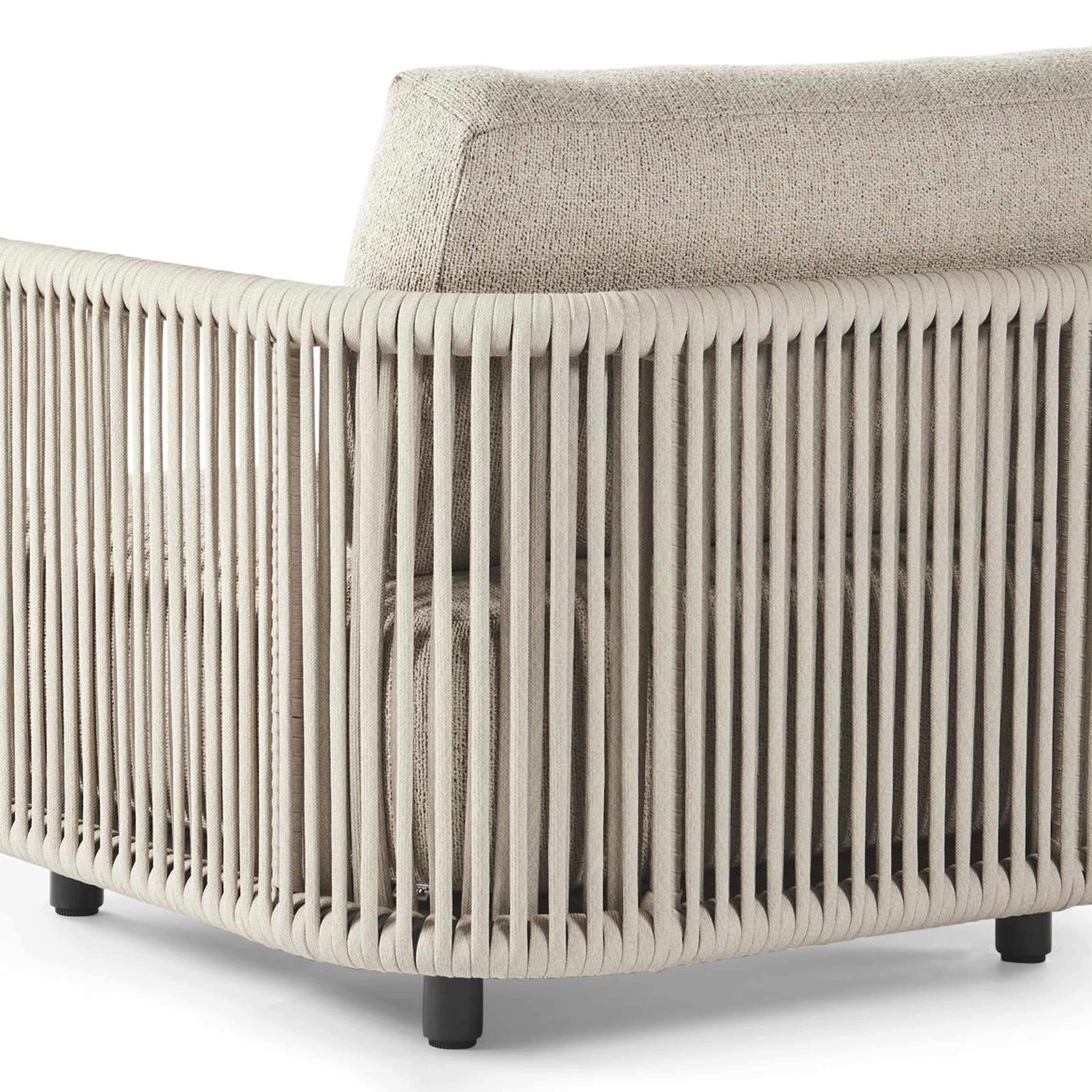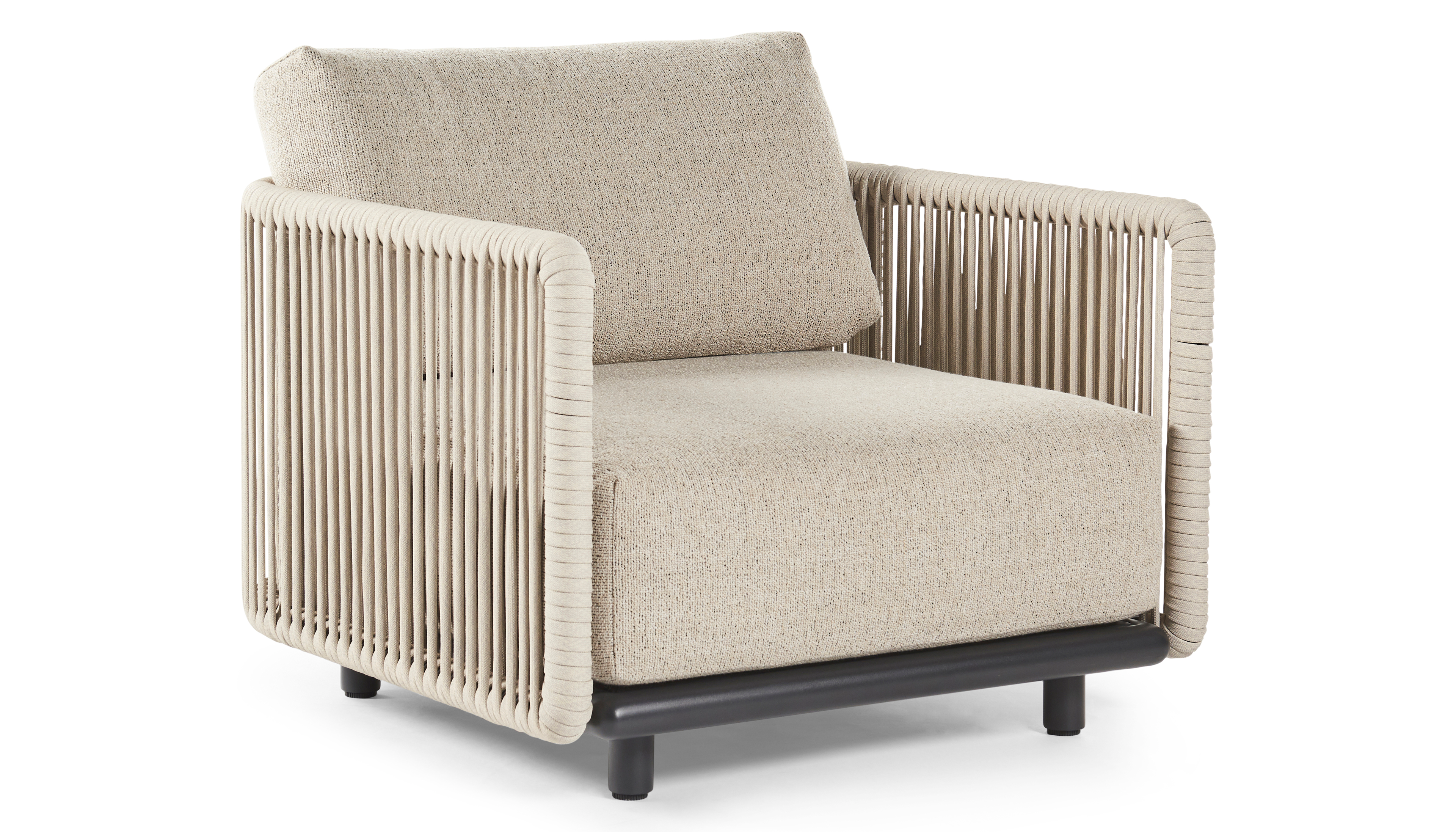 Organo loungestoel 1-zit in zwart aluminium en beige verticaal geweven luxe vlakke rope met marbella beige All Weather Cosytica kussen | Exterioo tuinmeubelen