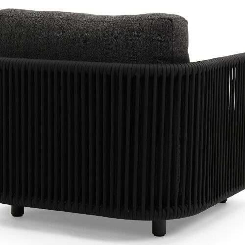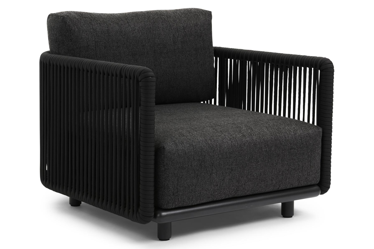 Organo loungestoel 1-zit in zwart aluminium en zwart verticaal geweven luxe vlakke rope met chartres sooty all weather sunbrella® luxe kussen | Exterioo