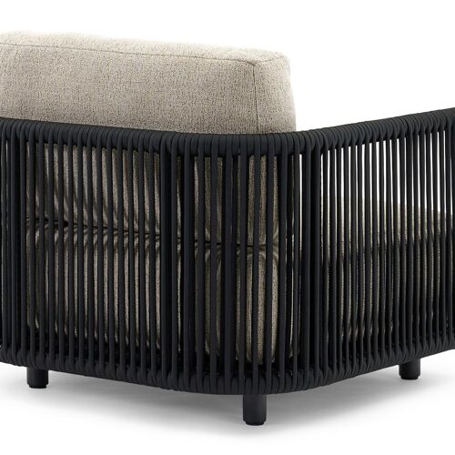 Organo loungestoel in zwart aluminium en zwart verticaal geweven luxe vlakke rope met marbella beige All Weather Cosytica kussen | Exterioo