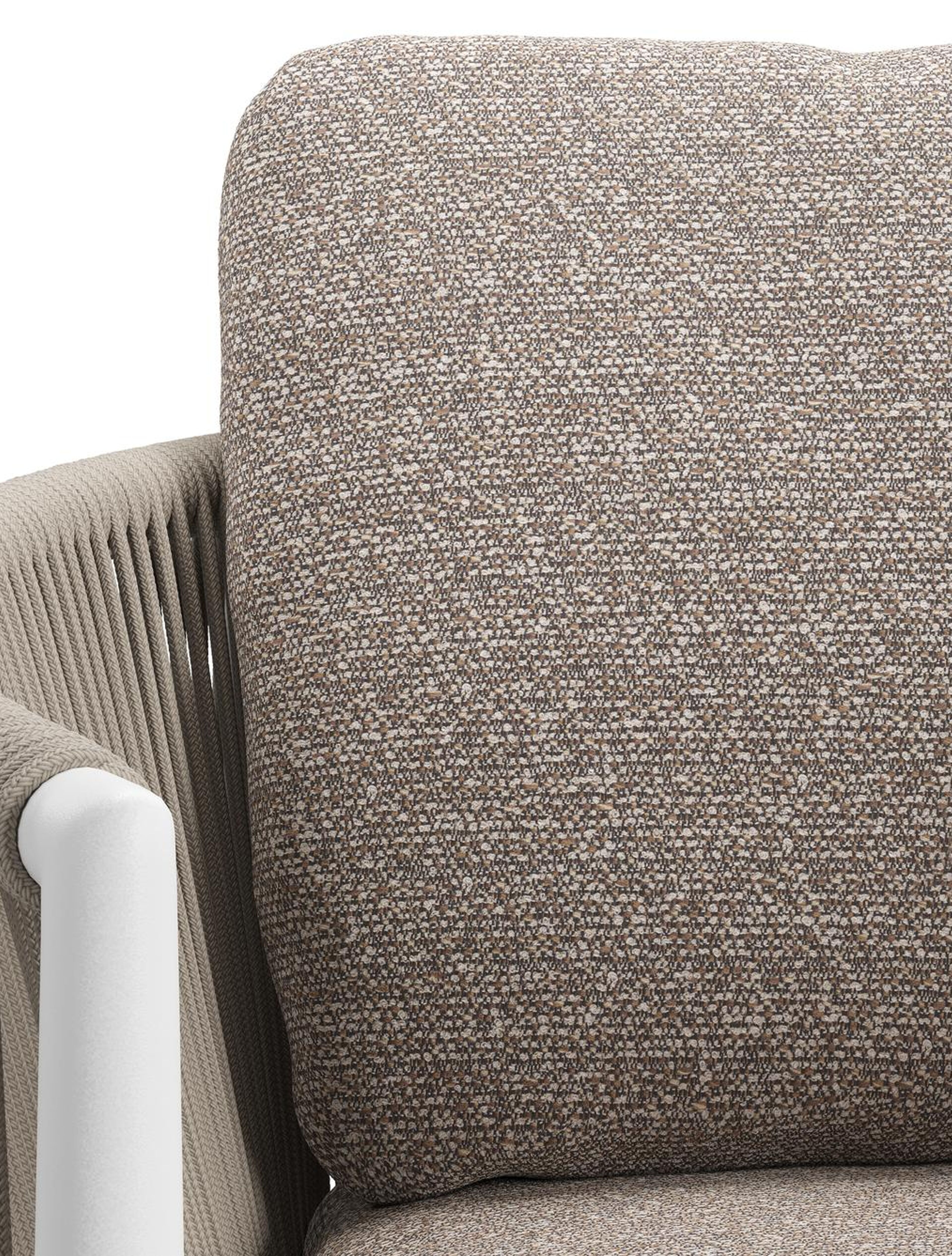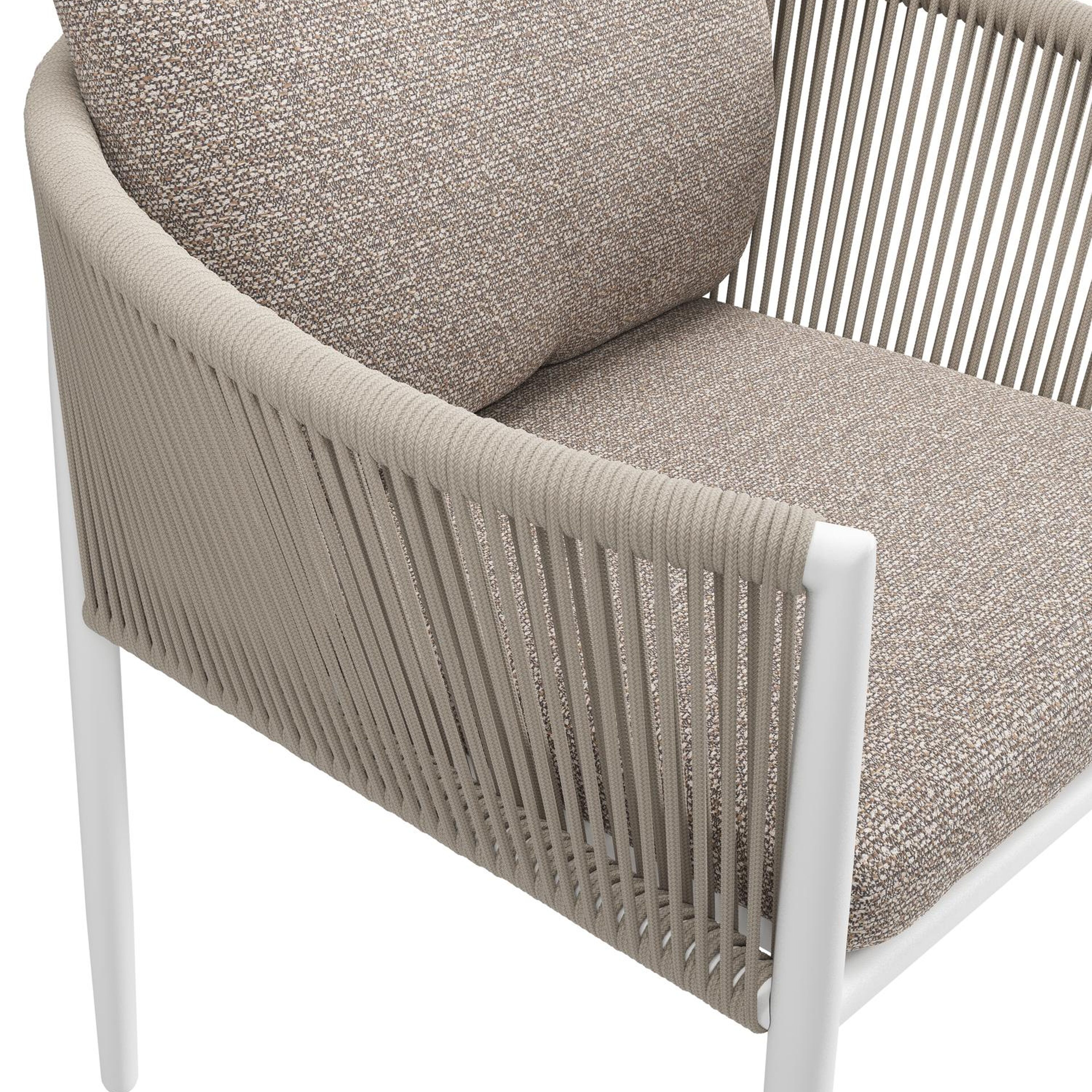 Organo tuinstoel in beige aluminium en beige verticaal geweven ronde rope met stoelkussen in All Weather Sunbrella® Luxe Wander Manioc | Exterioo tuinmeubelen