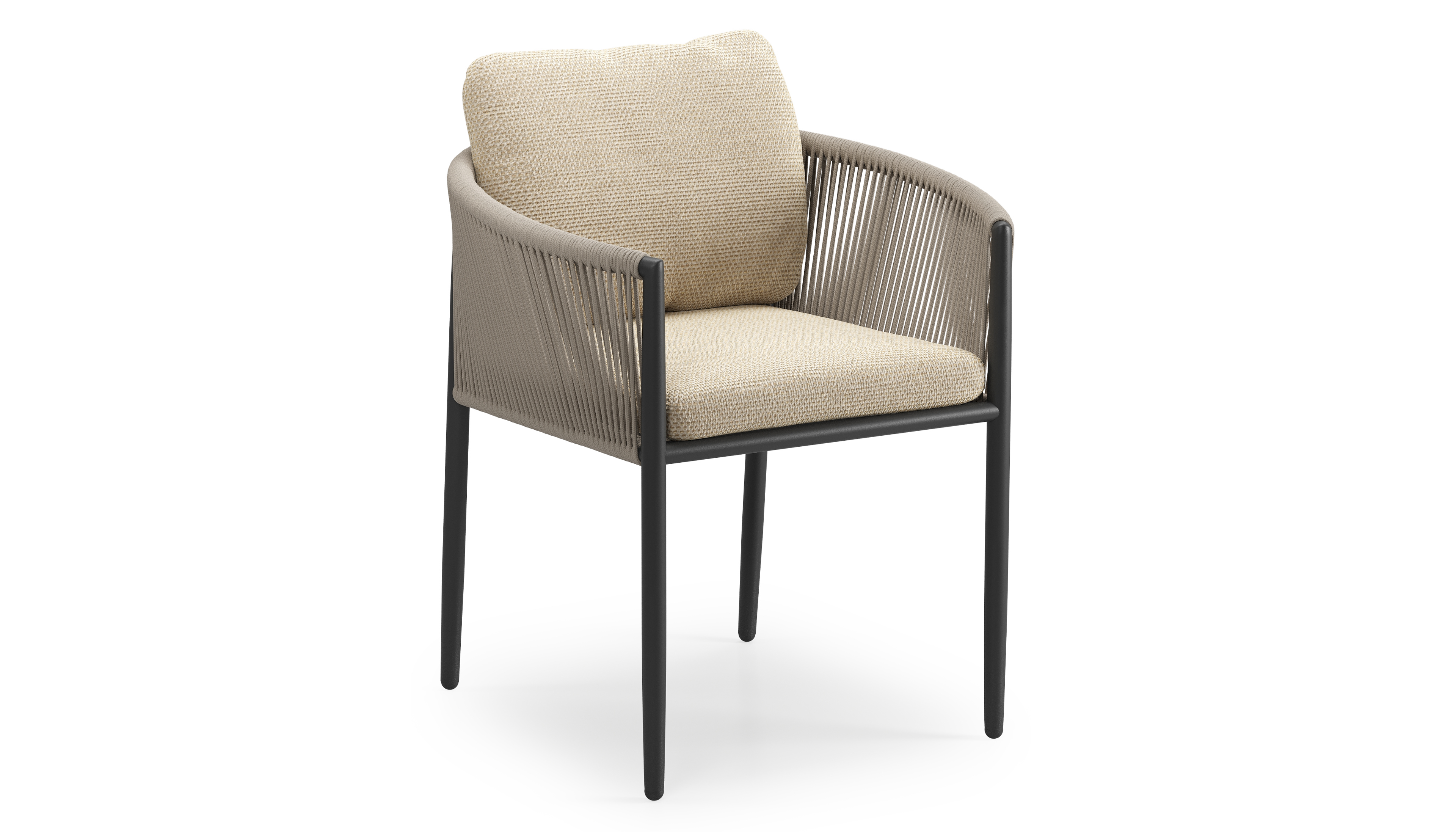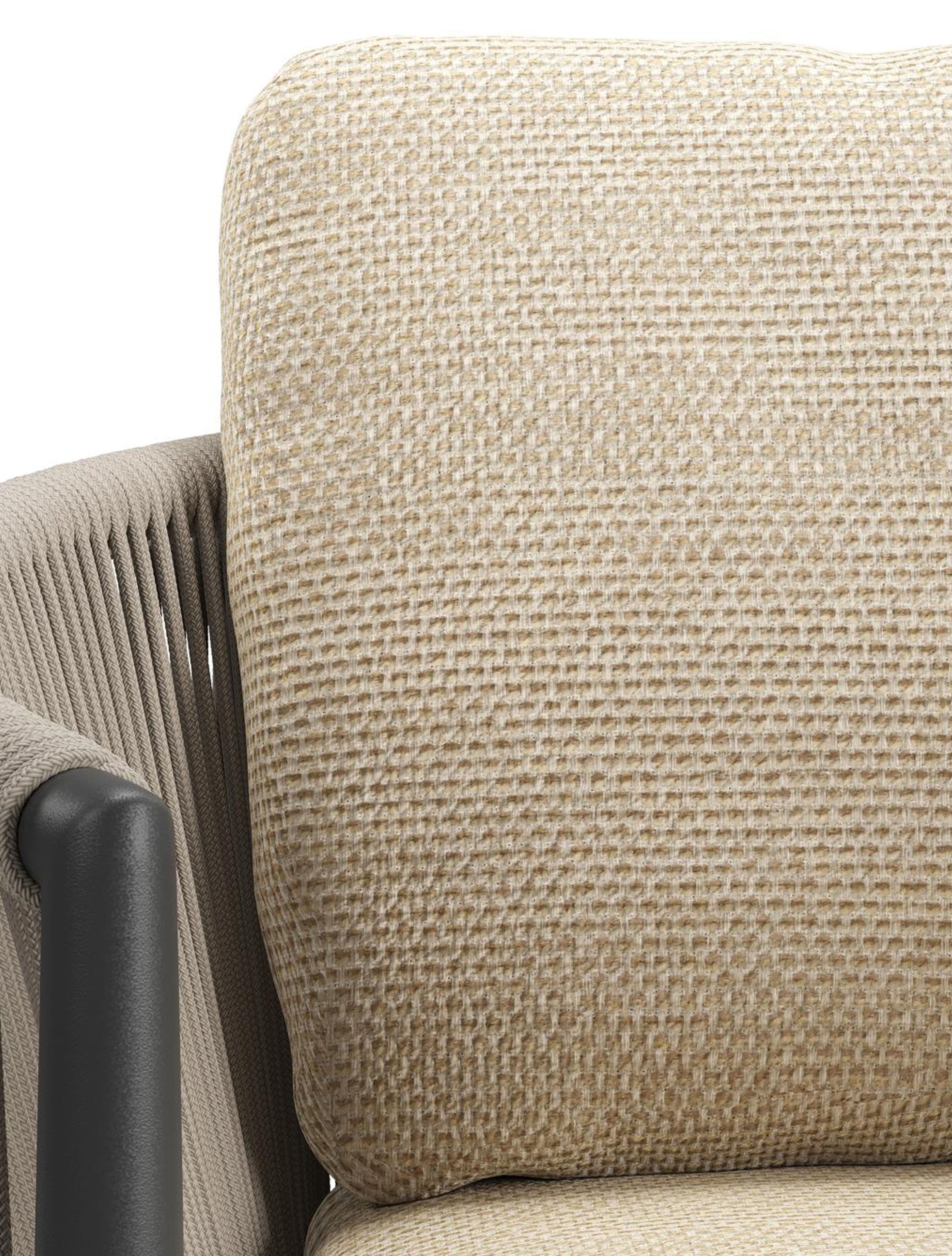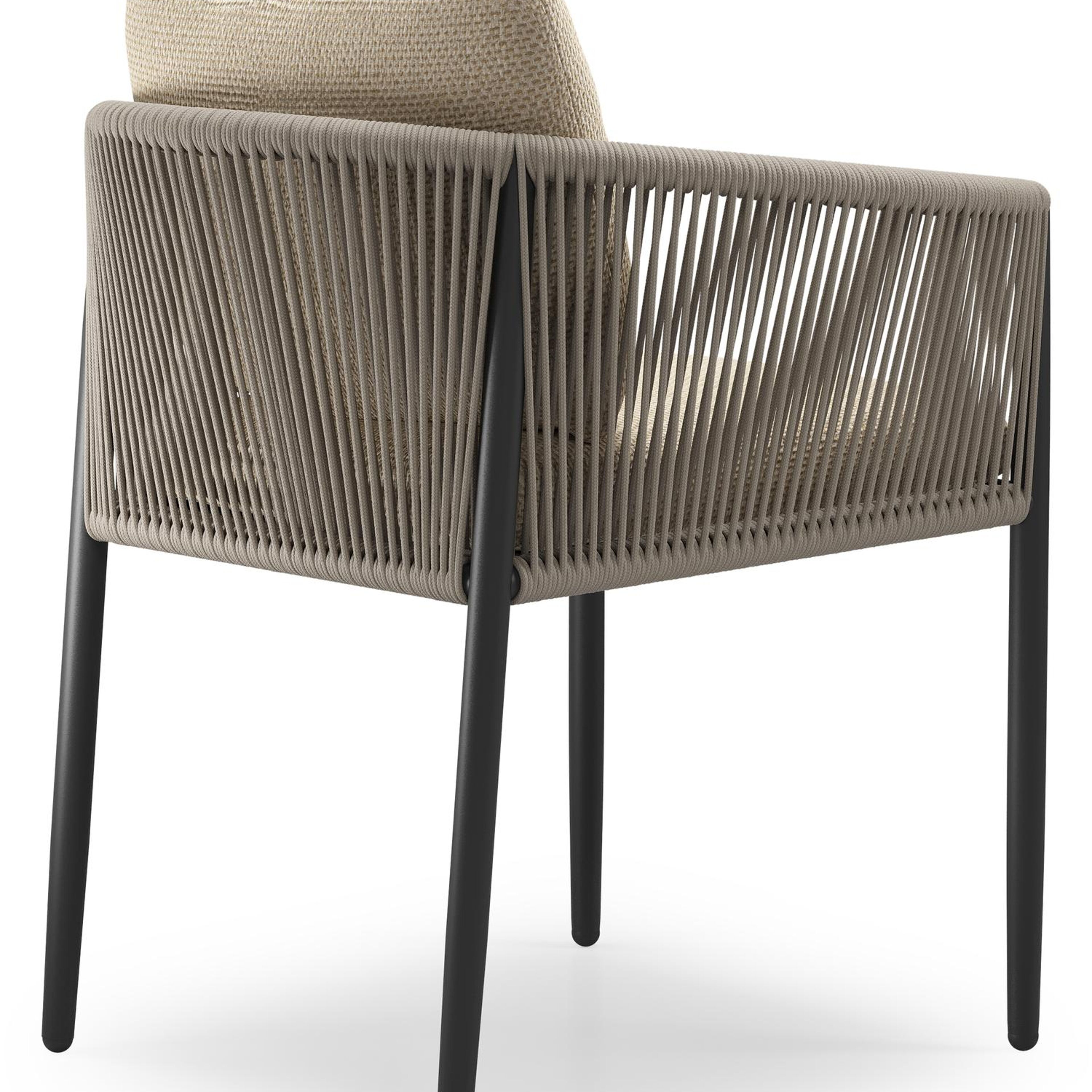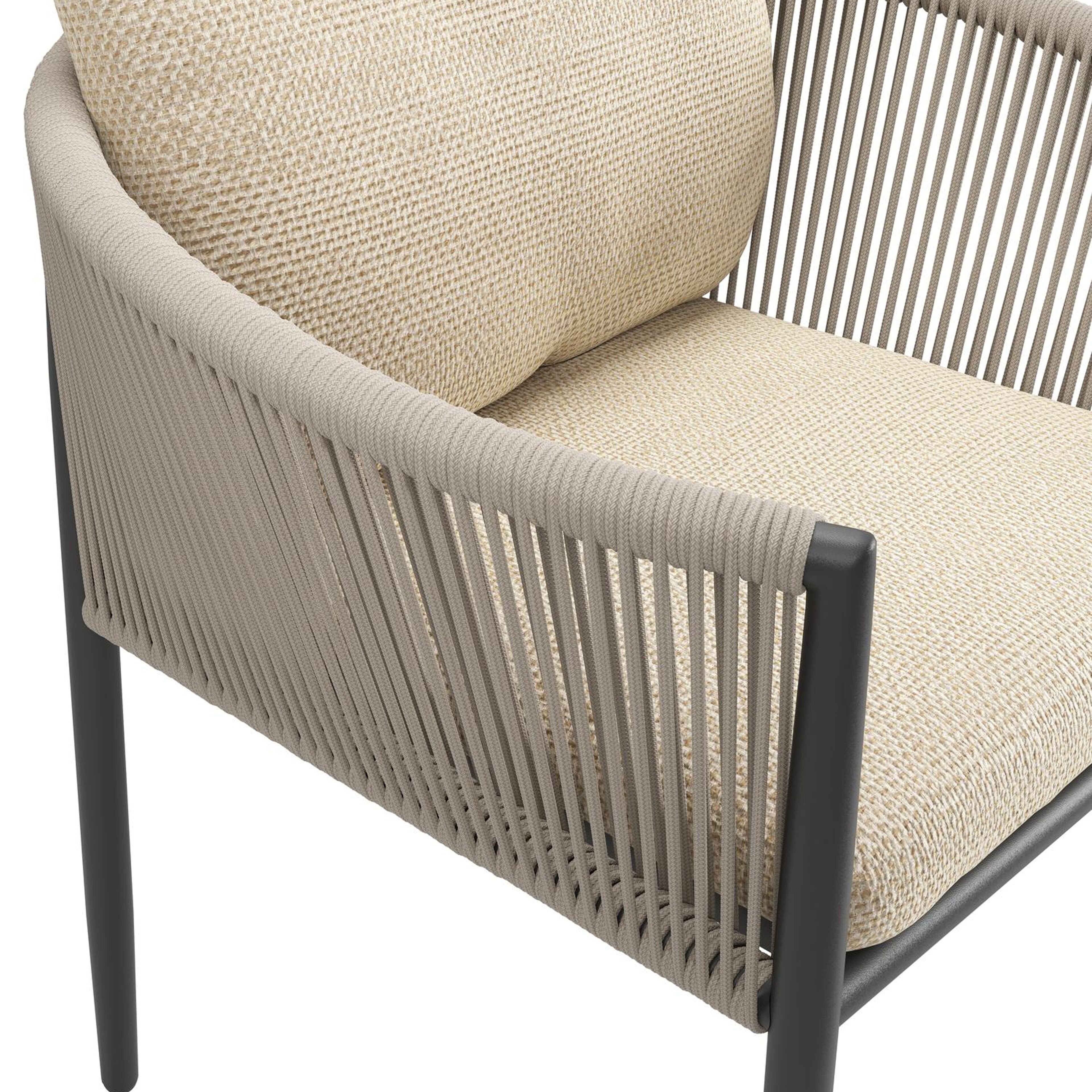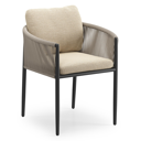 Organo tuinstoel in zwart aluminium en zwart verticaal geweven ronde rope met stoelkussen in All Weather Cosytica Althea Camel | Exterioo tuinmeubelen