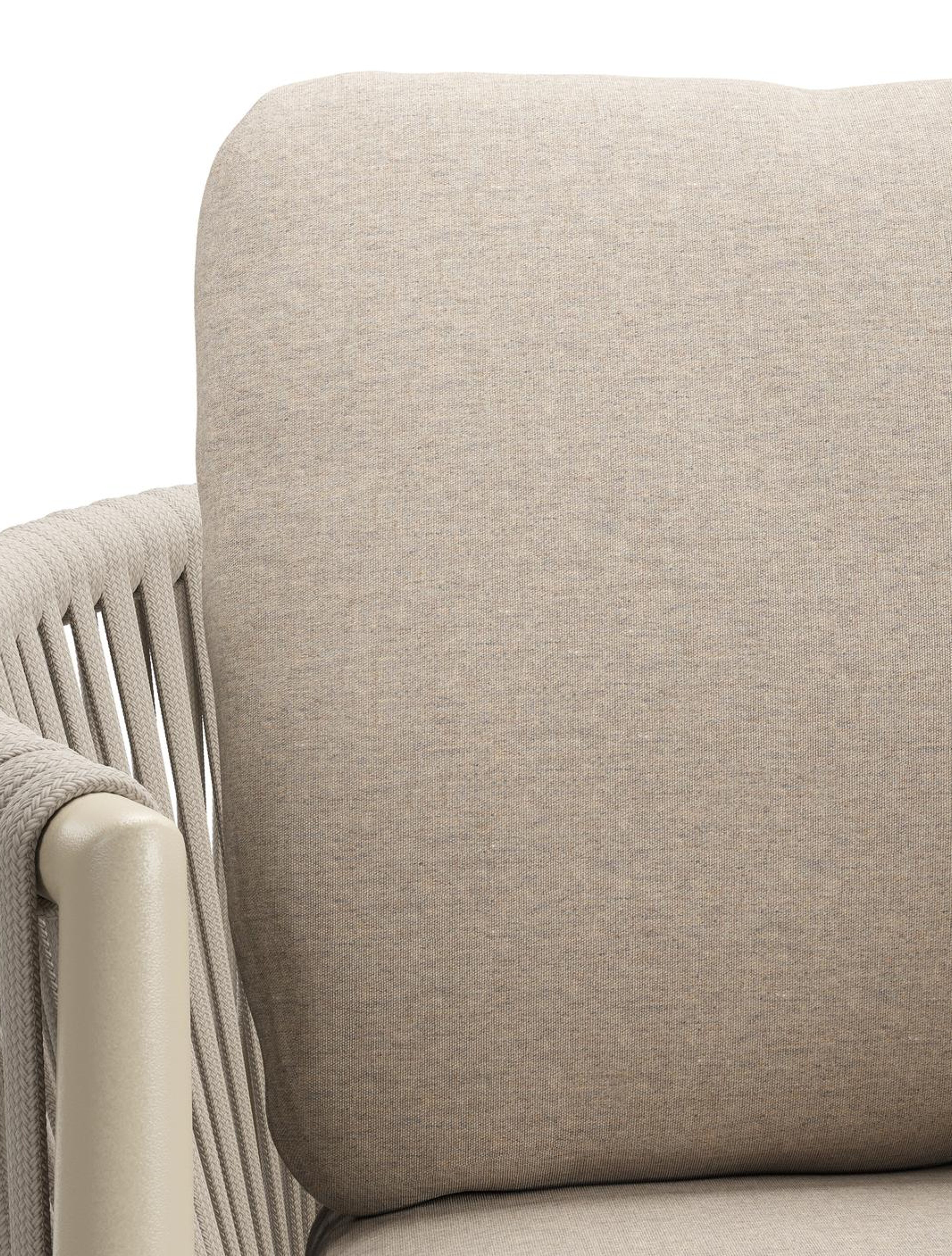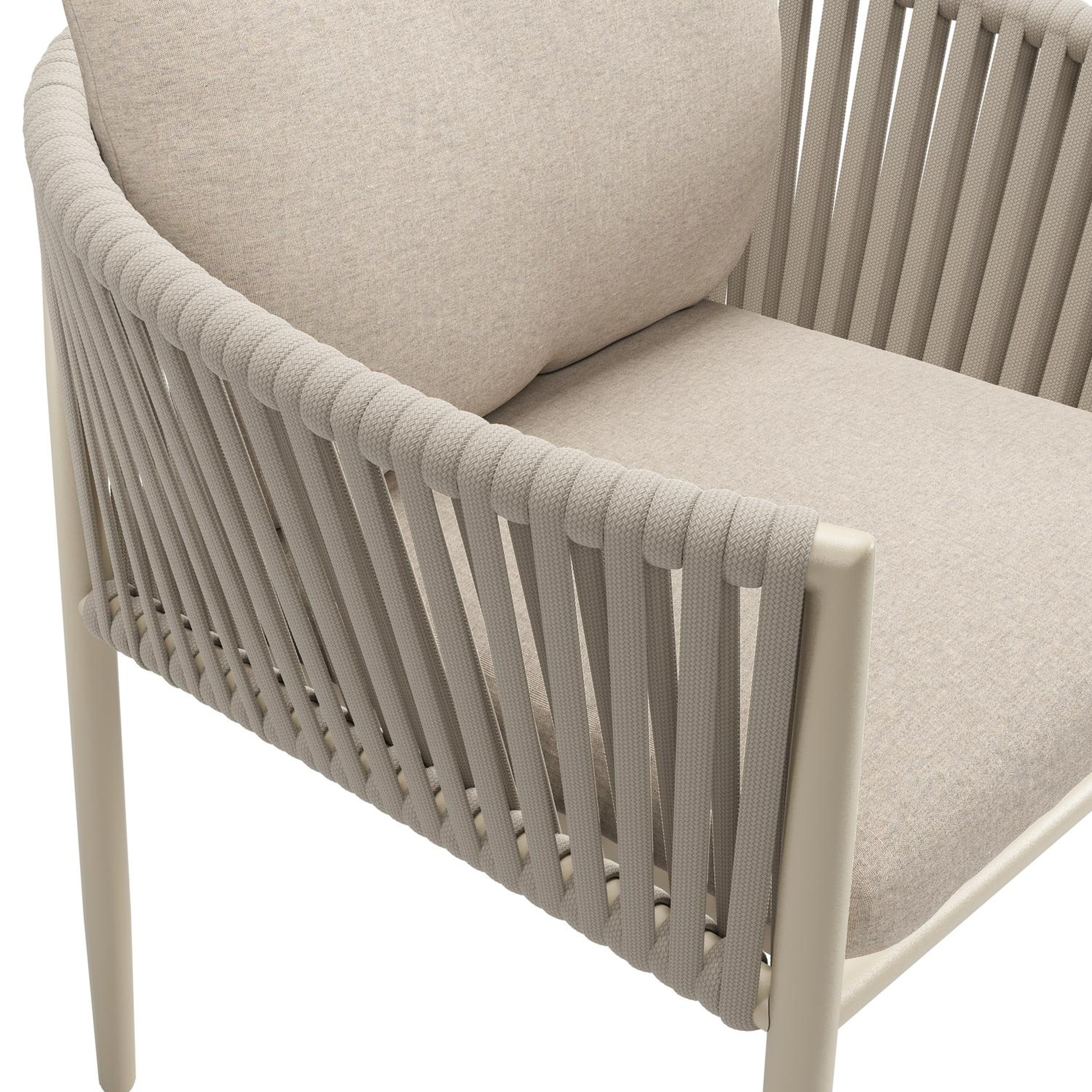 Organo tuinstoel in beige aluminium en beige verticaal geweven luxe vlakke rope met zitkussen in All Weather Sunbrella® Luxe Heritage Ash | Exterioo tuinmeubelen