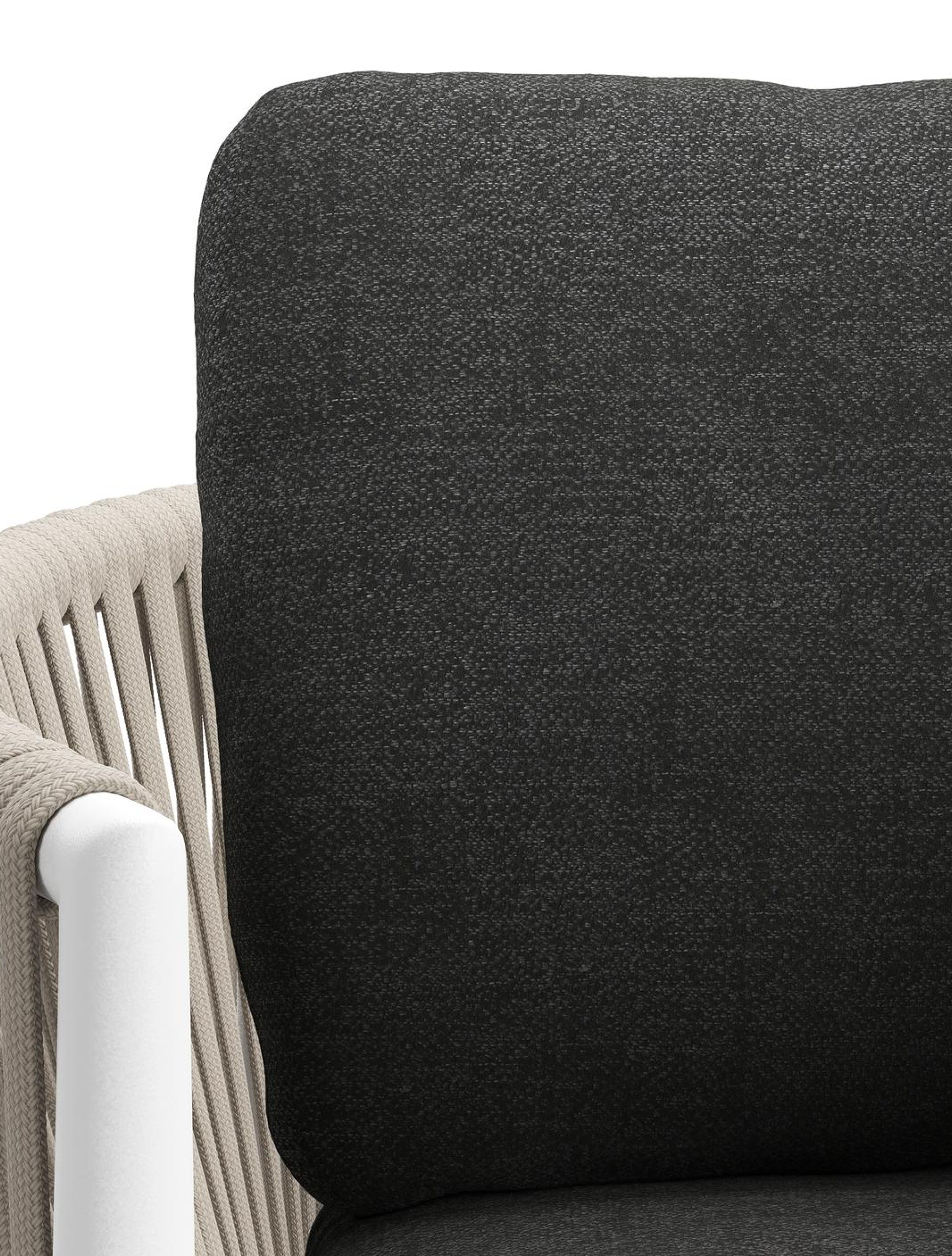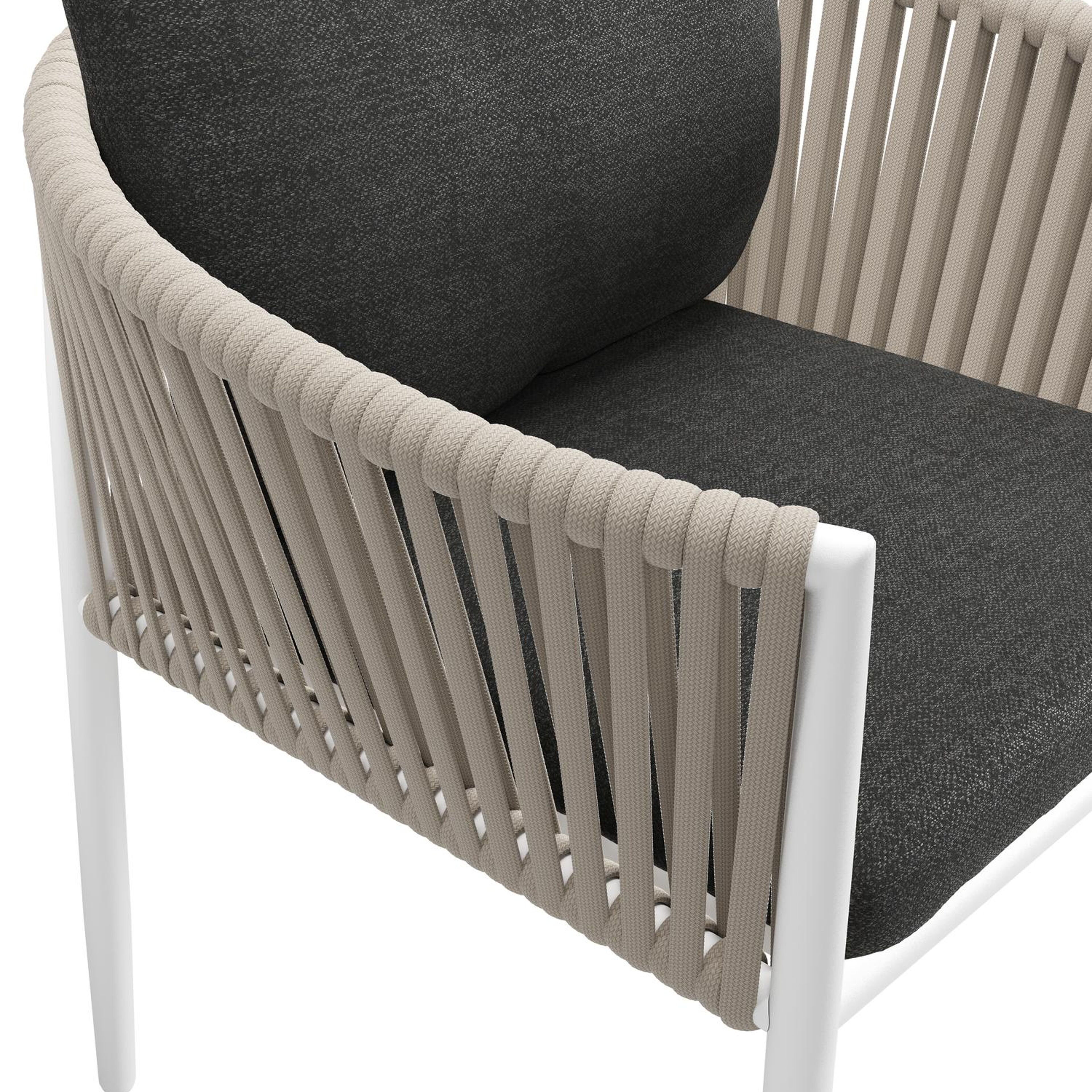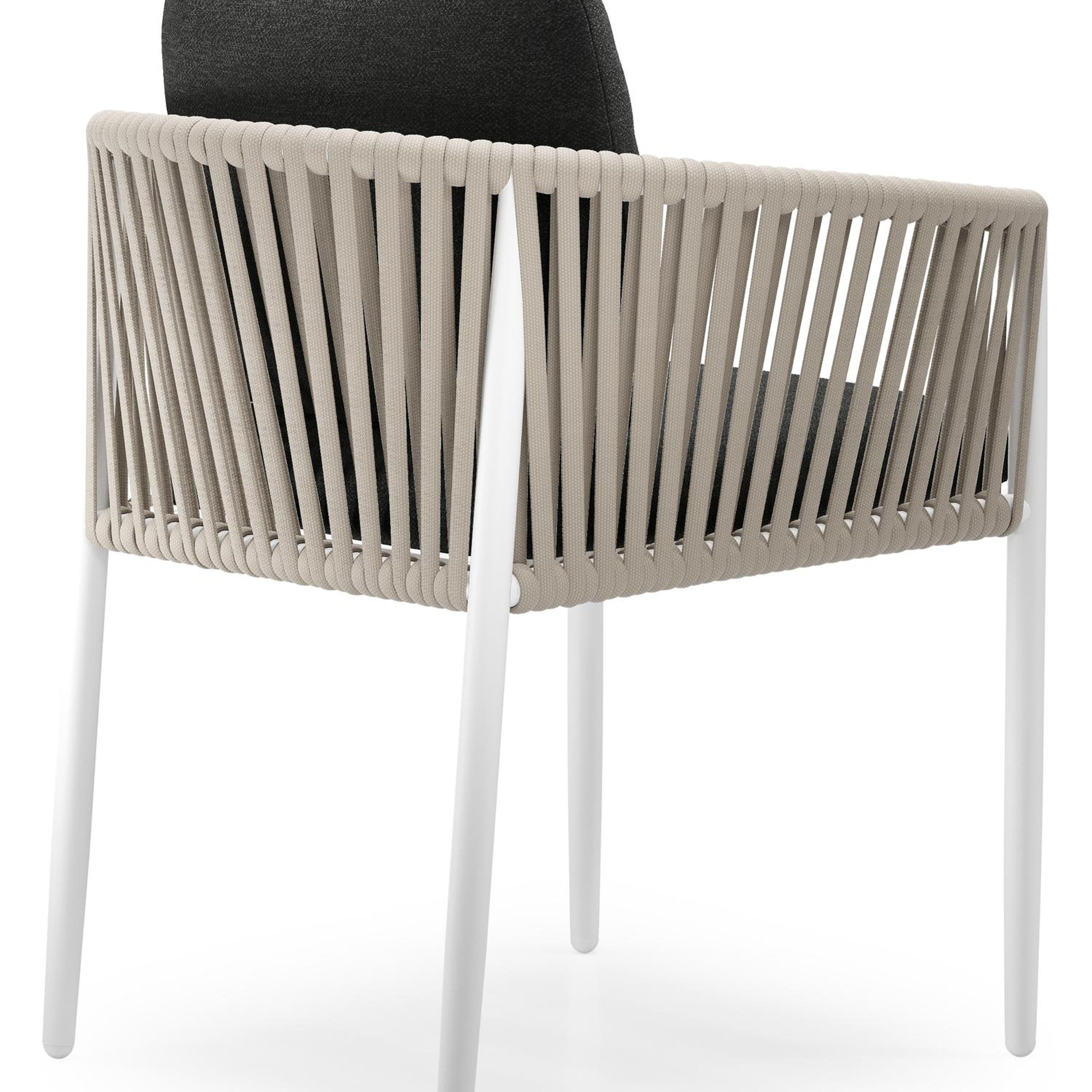 Organo tuinstoel in wit aluminium en beige verticaal geweven luxe vlakke rope met zitkussen in All Weather Sunbrella® Luxe Chartres Sooty | Exterioo tuinmeubelen