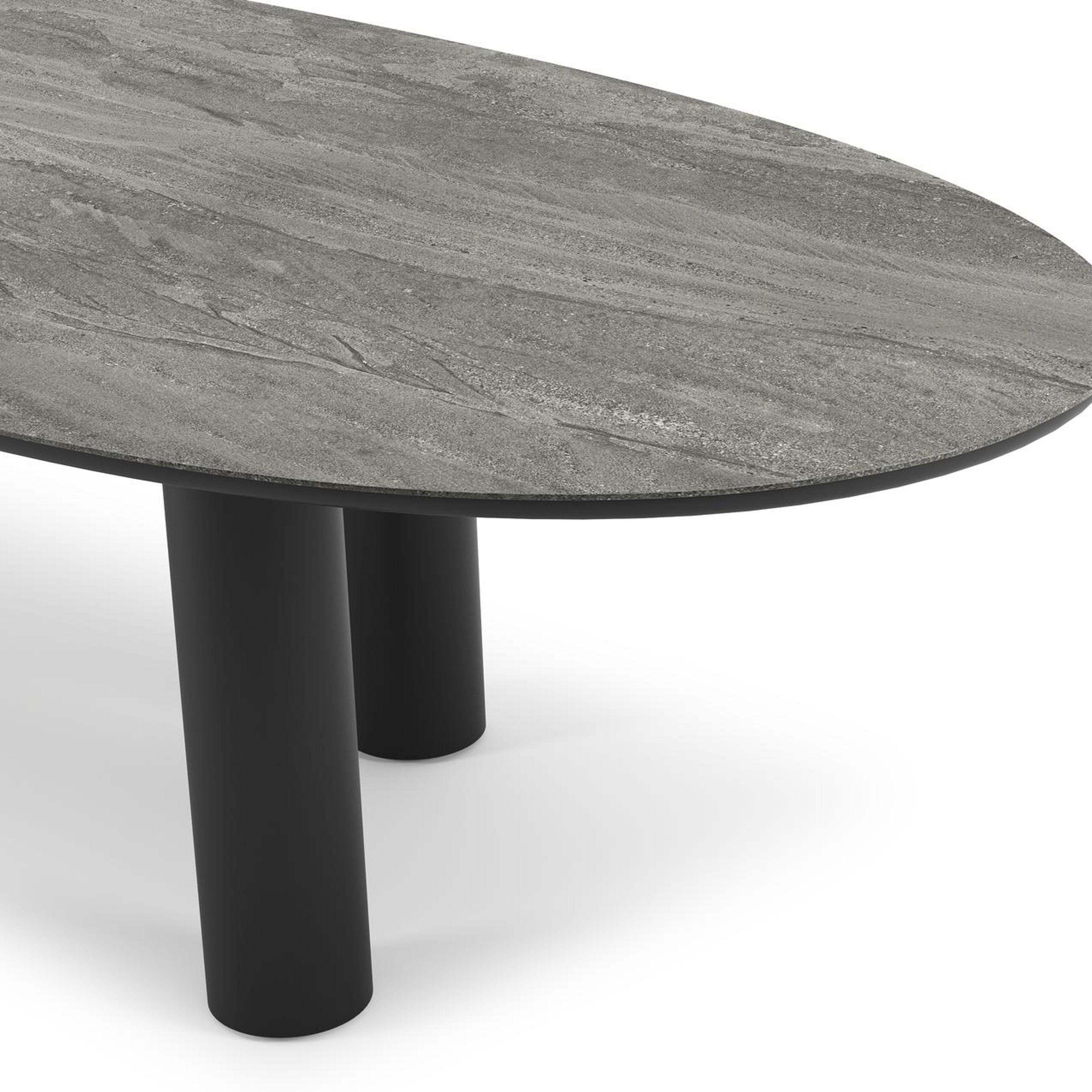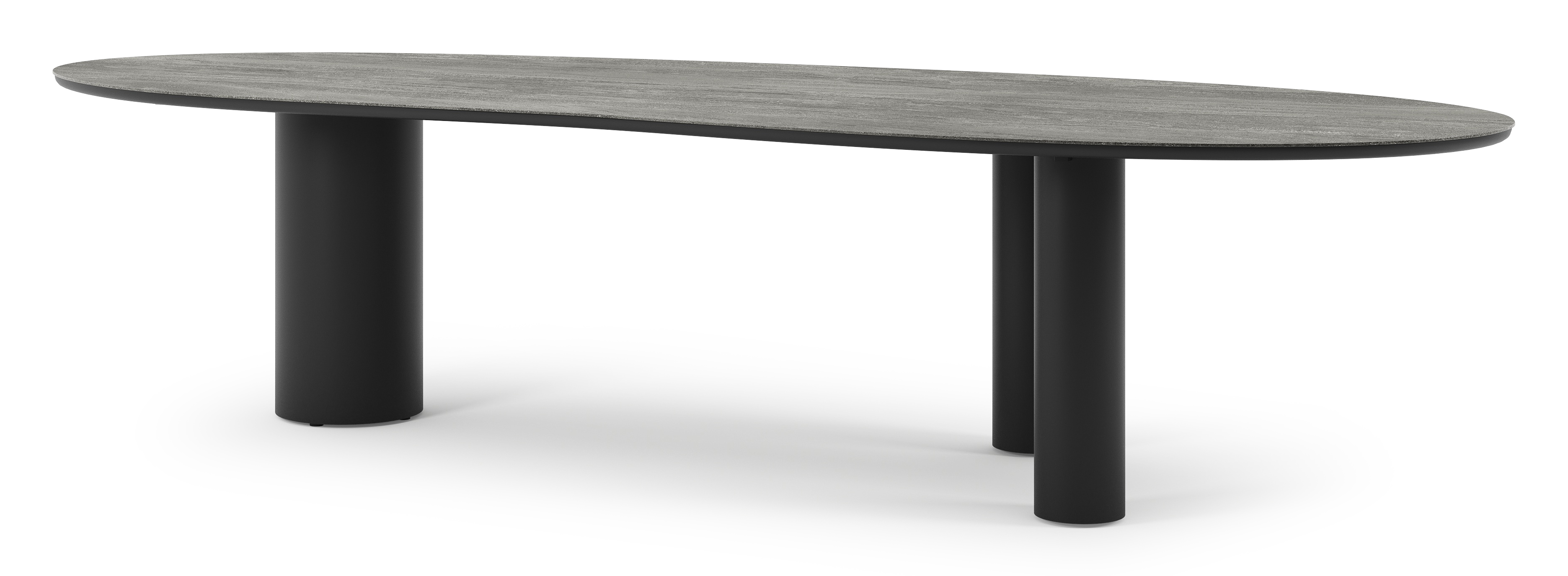 De Organo tuintafel onderscheidt zich door zijn uniek ontwerp, met een organisch gevormd tafelblad dat een eigentijdse uitstraling heeft. De tafel rust op een robuuste, dikke ronde poot en twee fijne ronde poten. Samen creëren ze een meesterlijke balans tussen luxe en moderniteit, waardoor deze tafel het pronkstuk van je buitenruimte wordt.