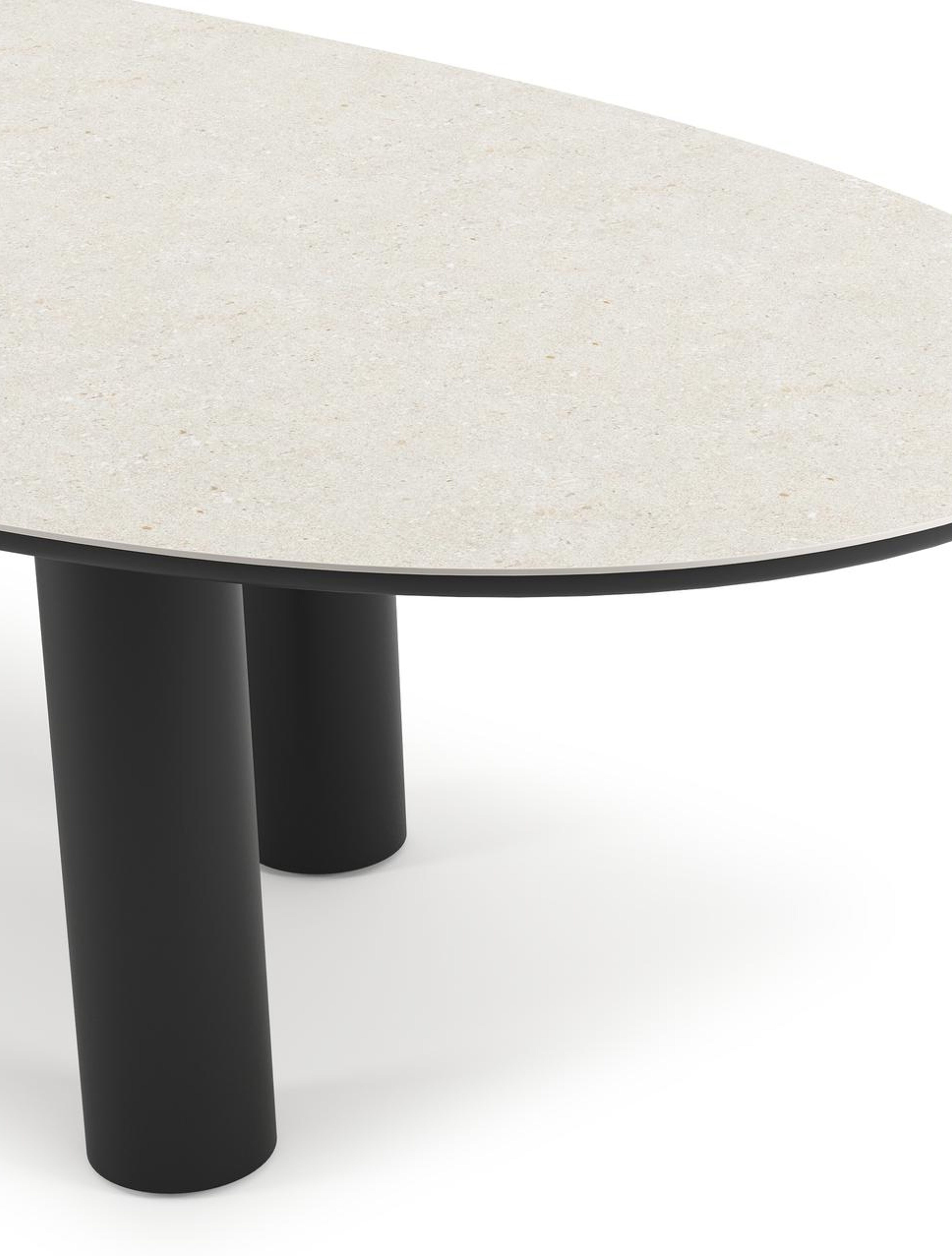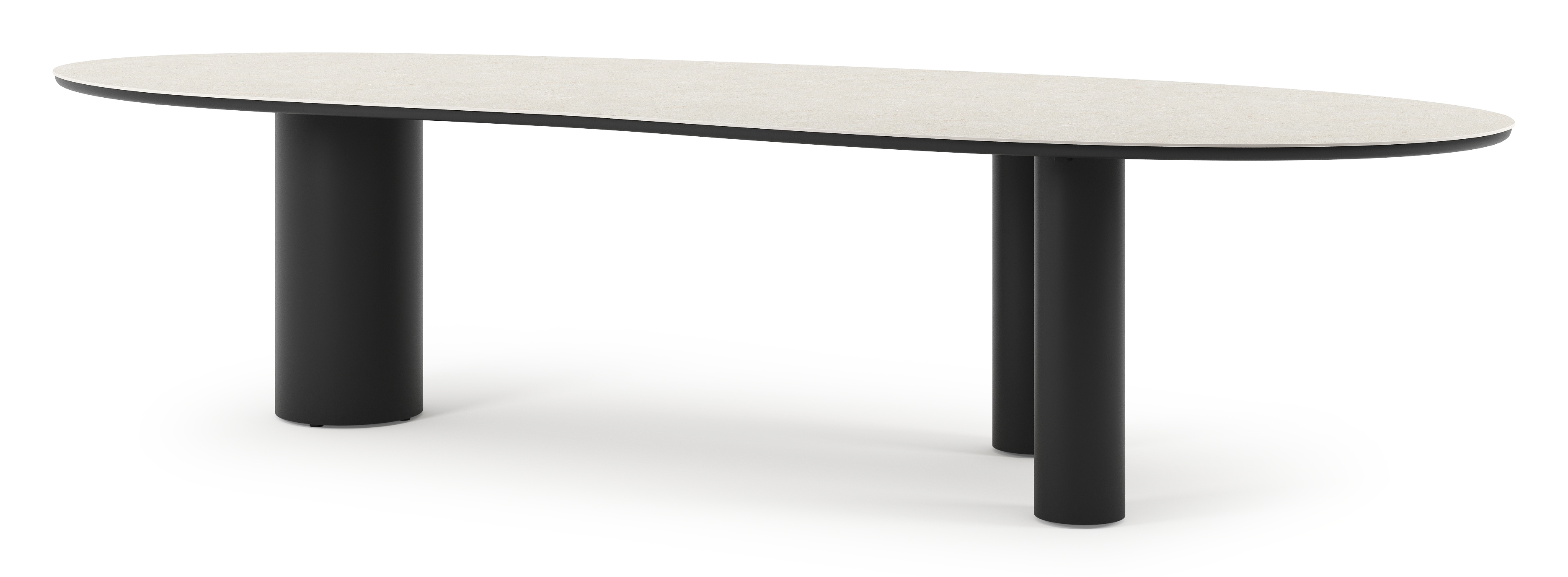 De Organo tuintafel onderscheidt zich door zijn uniek ontwerp, met een organisch gevormd tafelblad dat een eigentijdse uitstraling heeft. De tafel rust op een robuuste, dikke ronde poot en twee fijne ronde poten. Samen creëren ze een meesterlijke balans tussen luxe en moderniteit, waardoor deze tafel het pronkstuk van je buitenruimte wordt.
