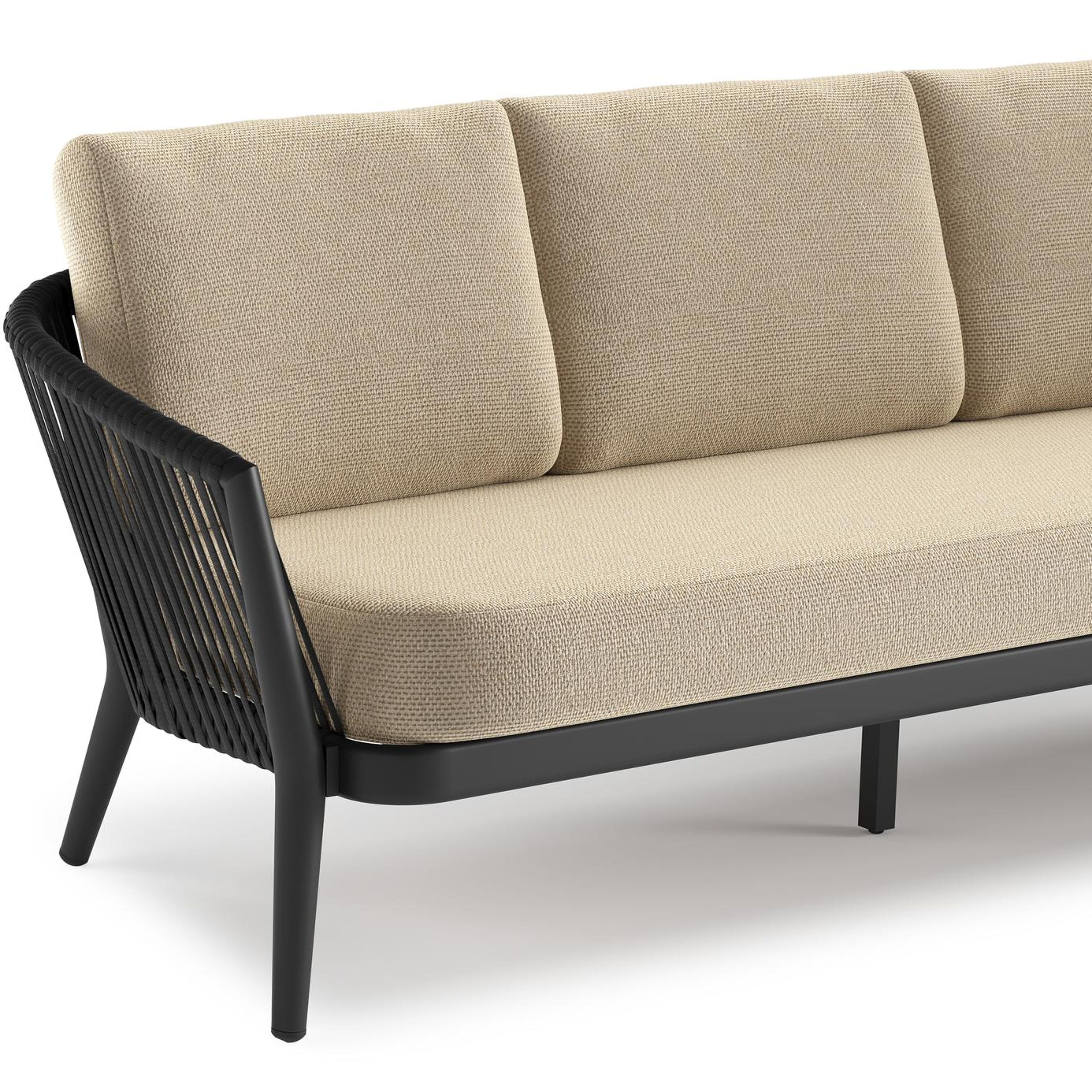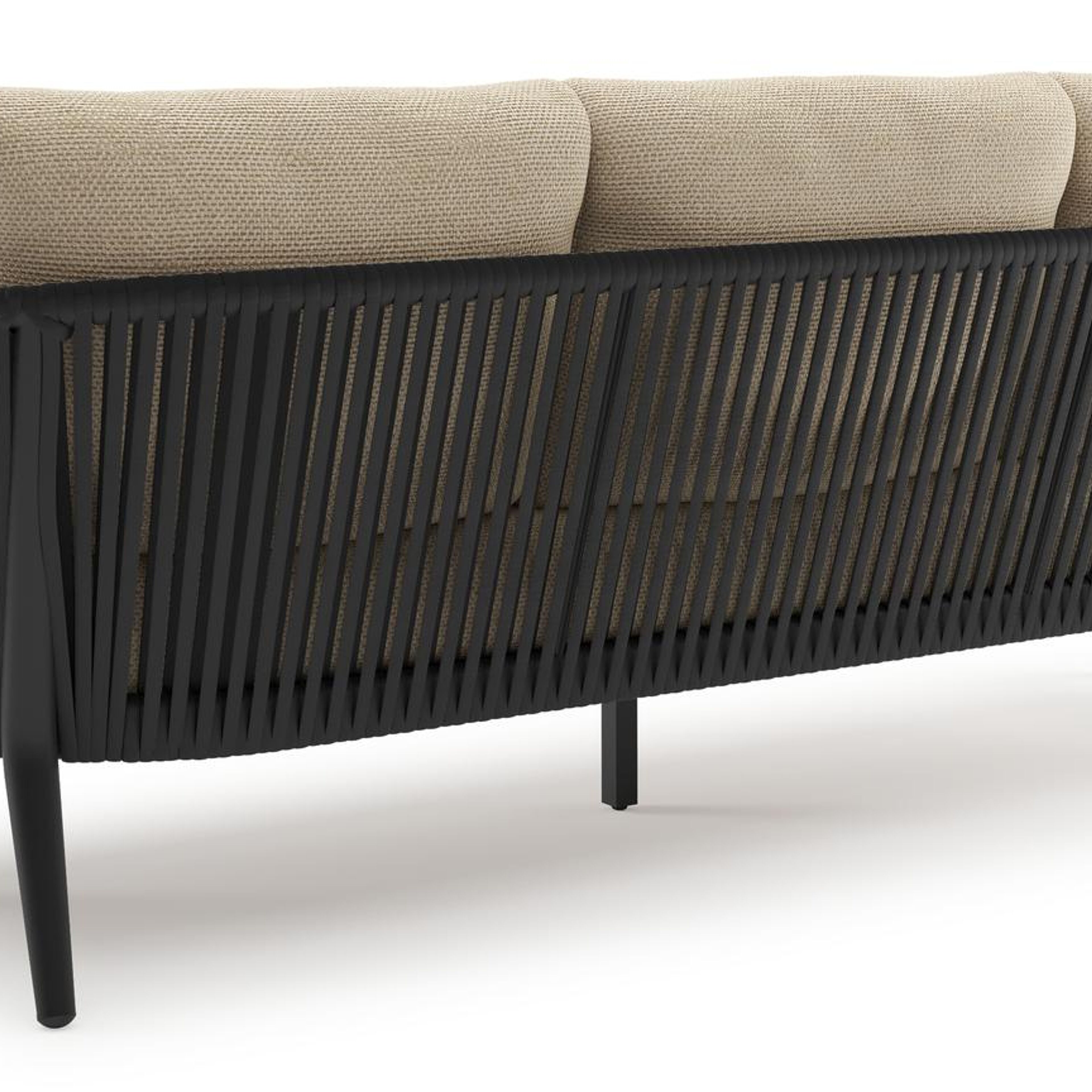 Orso loungebank in zwart aluminium en zwart verticaal geweven ronde rope met Althea Camel all weather cosytica kussen | Exterioo tuinmeubelen